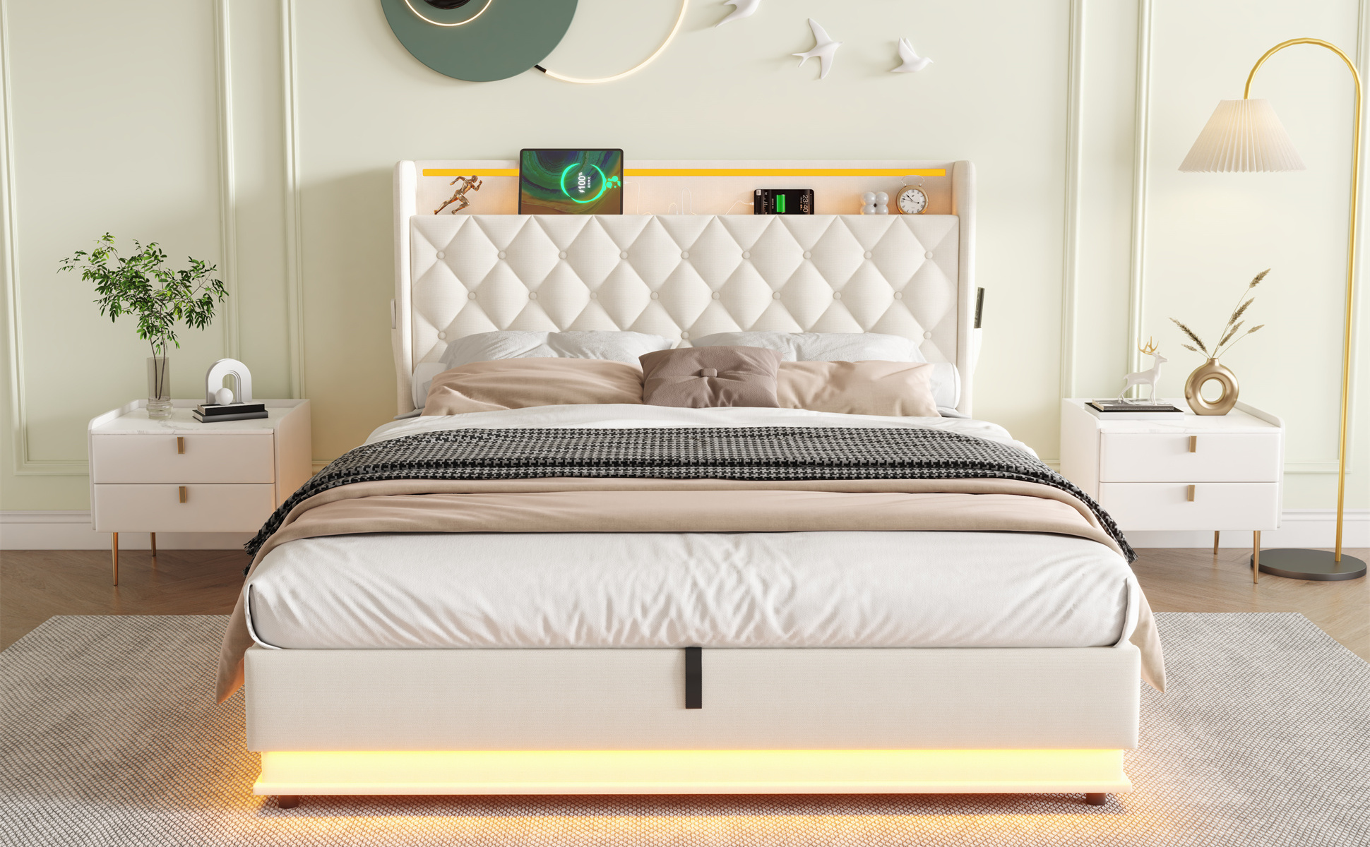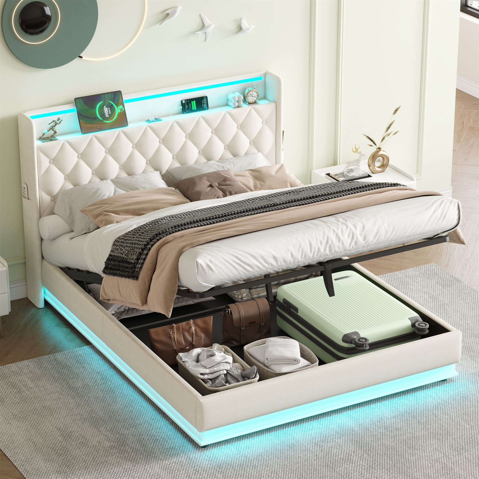 | Special Features | Charging station & RGB LED lighting strip & Hydraulic storage & Headboard storage & Side pockets |