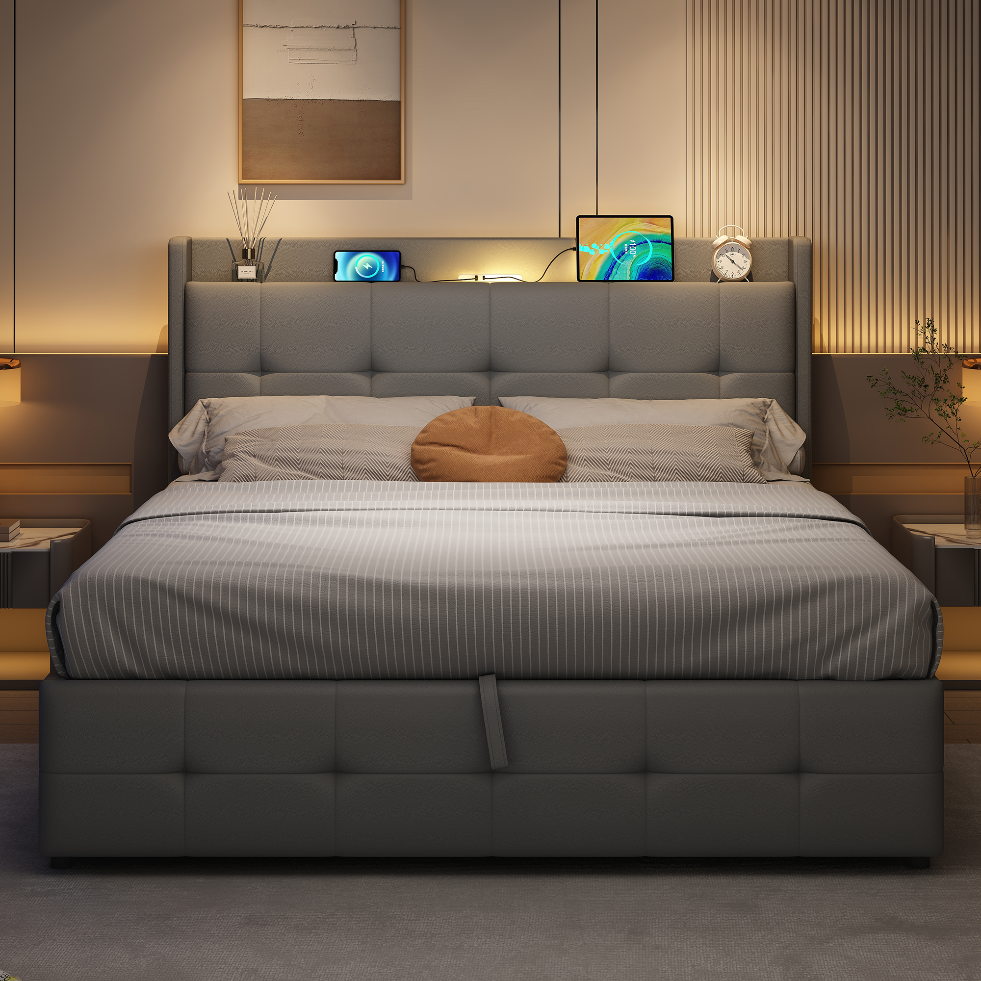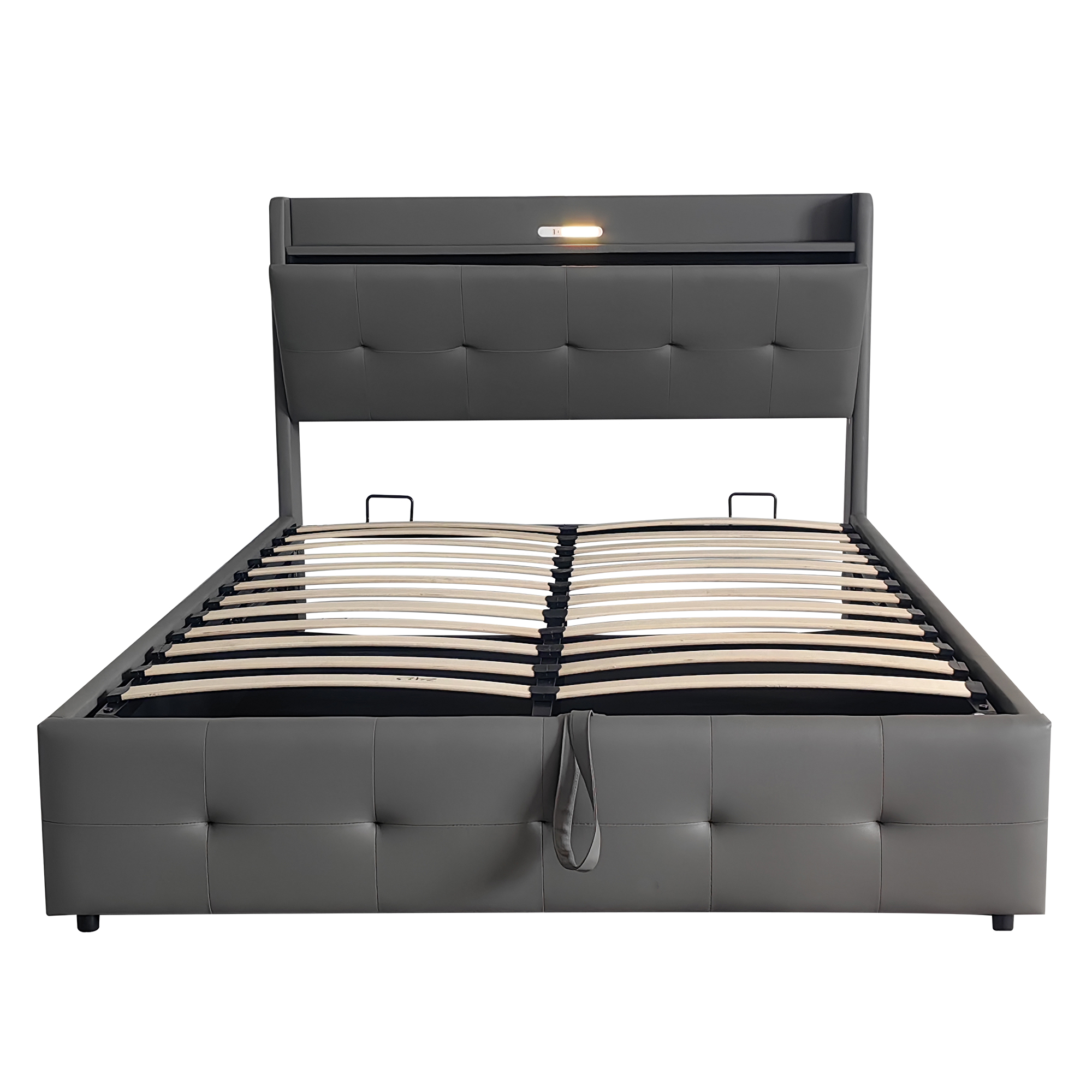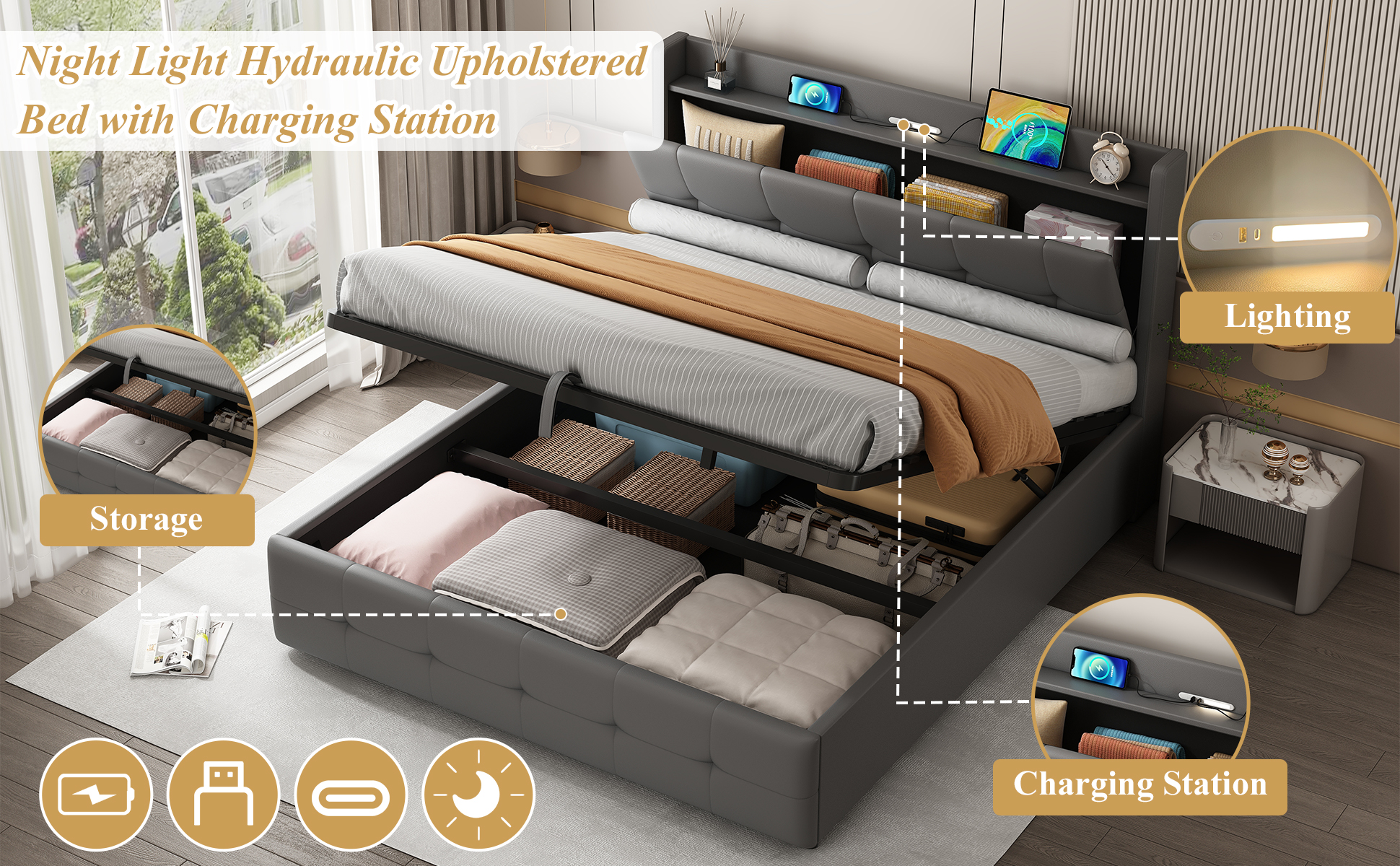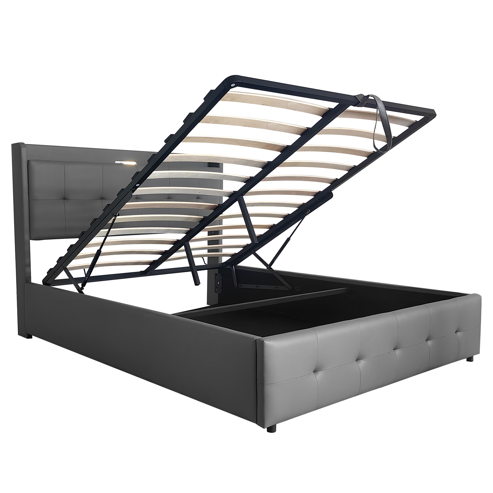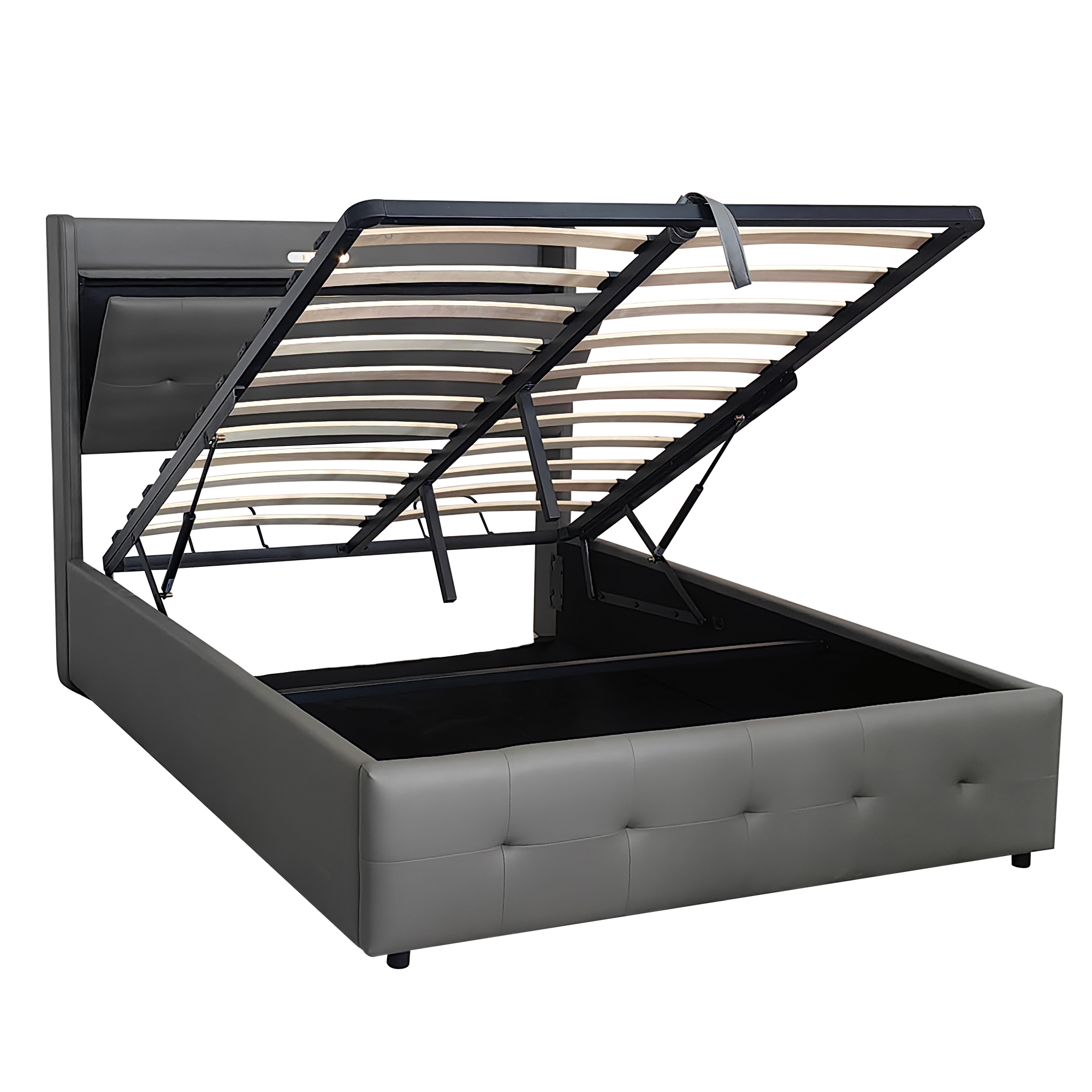 Product Name:5ft King Upholstered Bed Frame with Hydraulic Storage, PU Leather Ottoman Bed with Concealed Headboard Storage, Double Bed with Charging Station and LED Night Light, Grey (No Mattress)