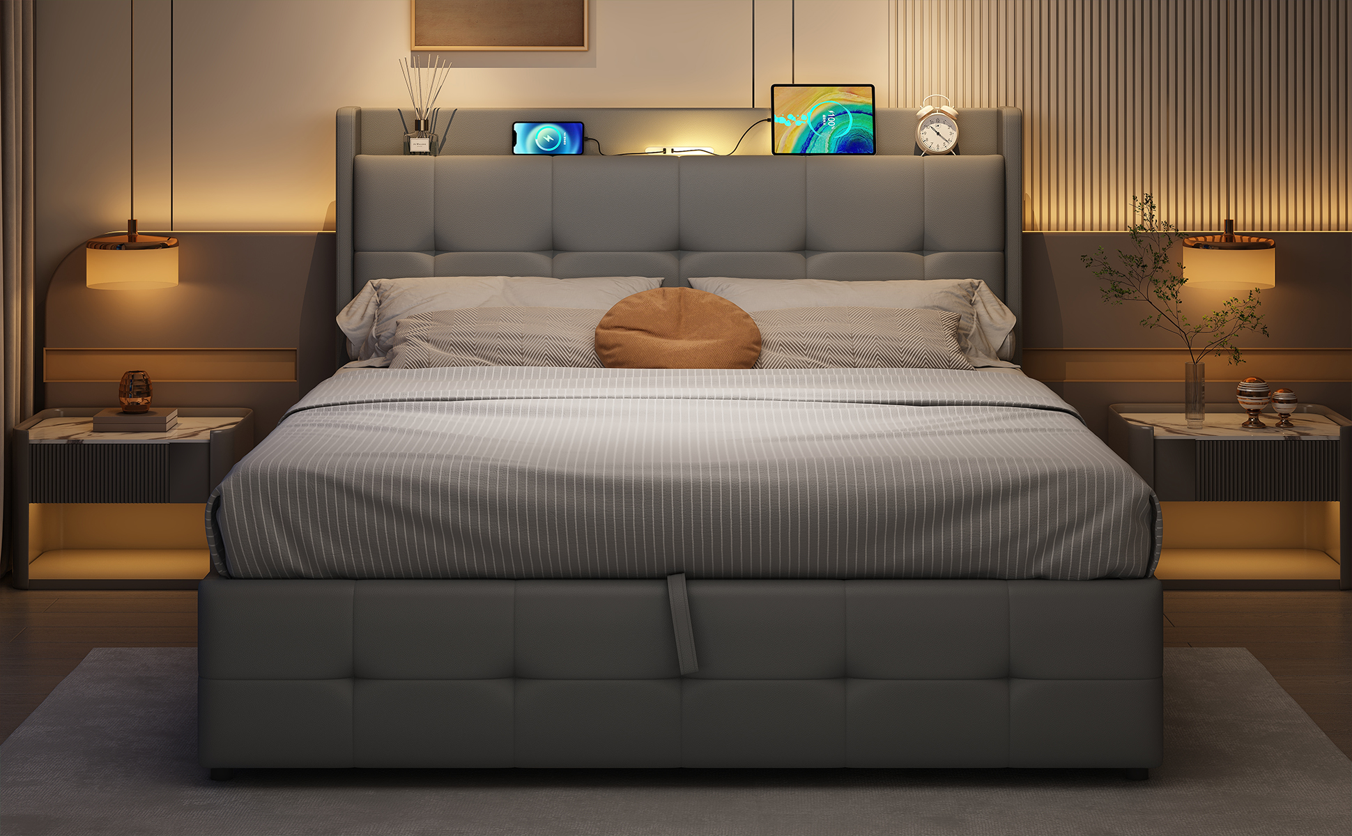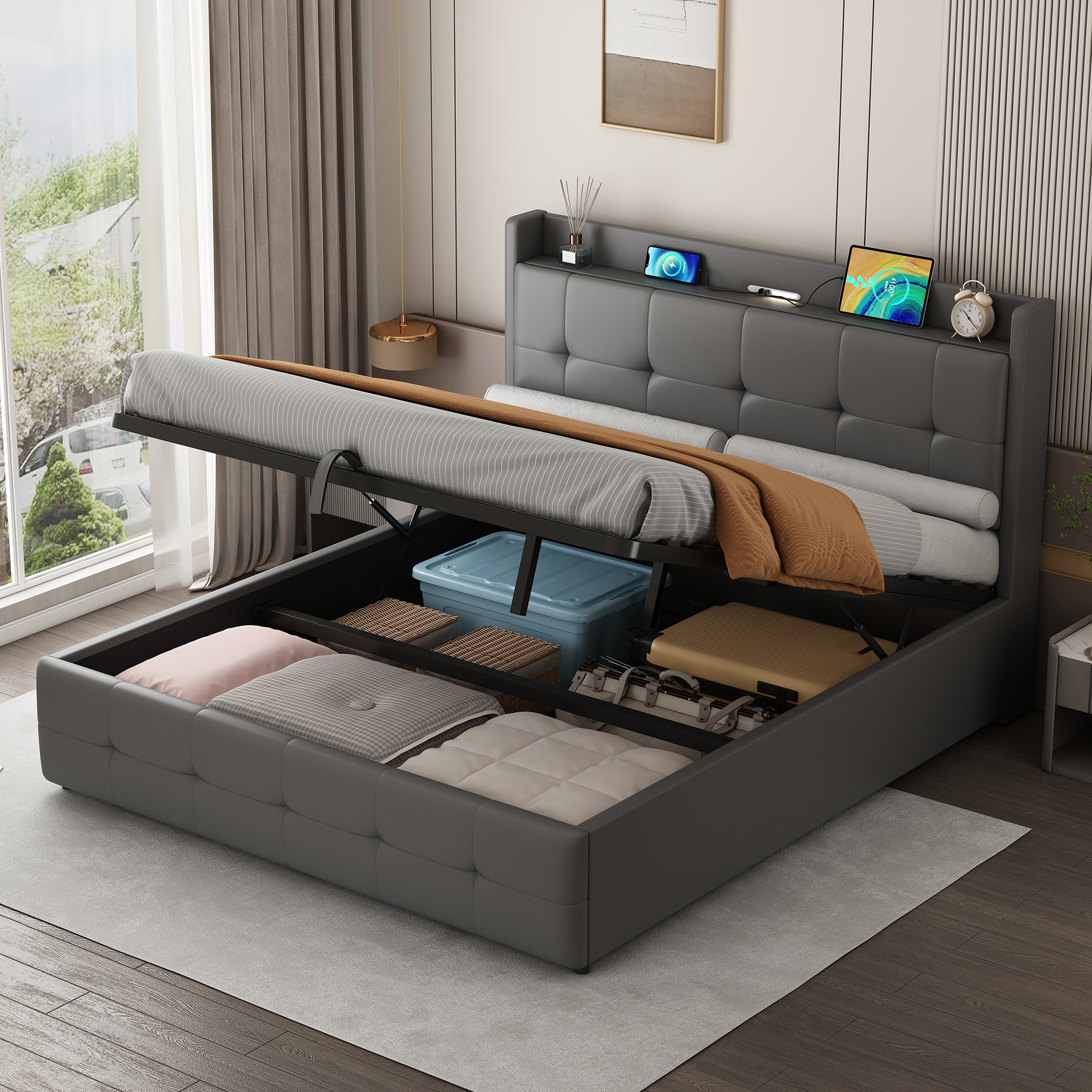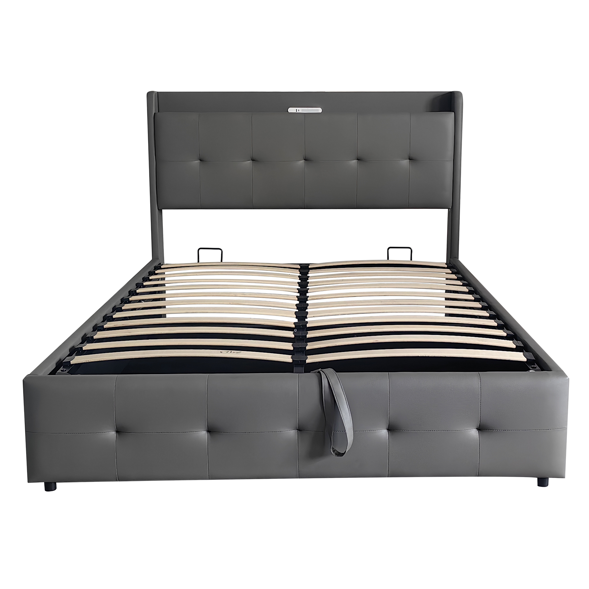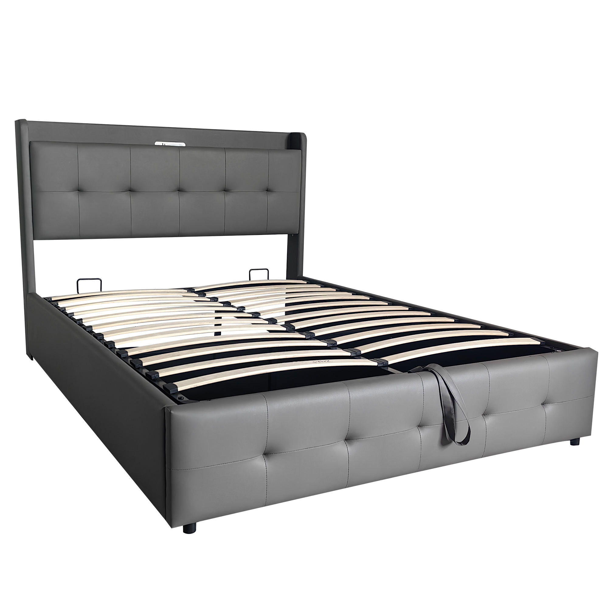 Product Name:5ft King Upholstered Bed Frame with Hydraulic Storage, PU Leather Ottoman Bed with Concealed Headboard Storage, Double Bed with Charging Station and LED Night Light, Grey (No Mattress)