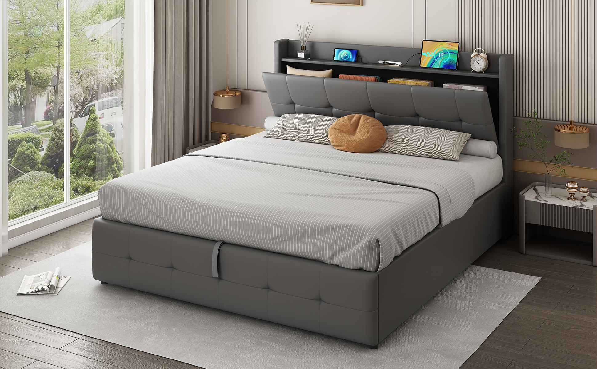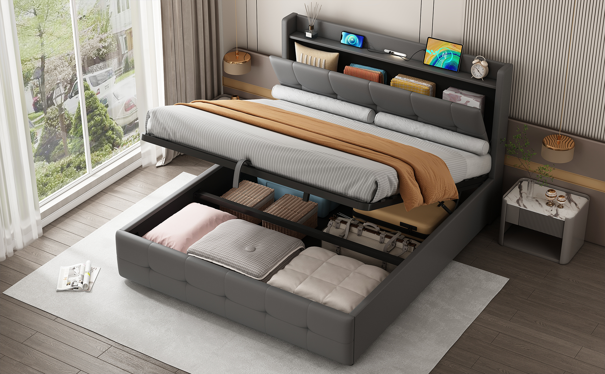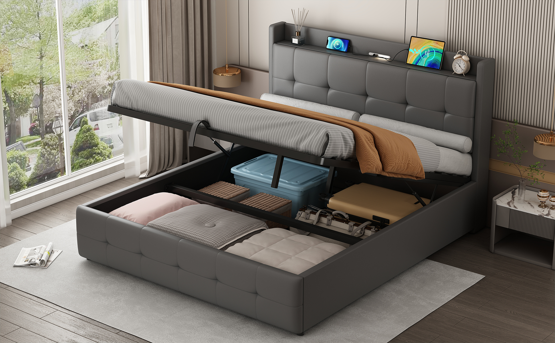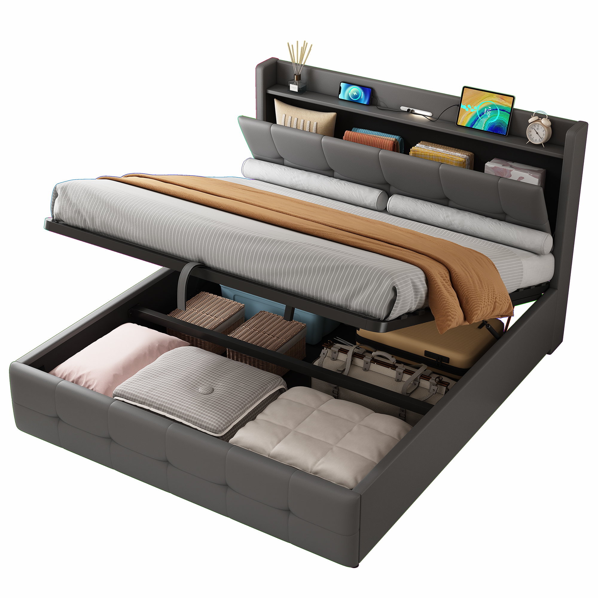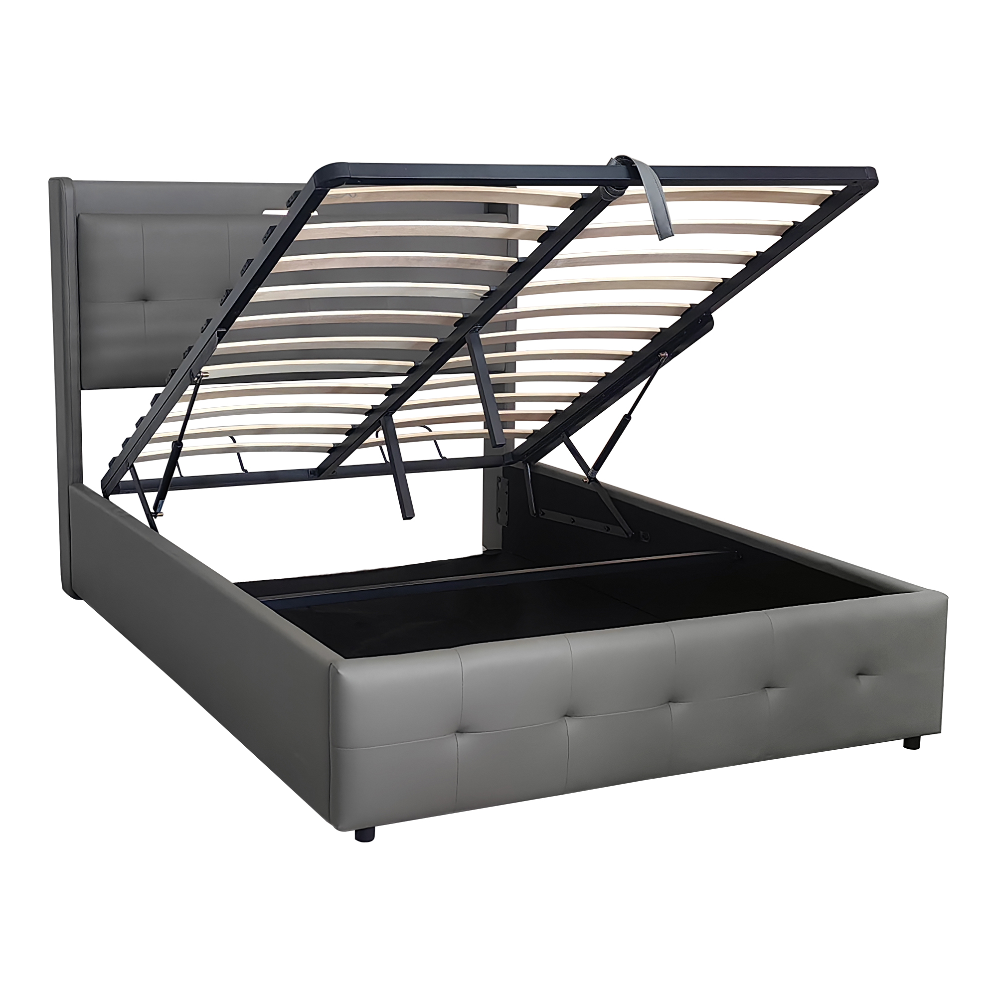 Product Name:5ft King Upholstered Bed Frame with Hydraulic Storage, PU Leather Ottoman Bed with Concealed Headboard Storage, Double Bed with Charging Station and LED Night Light, Grey (No Mattress)