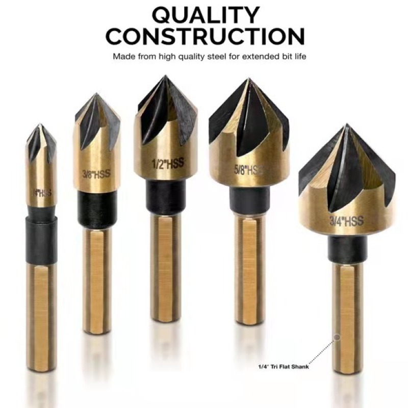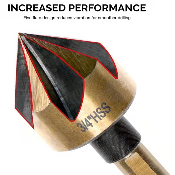Uses: used for countersinking and reverse taper of softer materials such as aluminum parts, iron plates, PV plates, etc. In the process of use, the five cutting edges can better chip removal, and the cutting edge is not easy to become dull!
