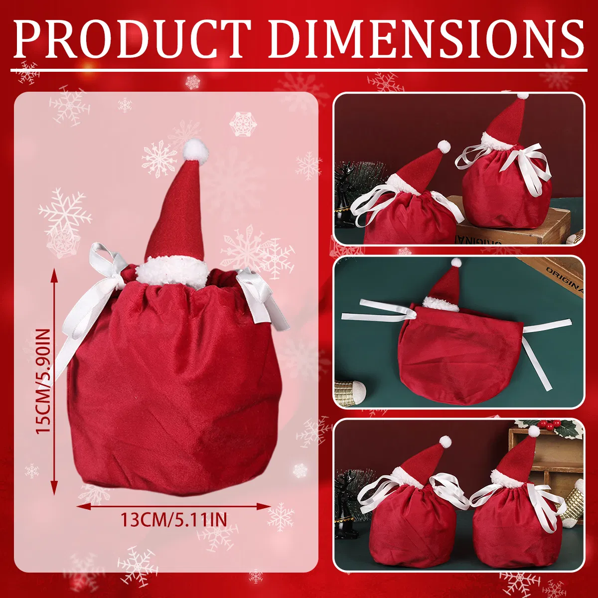 Specifications Material: Polyester Color: Red and White Size: 15*13cm/5.9*5.11inch Package contents: 5Packs Christmas Candy Bags