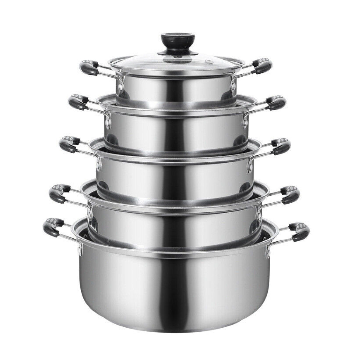 Classically designed 5-piece cooking pot set for all hobs, including induction, ideal as a complement to basic equipment and existing pots and pans.