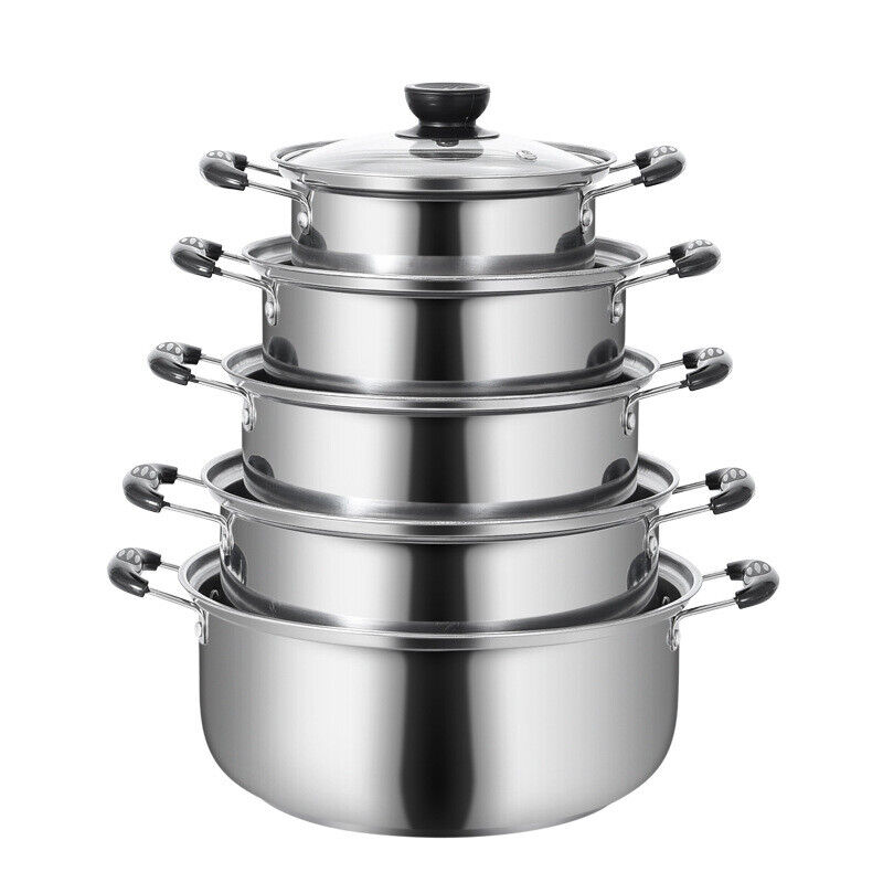 Classically designed 5-piece cooking pot set for all hobs, including induction, ideal as a complement to basic equipment and existing pots and pans.