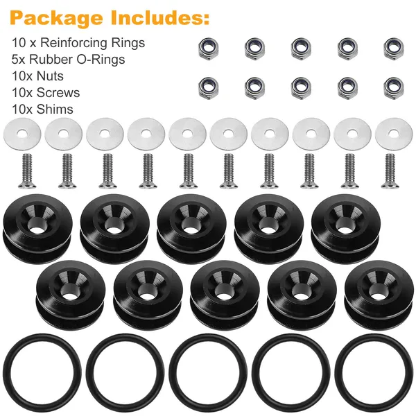**Package Includes*:5 Set car bumper fasteners:10*Reinforcing Rings; 5*Rubber O-Rings; 10*Nuts; 10*Screws; 10*Shims. Friendly Reminder:1 Set includes 2 reinforcing rings; 1 rubber O-ring; 2 nuts; 2 screws and 2 shims.