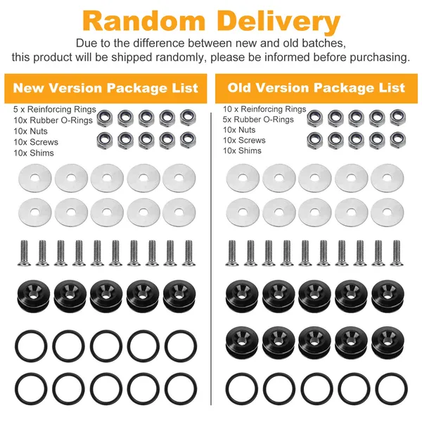 **Package Includes*:5 Set car bumper fasteners:5Pcs/10Pcs*Reinforcing Rings,10Pcs/5Pcs*Rubber O-Rings,10*Nuts,10*Screws,10*Shims. Friendly Reminder:1 Set includes 1Pcs/2Pcs reinforcing rings,2Pcs/1Pcs rubber O-ring,2 nuts,2 screws and 2 shims. **Universal Compatibility*:Fits for all types of cars. It can be quickly connected and disassembled for front and rear bumpers,trunks fenders,hatch lids,hoods,etc. **Aluminum Alloy Materials*:The shims,nuts and screws are made of aluminum alloy,have strong strength and long durability. The rubber O rings are wear-resistant. **Nice-Looking Bumper Fasteners*:The glossy finishing surface can enhance the appearance of your vehicle's engine bay and exterior to make your car stand out from the crowd and create a nice looking. **Dimensions*:Reinforcing Ring:New version:24x10mm/0.94x0.39in(Old Version:13x10mm/0.5x0.4in);O-Ring:New version:55mm/2.17in(Old version:55mm/2.17in);Nuts:10mm/0.4in;Screw:10x19mm/0.4x0.7in;Shim:13mm/0.5in