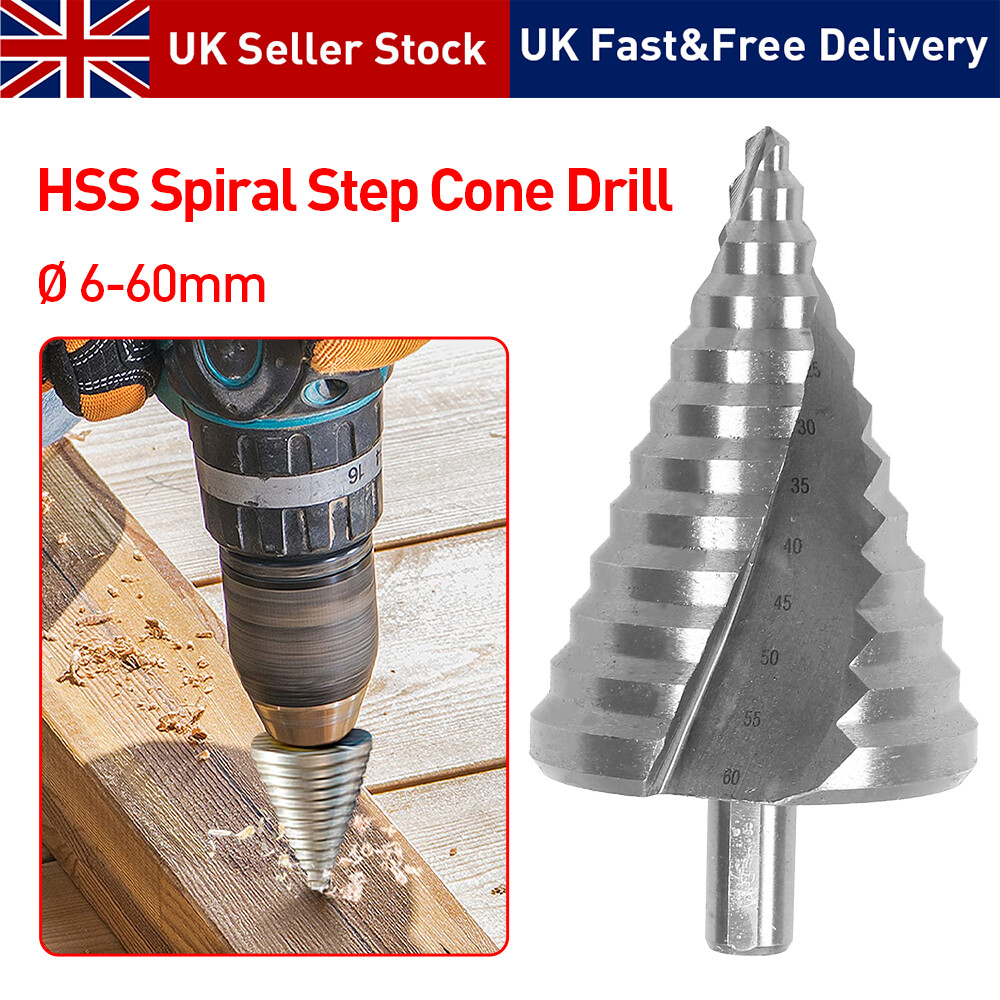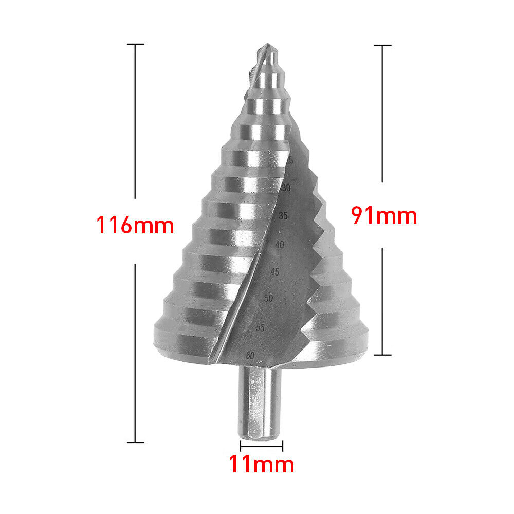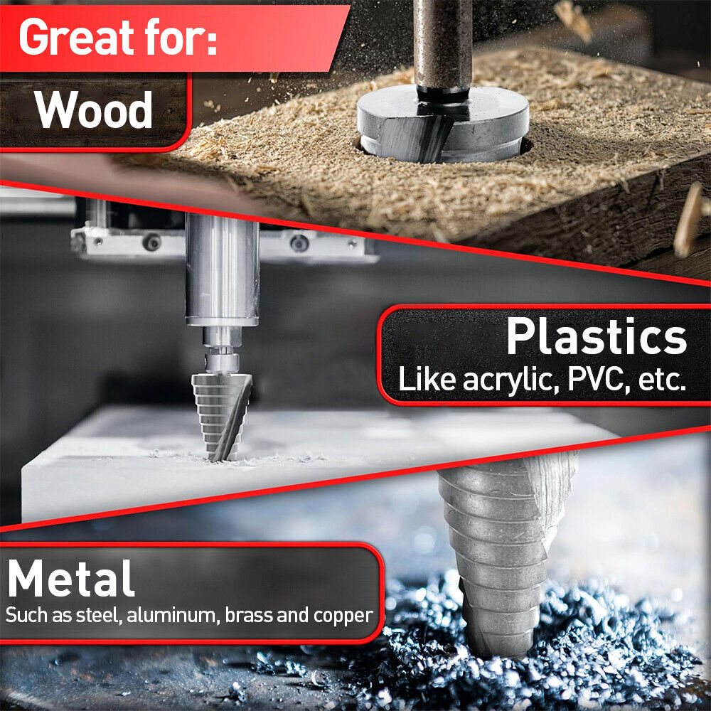 The stepped drill bit build in 12 steps drilling size(6mm, 10mm, 15mm, 20mm, 25mm, 30mm, 35mm, 40mm, 45mm, 50mm, 55mm, 60mm). One-time enlarger holes, no need to replace the drill bit and positioning hole during using.