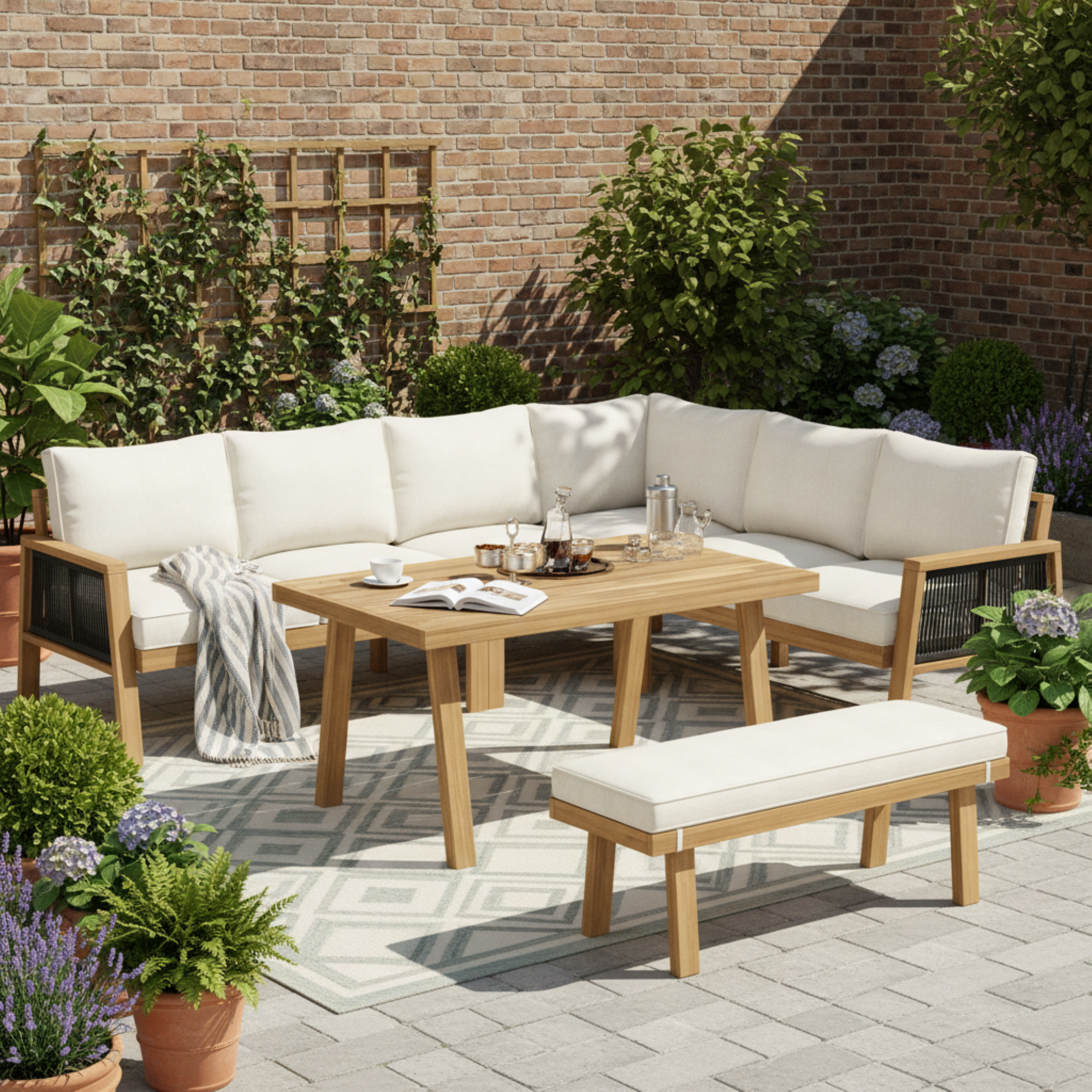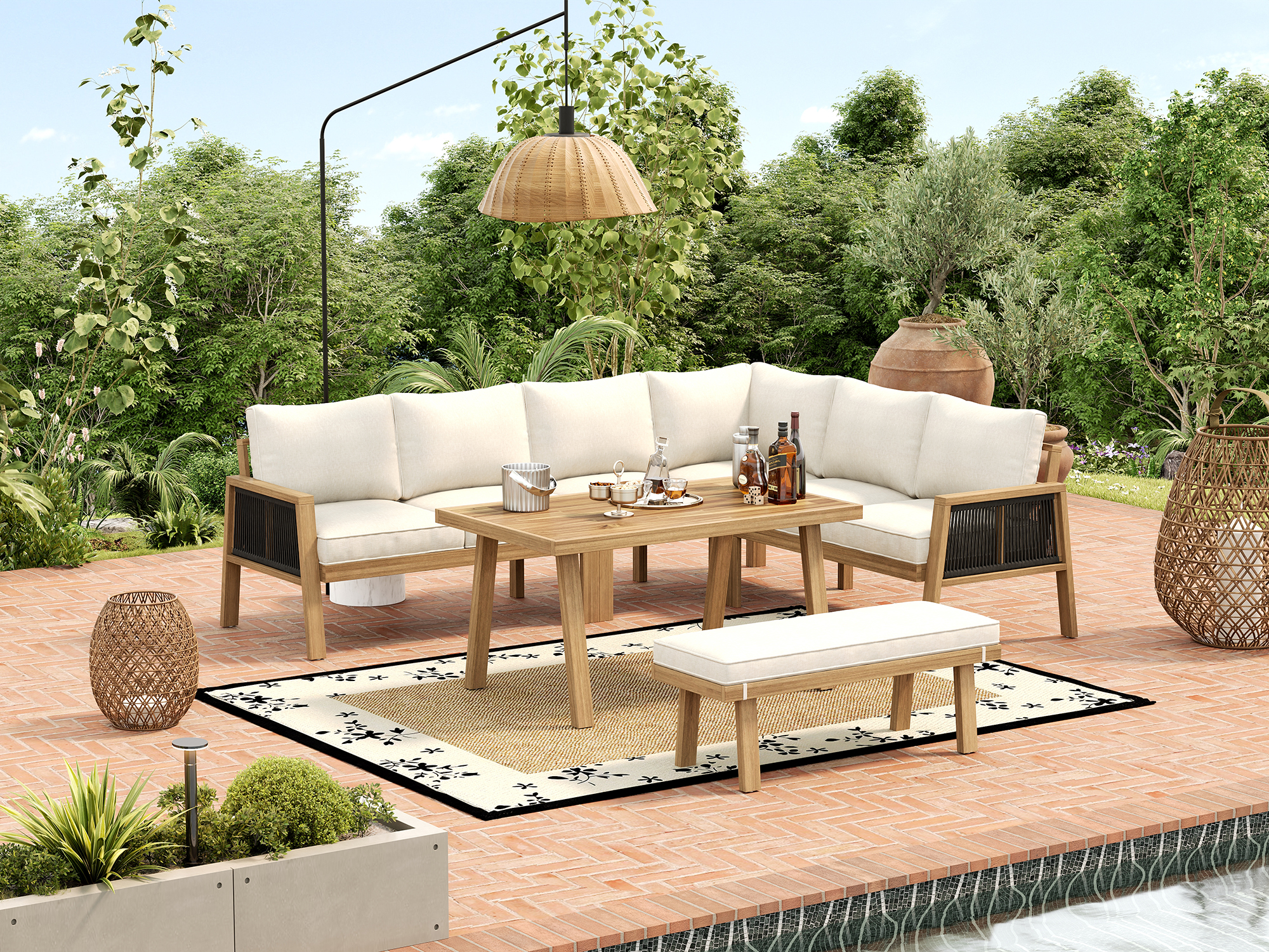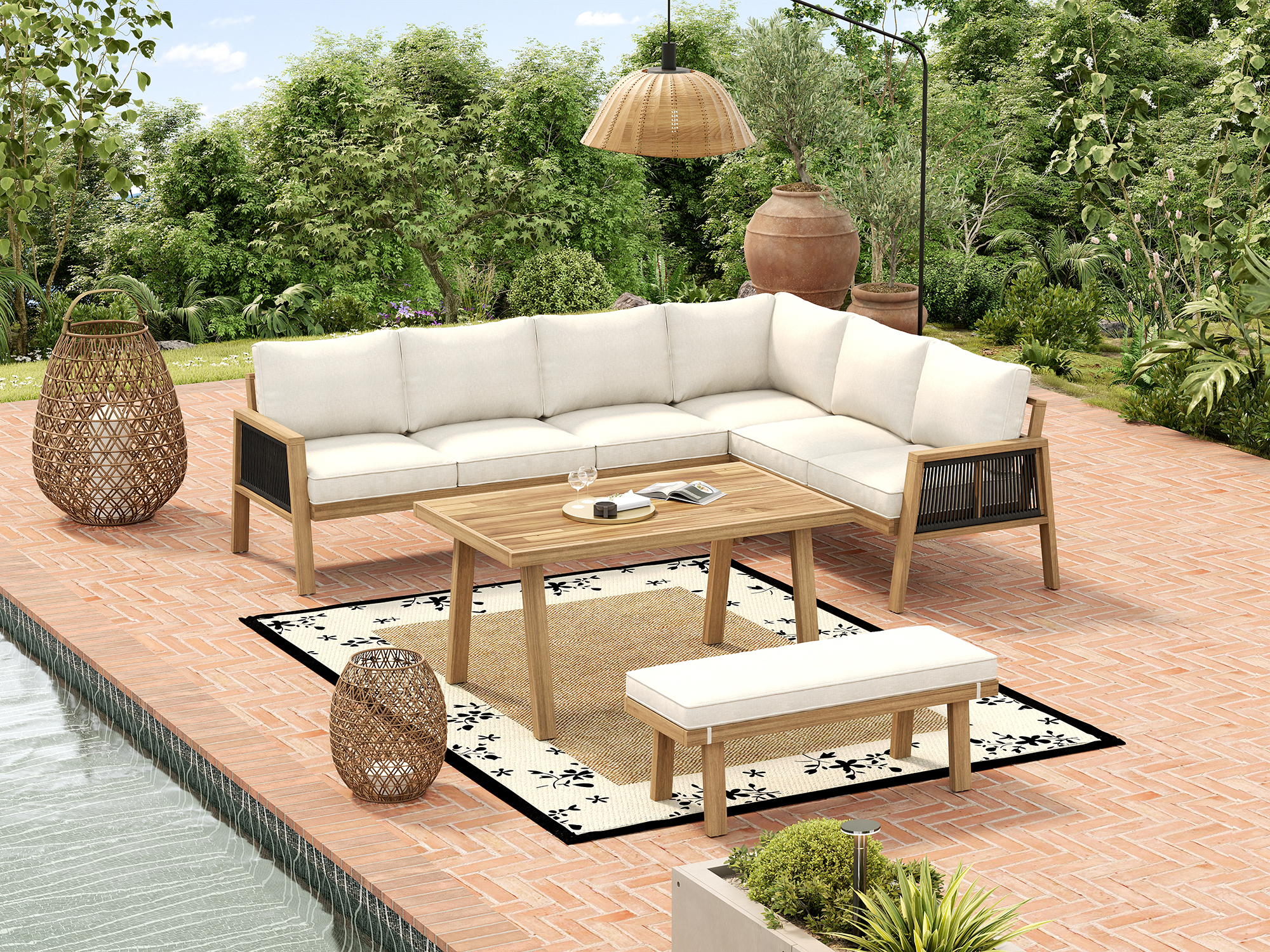 Product Name:6-7 Seater Garden Lounge & Dining Set, Acacia Wood Frame Outdoor Patio Furniture, Corner Sofa + Bench with Rope Braiding, Acacia Wood Tabletop, Includes All Chairs & Backrest Cushions, Natural+ cream