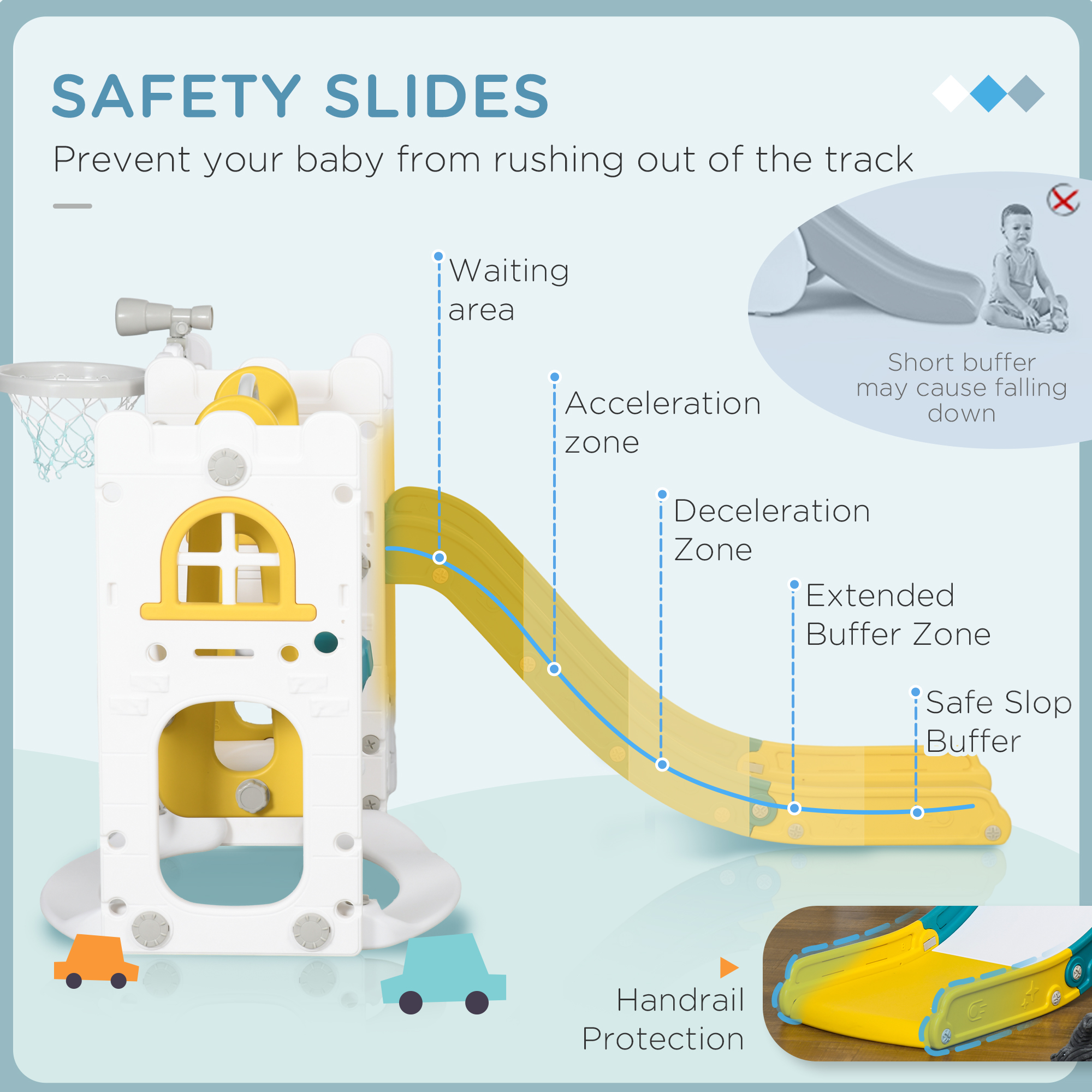 - Safe and Fun Slide: Equipped with a waiting area, acceleration zone, deceleration zone, and an extended buffer for safety, the slide part of this toddler swing and slide set provides an enjoyable and secure playtime experience