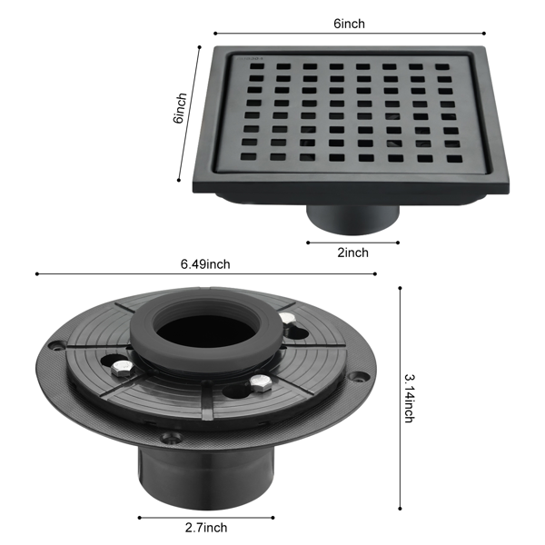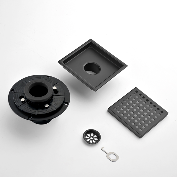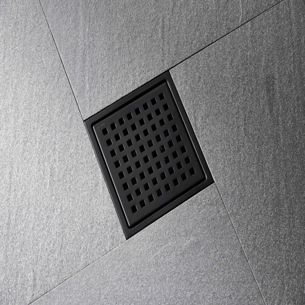 6 Inch Square Shower Drain With Removable Square Patterned Grate, 304 Stainless Steel With Flange And Hair Strainer, Matte Black