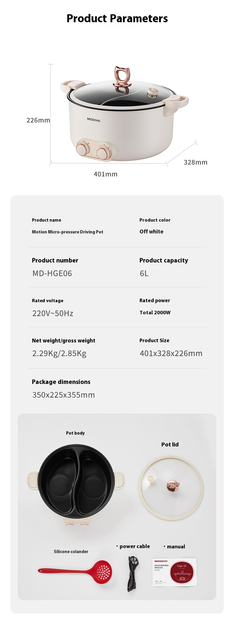 Color: 6 liters micro pressure two-flavor hot pot (MD-HGE06),8 liters micro pressure two-flavor hot pot (MD-HGE08),5 liters two-flavor hot pot (MD-HGE34K ),6 liters micro pressure two-flavor hot pot (MD-HGY01),7 liters micro pressure two-flavor hot pot (MD-HGY03),8 liters micro pressure two-flavor hot pot (MD-HGY05)