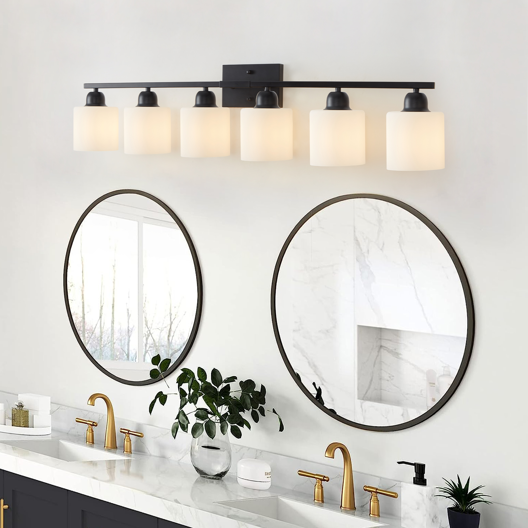 Robust construction:Crafted from metal with a matte black finish, our 6 Light Bathroom Vanity Fixture ensures durability and color fading. It is paired with a Milky White Glass Shade, offering soft and diffused lighting effectHeat-resistant e26 socket:Black bathroom lighting fixtures over mirror dimensions: vanity lights support various bulb types, including Incandescent,LED,and CFL bulbs(bulbs not included). Paired with a dimmable bulb and compatible switch (not included), this wall light provides full dimming functionality, letting you adjust brightness and choose the perfect bulb style to suit your needsWide range of applications: vanity lights for the bathroom offer up or down mounting.It is suitable for various locations such as bathroom mirrors,closets,living rooms,mirror cabinets,dressing tables,porches,and corridorsEasy Installation and Flexibility: Our farmhouse matte black bathroom light fixtures feature a wall-mounted and hardwired design for easy installation, requiring only wire connection and shade assembly