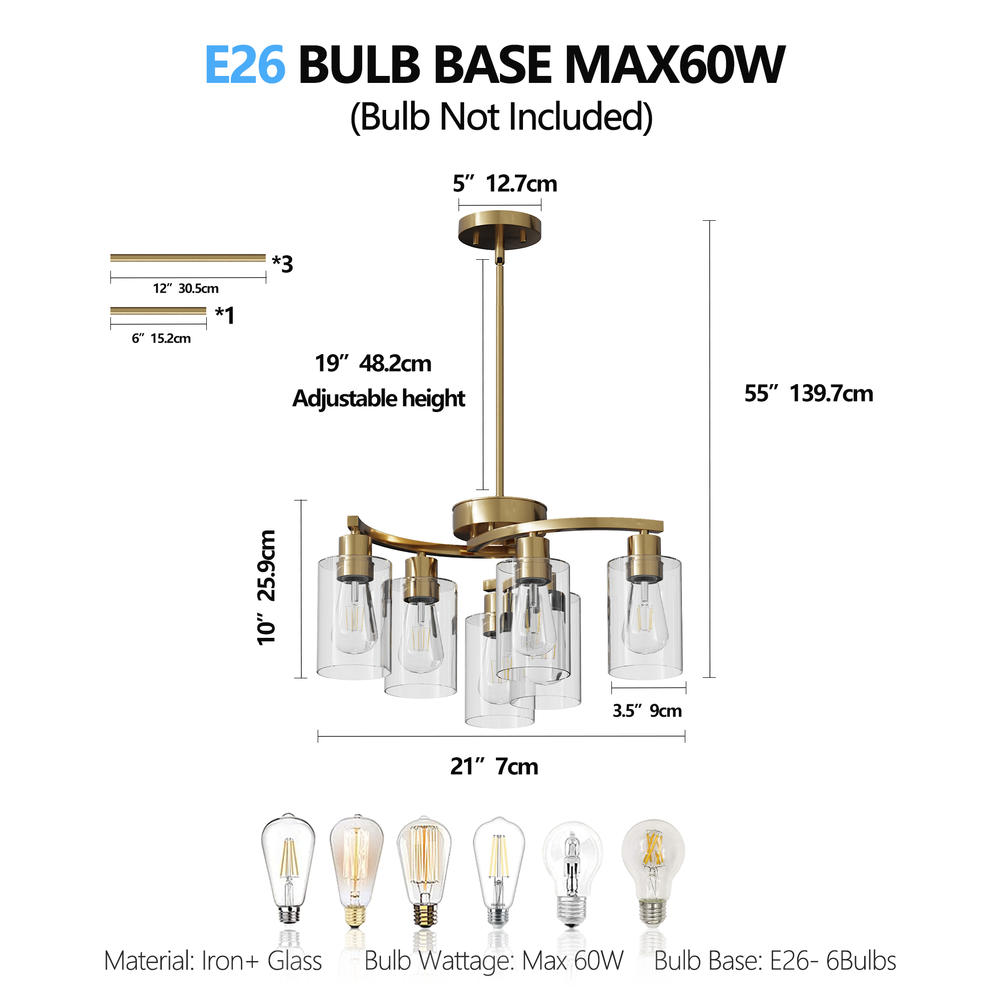 Modern Style: Glass chandelier has 3 arms that radiate outward from the central arc, presenting a simple but not simple beauty. The body of the black light fixture is made of high quality matte black metal with a fine polished surface. The clear glass shade not only ensures the soft scattering of light, but also complements the cold and hard texture of the metal, making the whole modern chandelier both powerful and delicate. The downward-facing glass shade does not easily accumulate dust and isEasy to Install: Dining table chandelier is packed parts by parts, so simple assembly is required. Detailed installation instructions will guide you how to perform quick installation!Height Adjustable: Diameter: 21.7in. Canopy Diameter: 5 in. Comes with two 6" and three 14" rods, so you can flexibly adjust the hanging height of the dining room chandelier. Sloped ceiling adaptable.Dimmable: Max 6 x 60W, E26 Base (bulb not included), compatible with LED, incandescent, CFL, halogen. Dining area light fixtures also compatible with dimmer, you can use a dimmable bulb to create a warm and relaxed atmosphere (Dimmer switch need to buy separately).