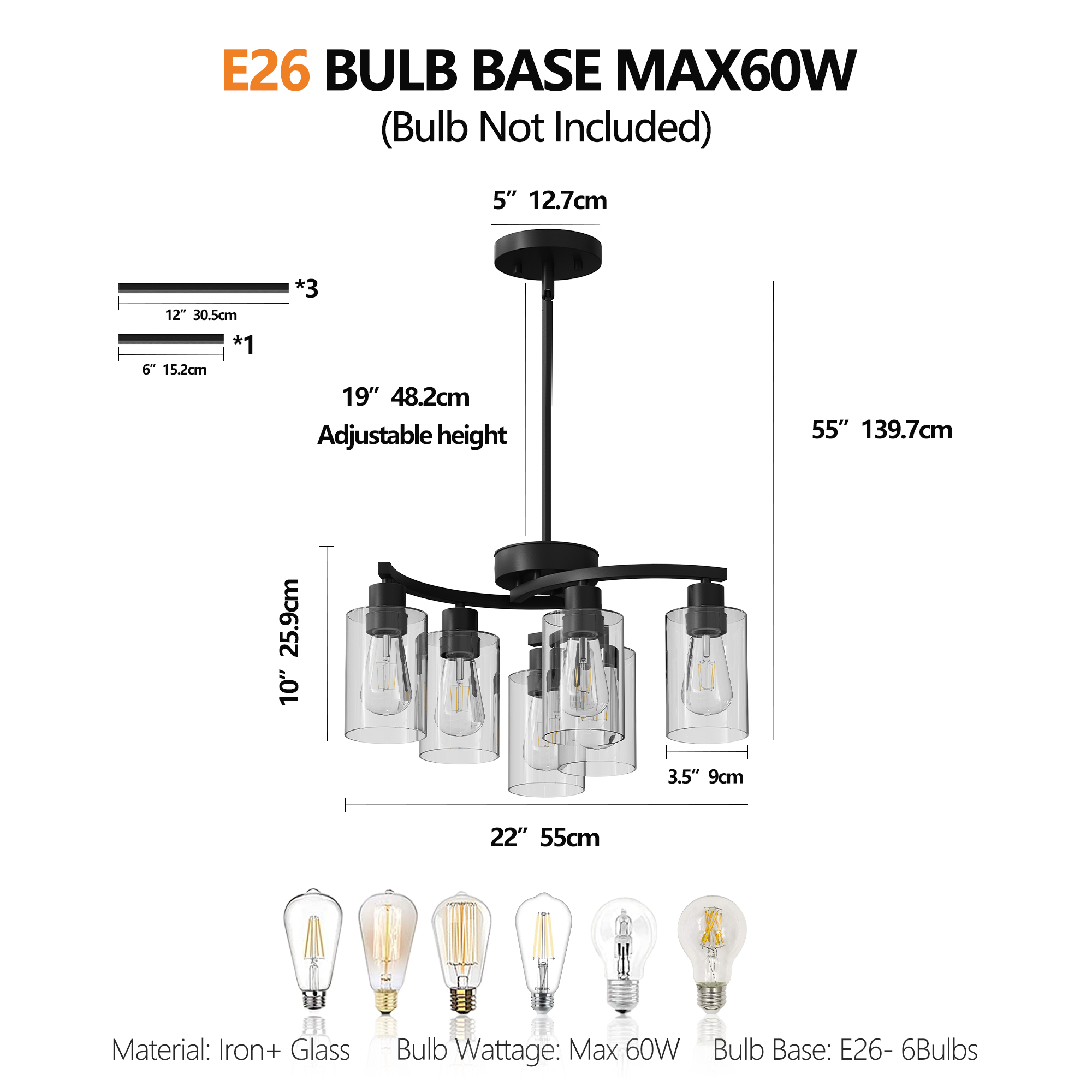 - Dimmable: Max 6 x 60W, E26 Base (bulb not included), compatible with LED, incandescent, CFL, halogen. Dining area light fixtures also compatible with dimmer, you can use a dimmable bulb to create a warm and relaxed atmosphere (Dimmer switch need to buy separately).
