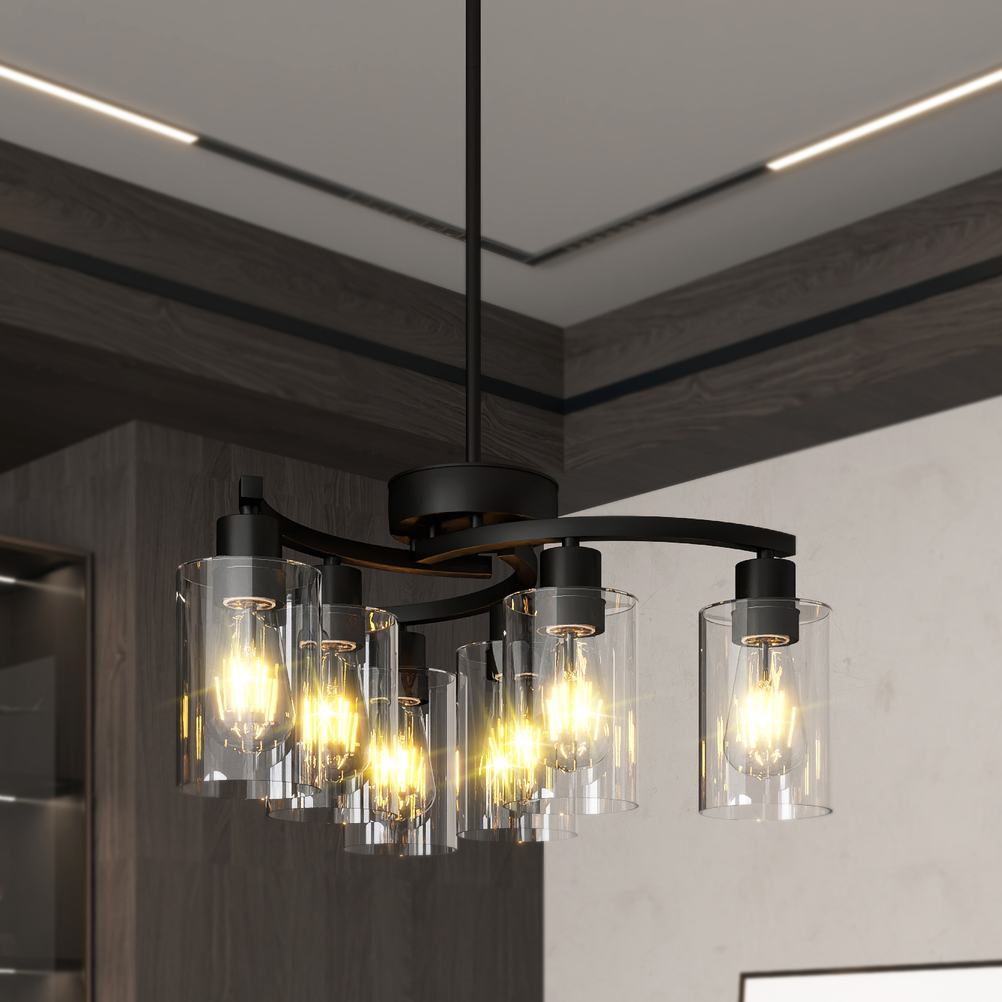 Modern Style: Glass chandelier has 3 arms that radiate outward from the central arc, presenting a simple but not simple beauty. The body of the black light fixture is made of high quality matte black metal with a fine polished surface. The clear glass shade not only ensures the soft scattering of light, but also complements the cold and hard texture of the metal, making the whole modern chandelier both powerful and delicate. The downward-facing glass shade does not easily accumulate dust and isEasy to Install: Dining table chandelier is packed parts by parts, so simple assembly is required. Detailed installation instructions will guide you how to perform quick installation!Height Adjustable: Diameter: 21.7in. Canopy Diameter: 5 in. Comes with two 6" and three 14" rods, so you can flexibly adjust the hanging height of the dining room chandelier. Sloped ceiling adaptable.Dimmable: Max 6 x 60W, E26 Base (bulb not included), compatible with LED, incandescent, CFL, halogen. Dining area light fixtures also compatible with dimmer, you can use a dimmable bulb to create a warm and relaxed atmosphere (Dimmer switch need to buy separately).