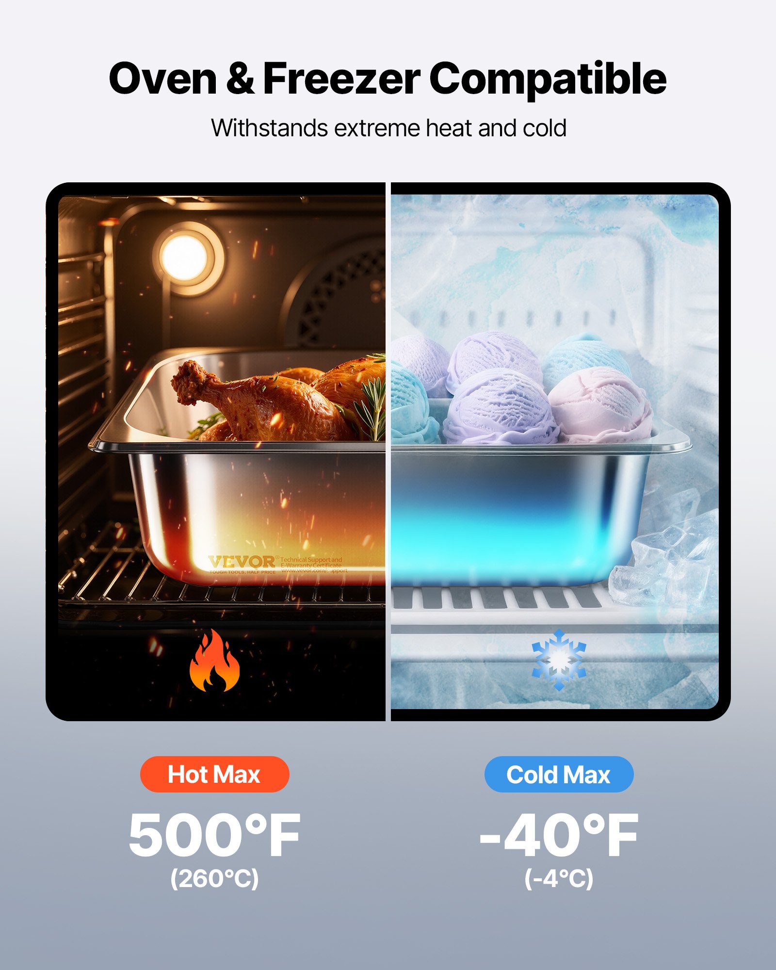 Commercial-Grade Stainless Steel: Our Stainless Steel Hotel Pan is crafted from commercial-grade 22-gauge SS201 stainless steel for long-lasting durability and excellent rust resistance. It’s ideal for holding both hot and cold foods and withstands temperatures from -40℉ to 500℉ (-4℃ to 260℃). Suitable for high-temp commercial dishwashers, refrigerators, freezers, and more