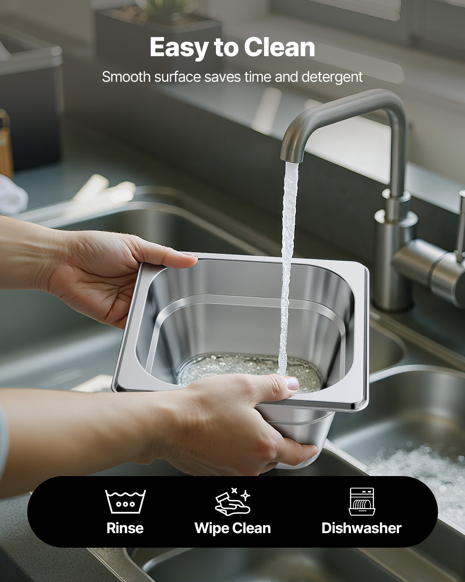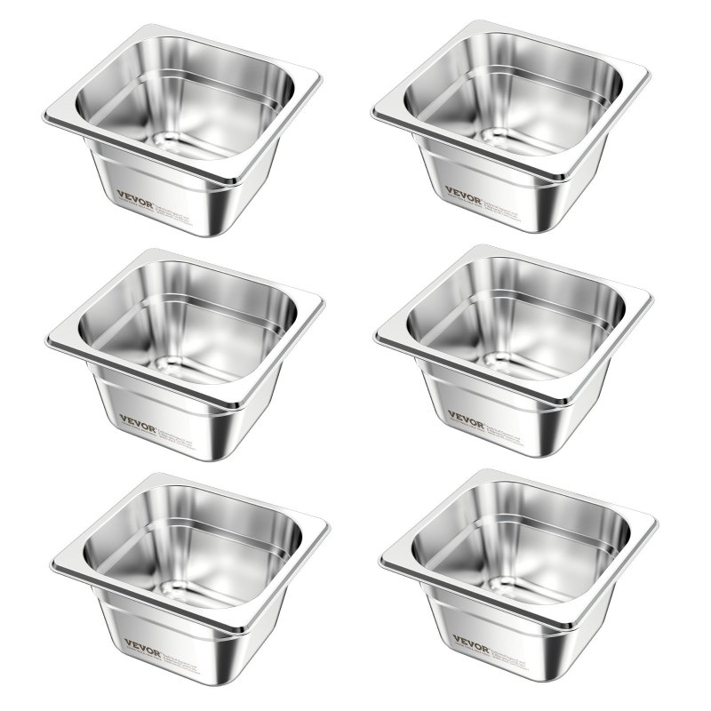 Features & Details Commercial-Grade Stainless Steel: Our Stainless Steel Hotel Pan is crafted from commercial-grade 22-gauge SS201 stainless steel for long-lasting durability and excellent rust resistance. It’s ideal for holding both hot and cold foods and withstands temperatures from -40℉ to 500℉ (-4℃ to 260℃). Suitable for high-temp commercial dishwashers, refrigerators, freezers, and more Ample Food Capacity: This 1/6 size Stainless Steel Hotel Pans set (4 inch deep, 6-pack) features a capacity of 1.7 L / 6.8 Qt, meeting your everyday cooking needs. Ideal for cooking, storing, and serving food, it's great for holding meat, vegetables, fruits, ice cream, and more Smooth Edges: This Stainless Steel Restaurant Pan features a seamless, one-piece construction with smooth edges that won't scratch your hands during use or cleaning. The matte electrolytic finish adds a modern, professional look—great for catering, buffet lines, and commercial kitchens Thoughtful Design: This Stainless Steel Food Pan features unique anti-sticking stacking lugs that enhance structural strength. It offers greater durability and makes stacking and storage more convenient with easy separation Easy to Clean: This steam table pan features a smooth surface and large capacity, making it easy to clean and practical for daily use. Wipe it with detergent and a cloth, or simply place it in the dishwasher for added convenience