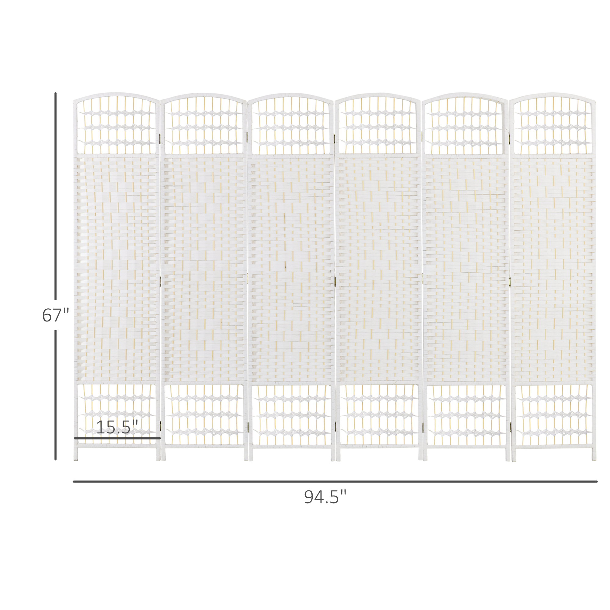 - Panel Room Divider Information: Overall Dimensions: 94.5" L x 0.5" D x 67" H. Folded Dimension: 15.5" W x 2.25" D x 67" H. Ready to use when out of the box, no assembly required.