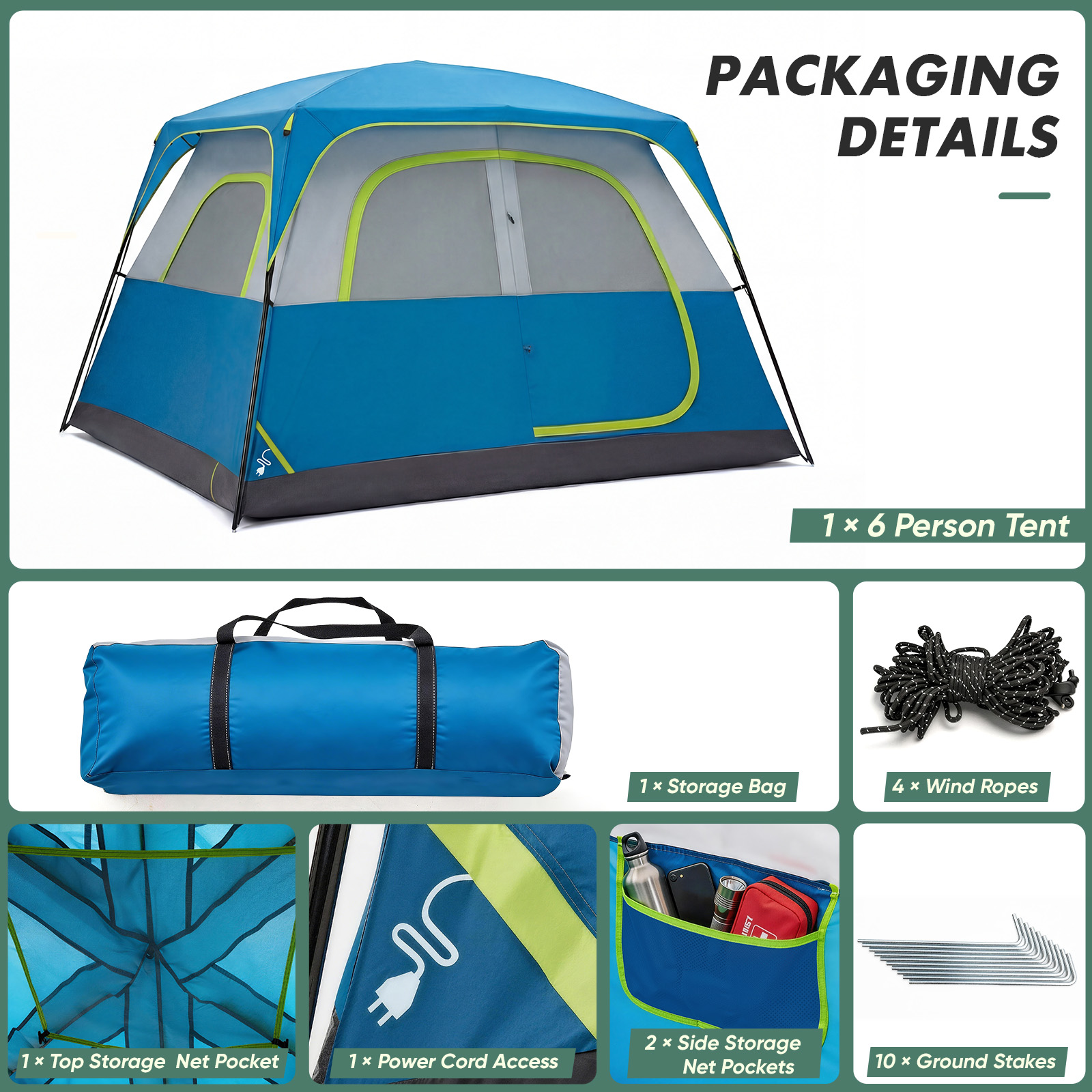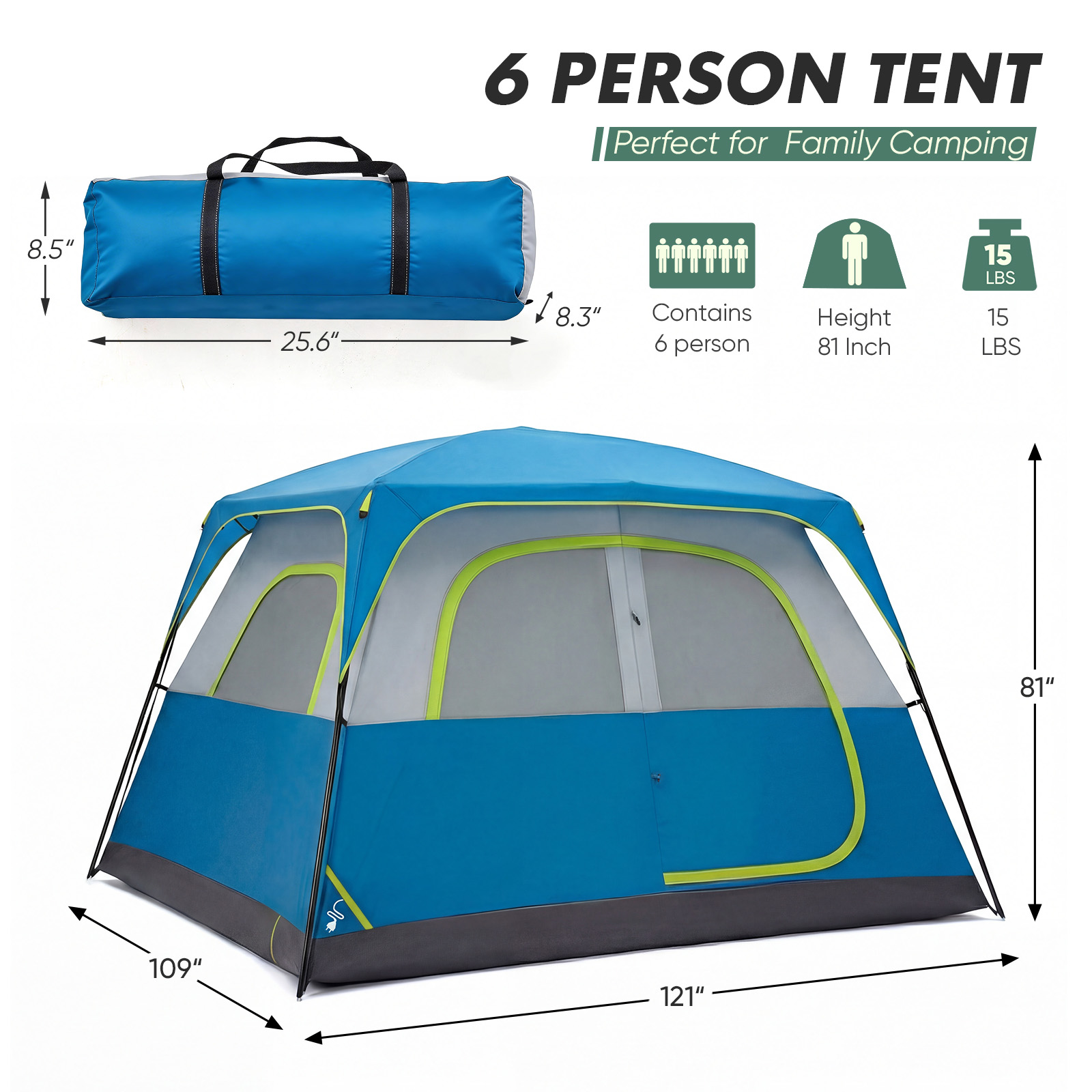 6-person spacious space, flexible movement. The cabin-style spacious design can comfortably accommodate 6 people. It can hold sleeping bags or two sets of full-size inflatable mattresses. The internal height is sufficient, and most campers won't feel crowded even standing. The activity space is abundant.