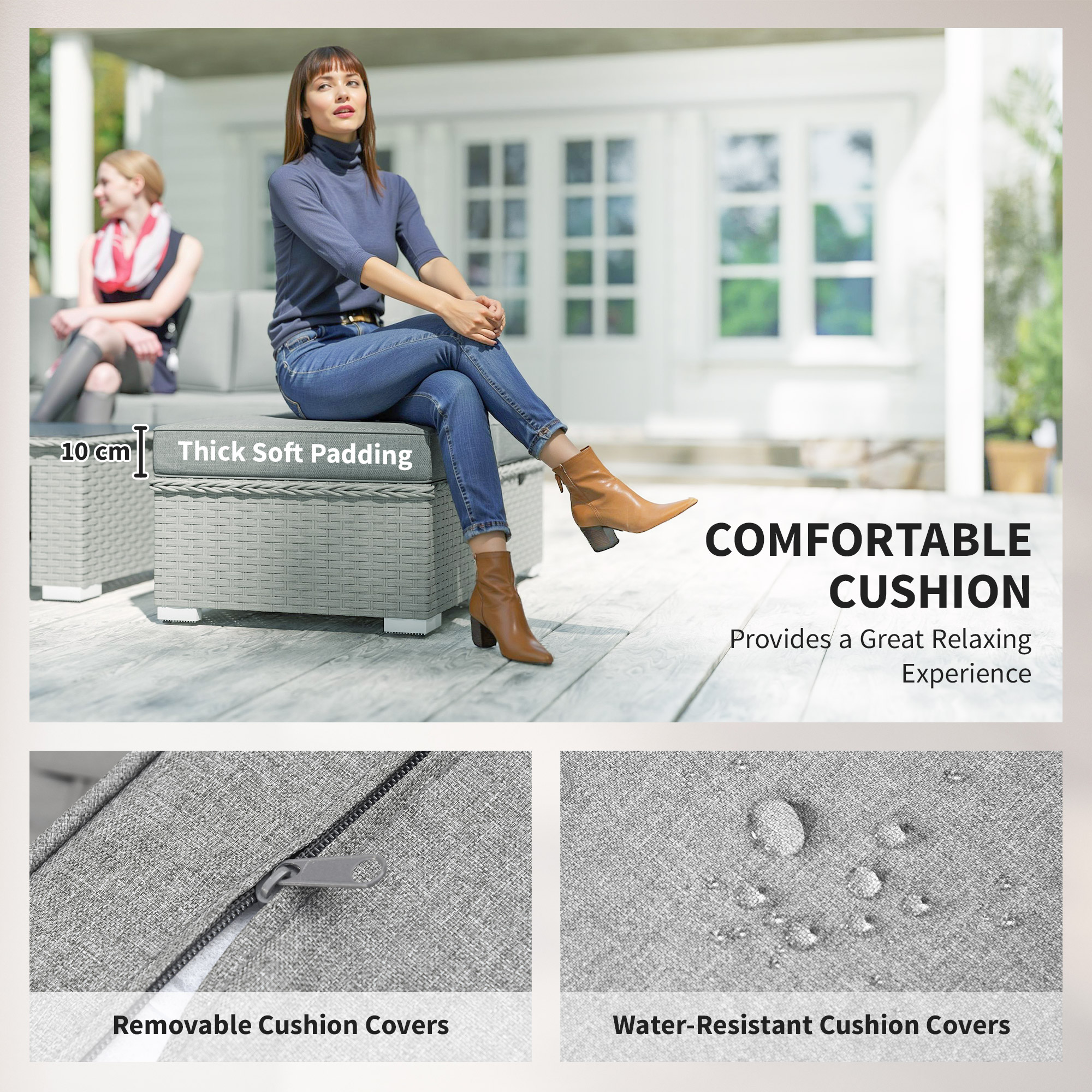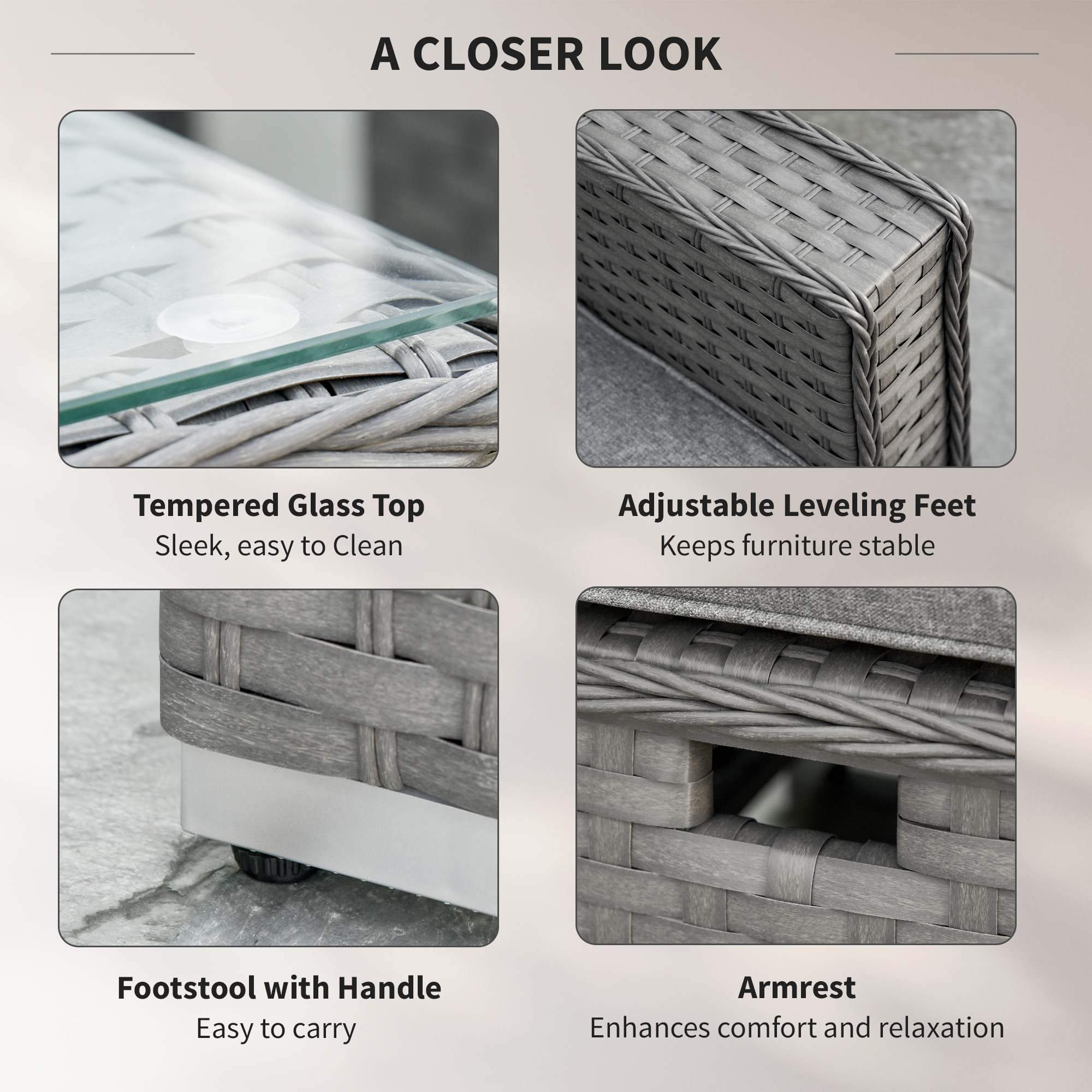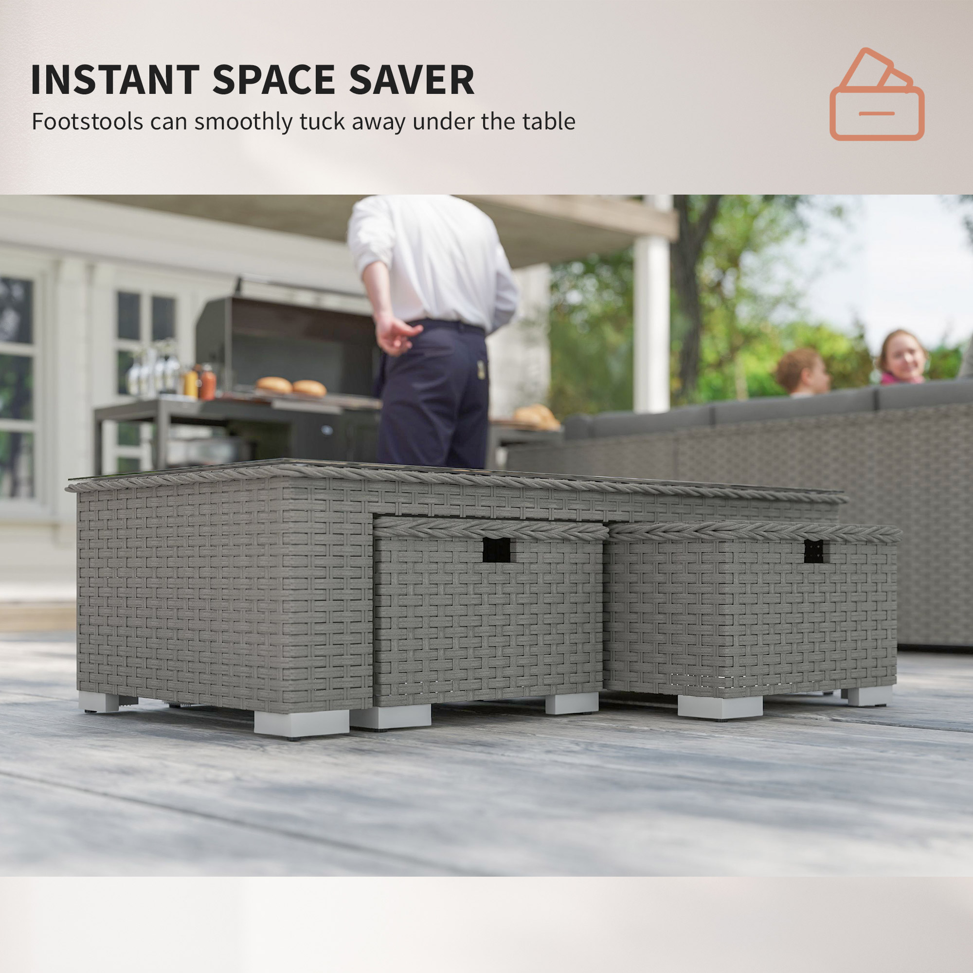 Bring comfort to your outdoor times with this garden rattan furniture sets. Formed of three double corner sofas, a long coffee table and two footstools. Aluminium makes the frame of the rattan garden furniture for a strong structure, wrapped in UV and fade resistant PE rattan, so each piece of the conservatory furniture is durable and suitable for outdoor use. Each piece of the garden furniture sets finished with cushion s for comfort.