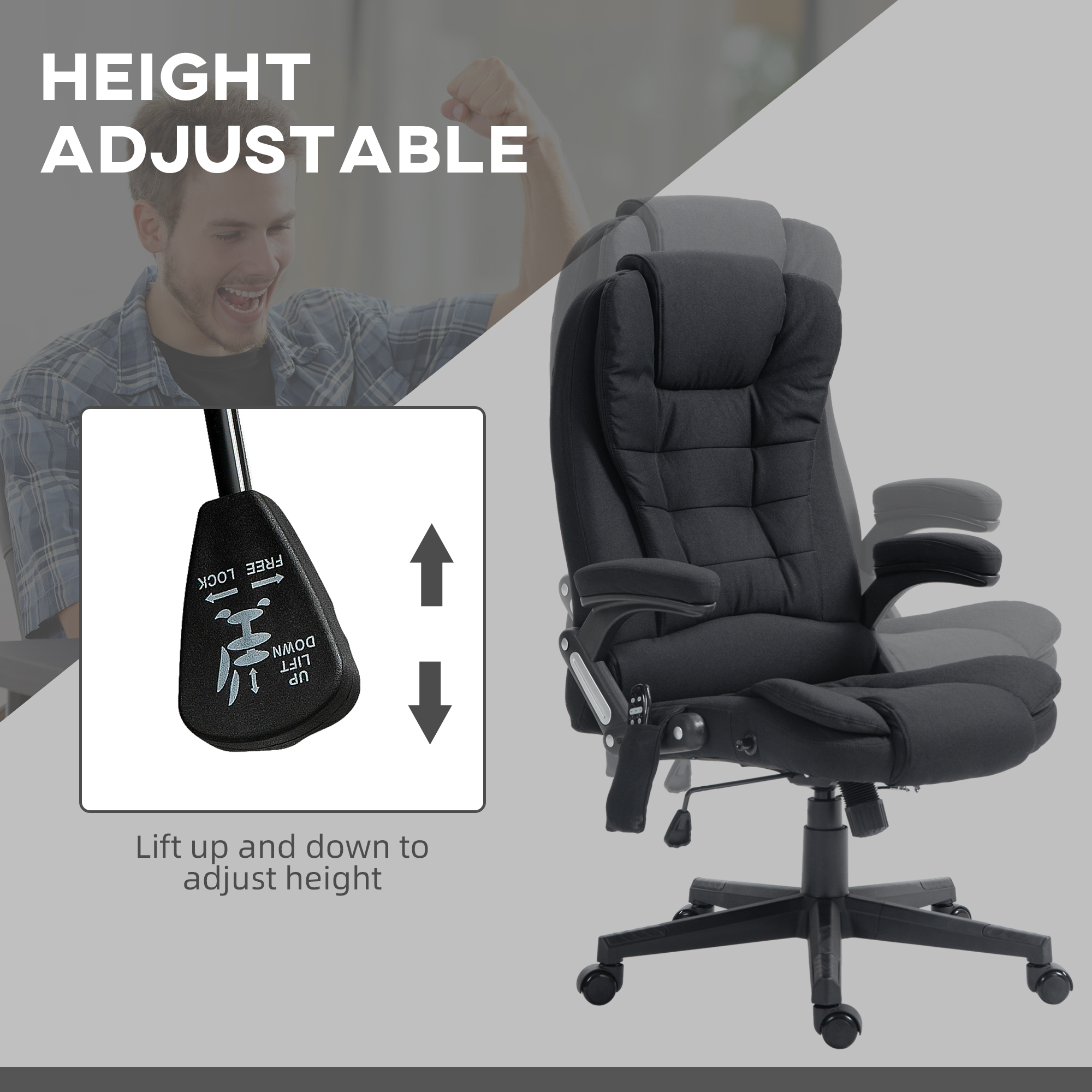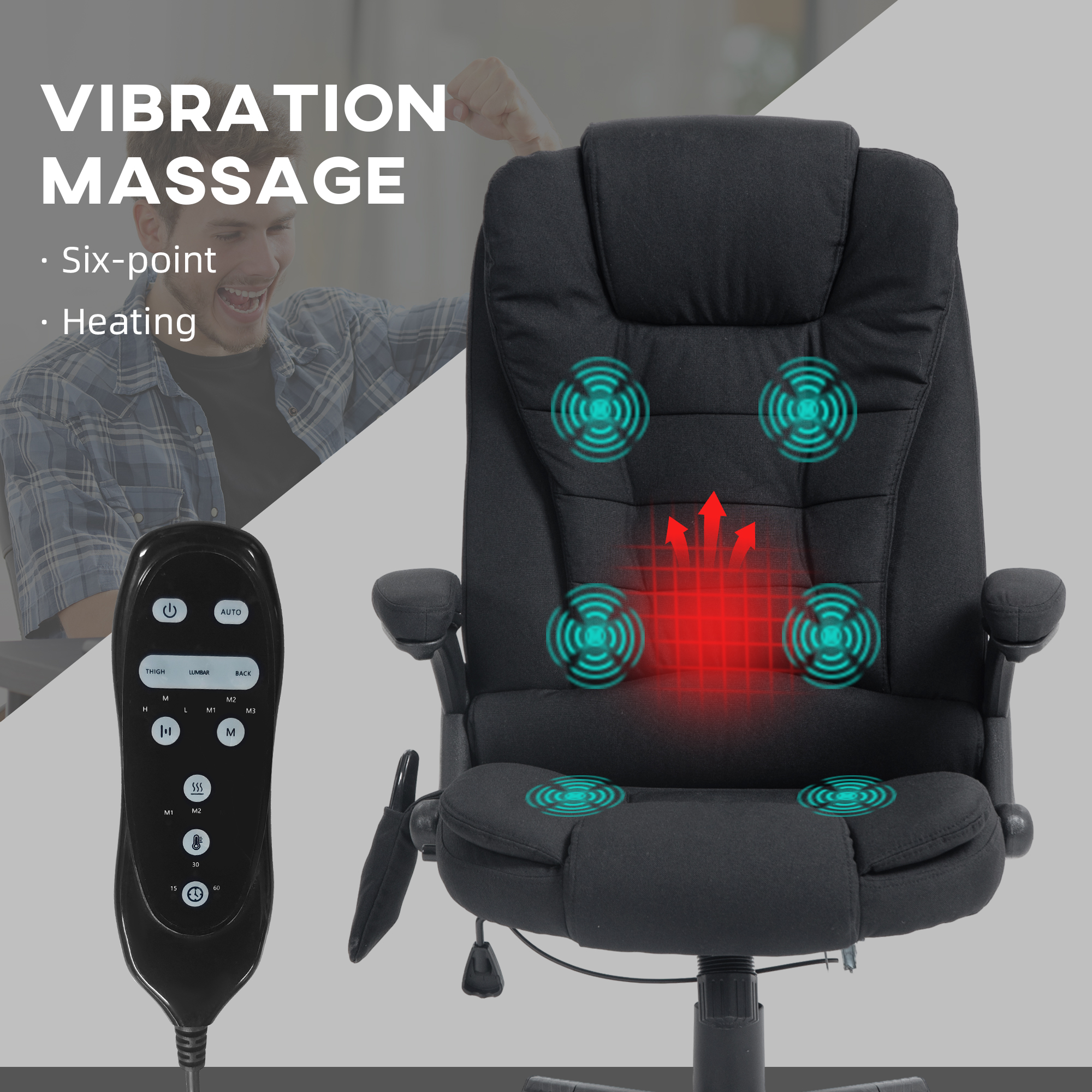 - Feel Better After A Long Day: If you have issues with back pain from sitting all day, this executive office chair has a six-point vibration massage to reduce body fatigue, and lumbar heating to relax it away. Use the remote control to adjust between massage mode, intensity, timer, and heat setting.