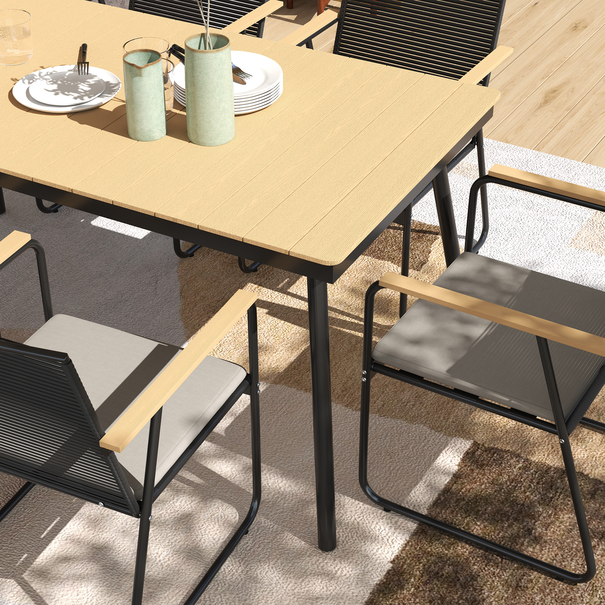 Transform your outdoor space with this stylish 6 seater garden table and chairs! Each chair is equipped with a comfy padded cushion for hours of relaxation, while the wood plastic composite tabletop resists weather damage, ensuring durability. Suit for al fresco dining, it combines comfort, practicality and modern elegance, making every meal an unforgettable outdoor experience.