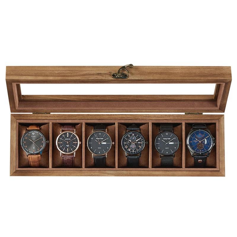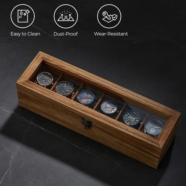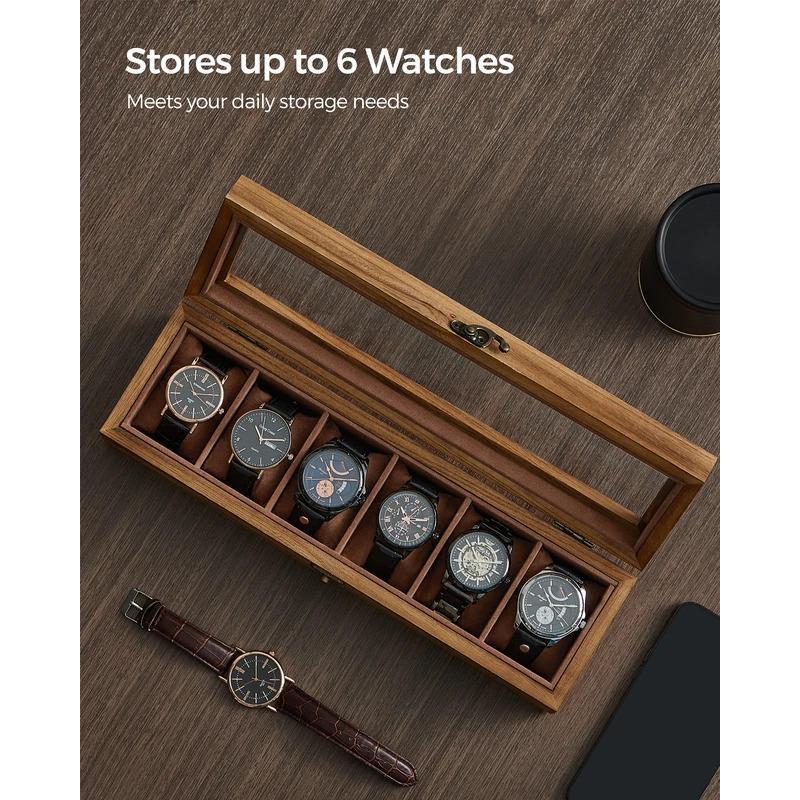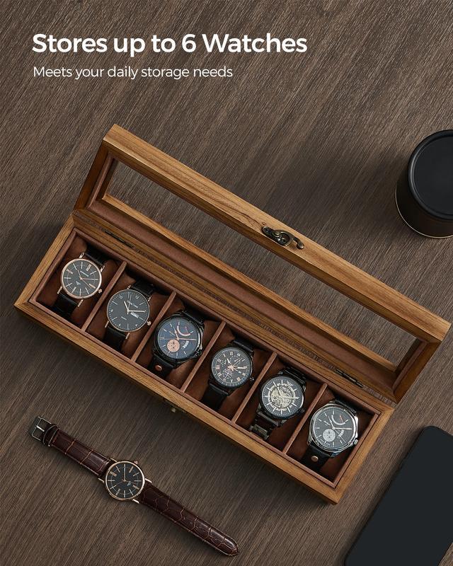 [Style Your Watch Collection] Featuring rustic solid wood with rich grain and a large clear glass, this wooden watch box not only meets your storage needs, but also accentuates your watch collection and adorns your space[Quality Materials, All-Around Protection] Crafted with a solid wood frame outside and soft velvet inside, this watch box offers all-around protection for your watches from accidents and scratches.The soft-yet-supportive pillows keep them in good shape[Stores up to 6 Watches] Boasting 6 slots, this watch case allows you to put your watches with a dial size up to 51 mm all in one convenient spot, so you can easily find the right one without endsly searching[Clear Glass Lid] Displaying your watches, keeping your watches clean from dust, helping you find your watches easier, or deciding on which watch to wear today without opening the lid—this glass lid ticks all the boxes[Gift for Loved Ones] Be it for an anniversary, birthday, or other special days, this watch holder is a smile-inducing gift to any watch enthusiast