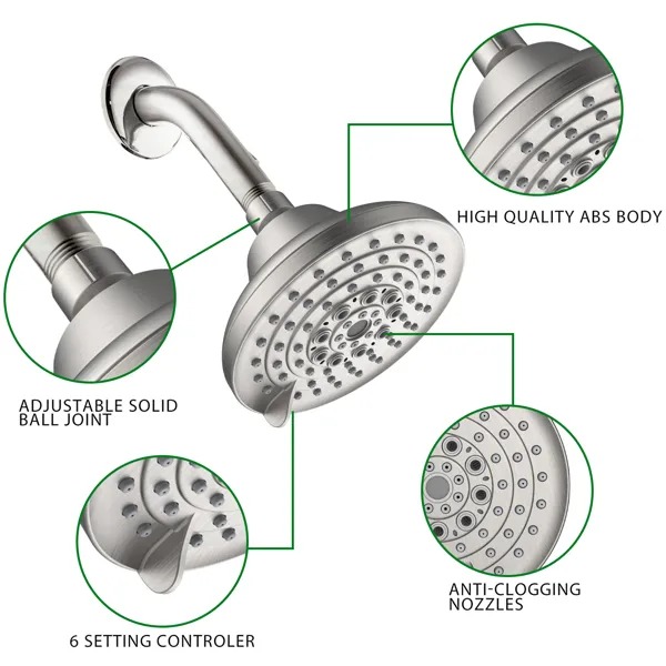 Style ModernMaterial Stainless SteelFinish Type BrushedSetting Type RainInstallation Method Ceiling MountedColor Brushed NickelItem Weight 1.32lbProduct Dimensions 4.72 x 4.53 x 3.74 inchesFinish BrushedItem Package Quantity 1Included Components 6 Spray Settings High Pressure Shower Head 5" Rain Fixed Showerhead - Brushed Nickel Adjustable Shower Head with Anti-Clogging Nozzles; Low Flow Easily InstallationBatteries Included? NoBatteries Required? No