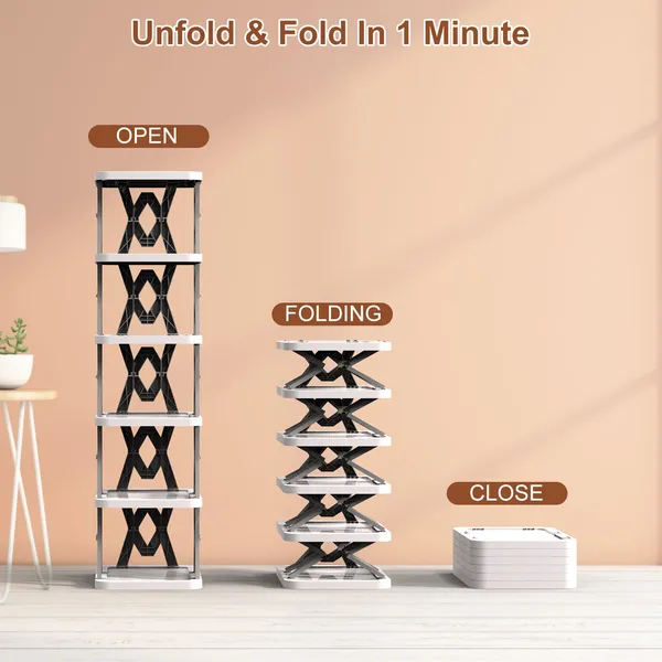 *Foldable Design*:This vertical shoe rack is foldable for easy assembly. No tools or screws are required. Just pull up and get the three-sided X-shaped brackets straight,done in 1 minute. Folded down to a small size of 12.01x10.24x3.74in,easy to carry when moving home. Note:Please make sure the three-sided X-shaped brackets are straight during unfolding. *Space Saving Shoe Rack*:This 6 tier narrow shoe rack makes best use of corner space,keeping your room tidy and streaming your life. No need to be bothered by shoes that are piled out of order! *Wide Applications*:Each tier has a space of 9.06x10.63x6.69in. This free standing shoe rack is able to fit boots,high heels,sport shoes,flat shoes or any other shoes. *Versatile Placement*:Foldable shoe rack can be placed in the hallway,closet,vestibule,entryway,bedroom,living room,camper,etc.. An ideal shoe storage solution for home,office,RV,dormitory. *Sleek & Stylish Shoe Rack*:This small shoe rack features sleek design and textured finish,making it a perfect addition to any home decor style. An easy and affordable choice to store your various kinds of shoes without occupying much space.