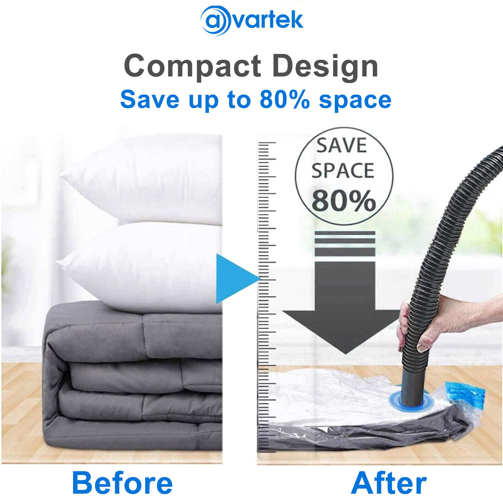 The AVARTEK Vacuum space saving storage bags will enable you to reduce storage space by upto 80%. The unique inbuilt solid double zip seal and premium triple sealed turbo valve ensures that no air can get in or out of the bag.
