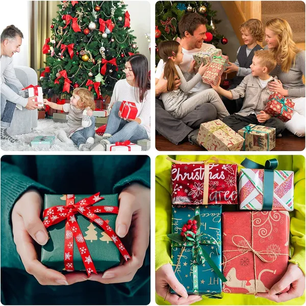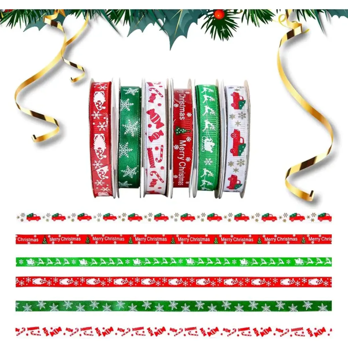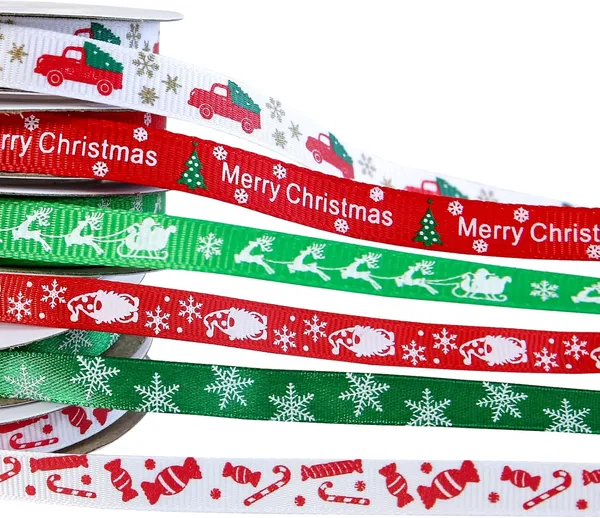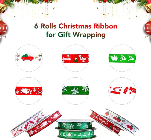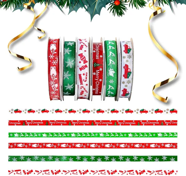 60 Yards 3/8" Christmas Ribbon For Crafts, White Red And Green Holiday Grosgrain Ribbon Christmas Ribbon For Gift Wrapping Festival Holiday Party Hair Bow Clips DIY Crafts Decoration (6 Rolls)