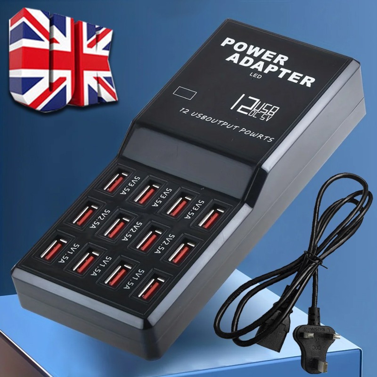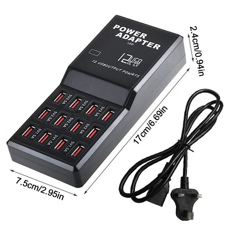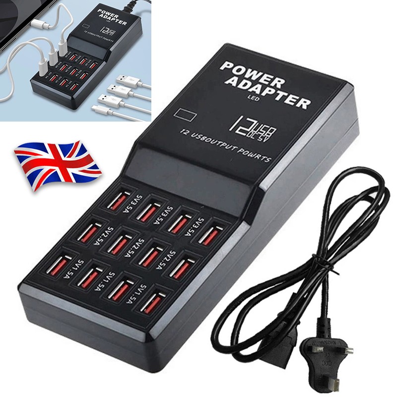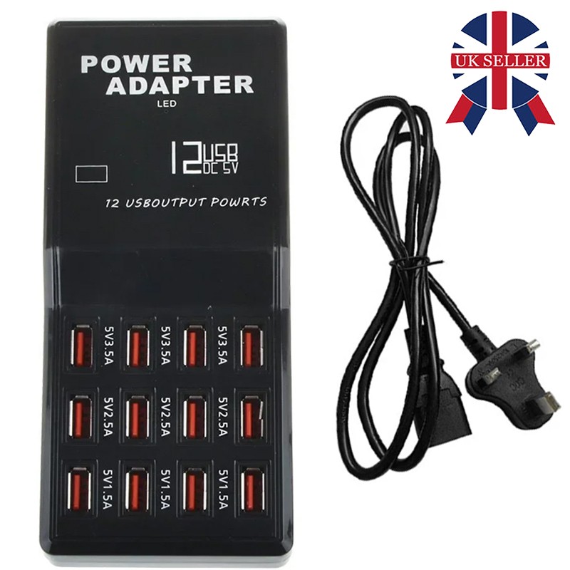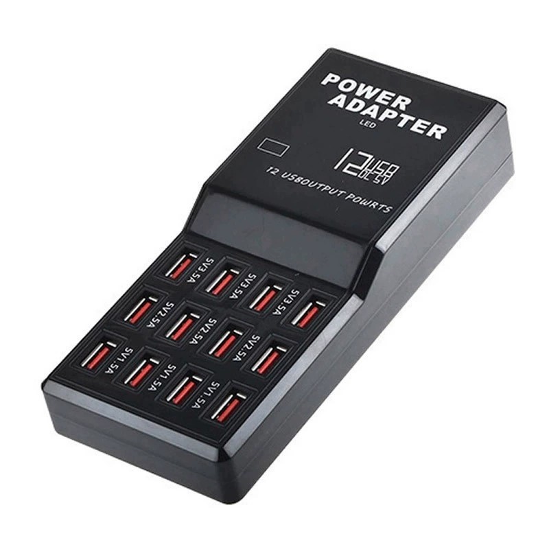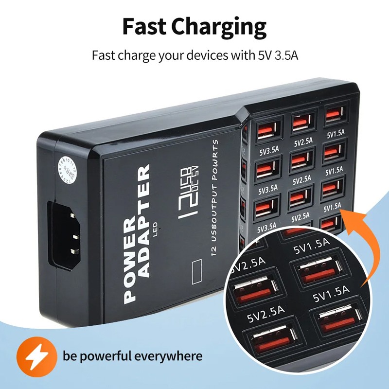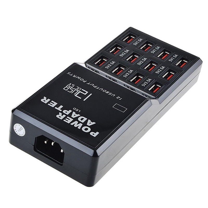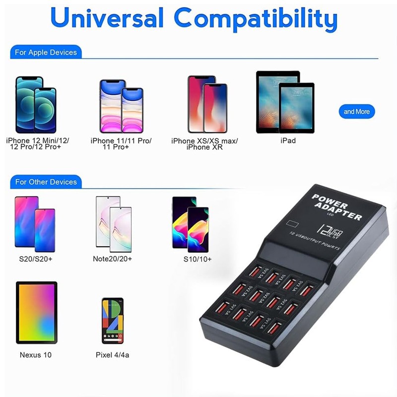 Charge 12 Devices simultaneously - Smart port technology maximizes compatibility with Android, Apple and other devices by enabling charging speeds of up to 12 amps among 12 ports or 2.4 amps per port.