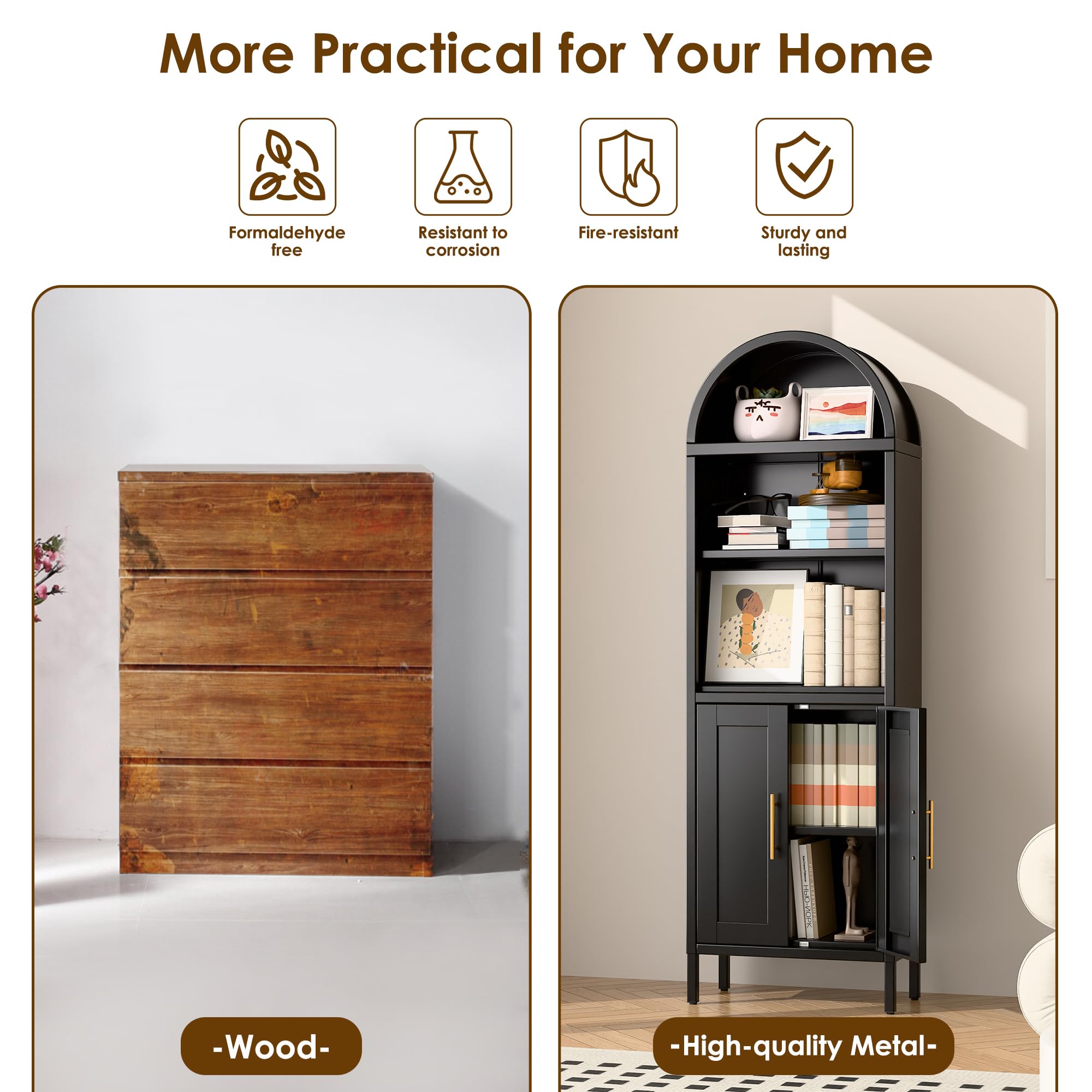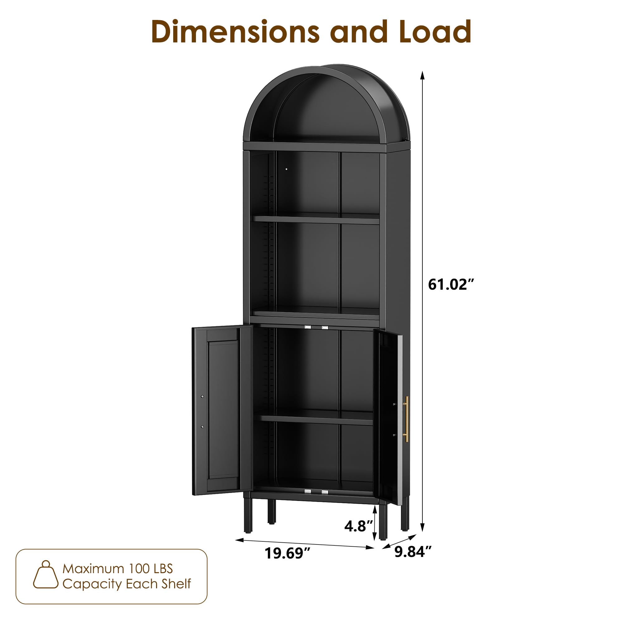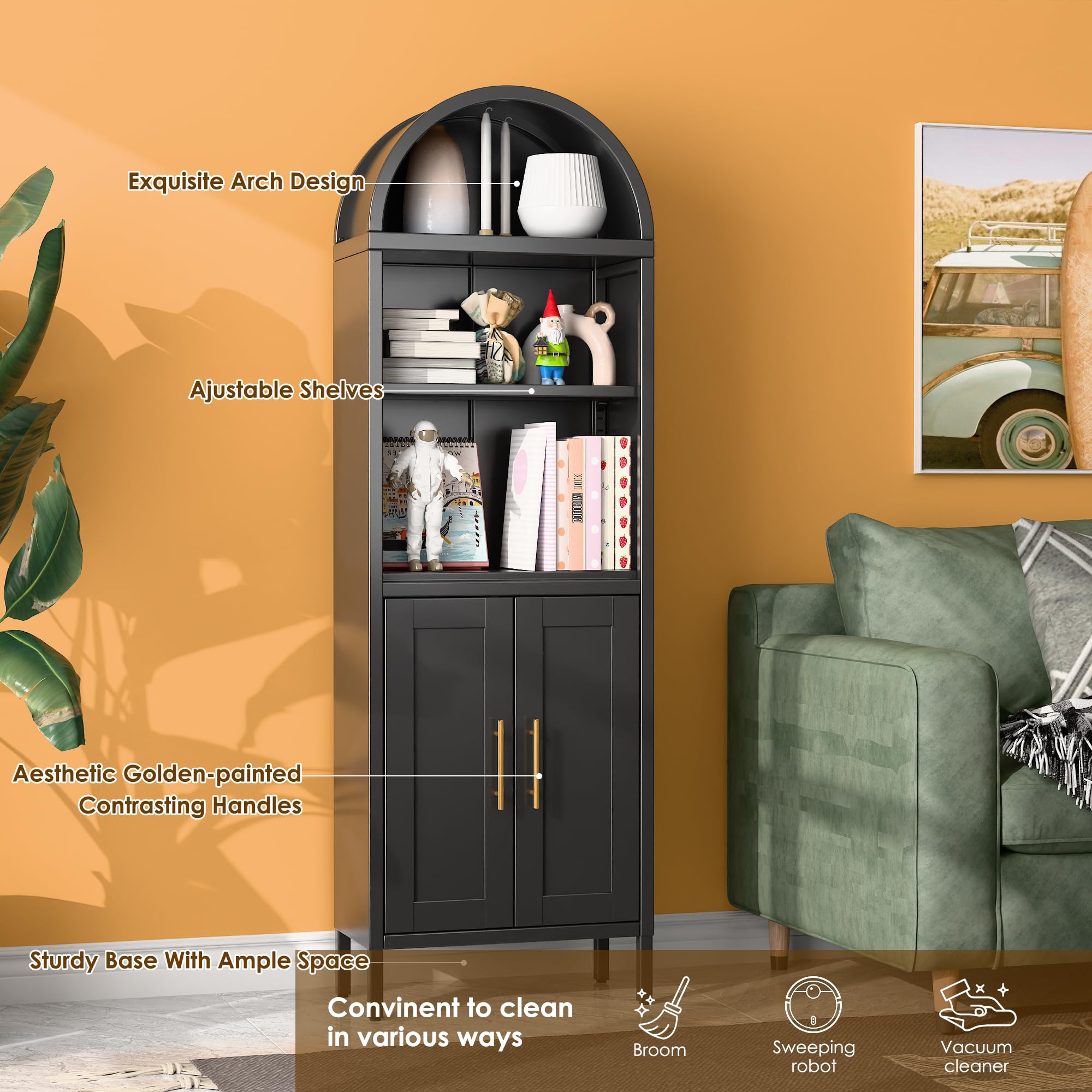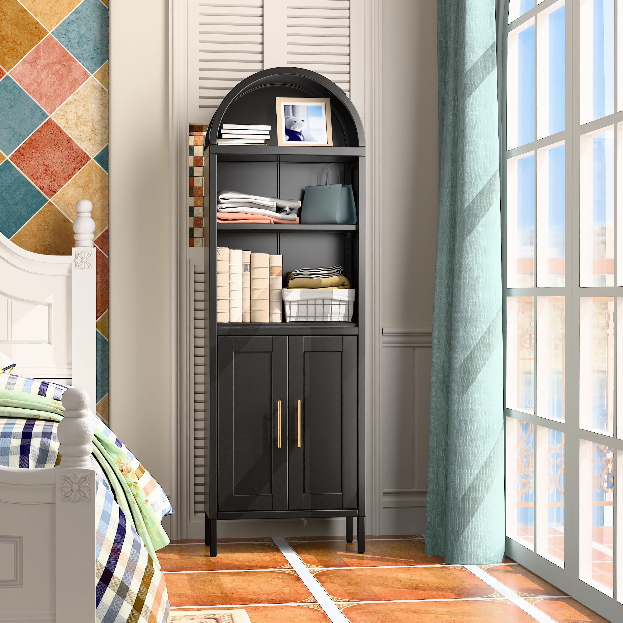 【Multi-Functional Use】 Our metal arched cabinets are perfect for use as a food storage cabinet, bookshelf, display cabinet, or pantry, this arched bookcase adapts to various scenarios in your bedroom, living room, home office, kitchen, or reading room
