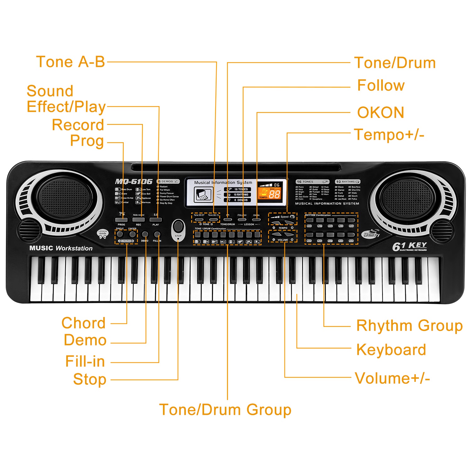 • *Multifunctional 61-Key Piano Toy*:There are multi-function for this piano toy:6 English Demo Songs,16 Tones,10 Rhythms,8 Percussion Instruments,2 Learning Function,Sound Control,Recording,Chords,Volume Adjustment,Fill-in,Beat Speed,Microphone,Program,Follow and so on.