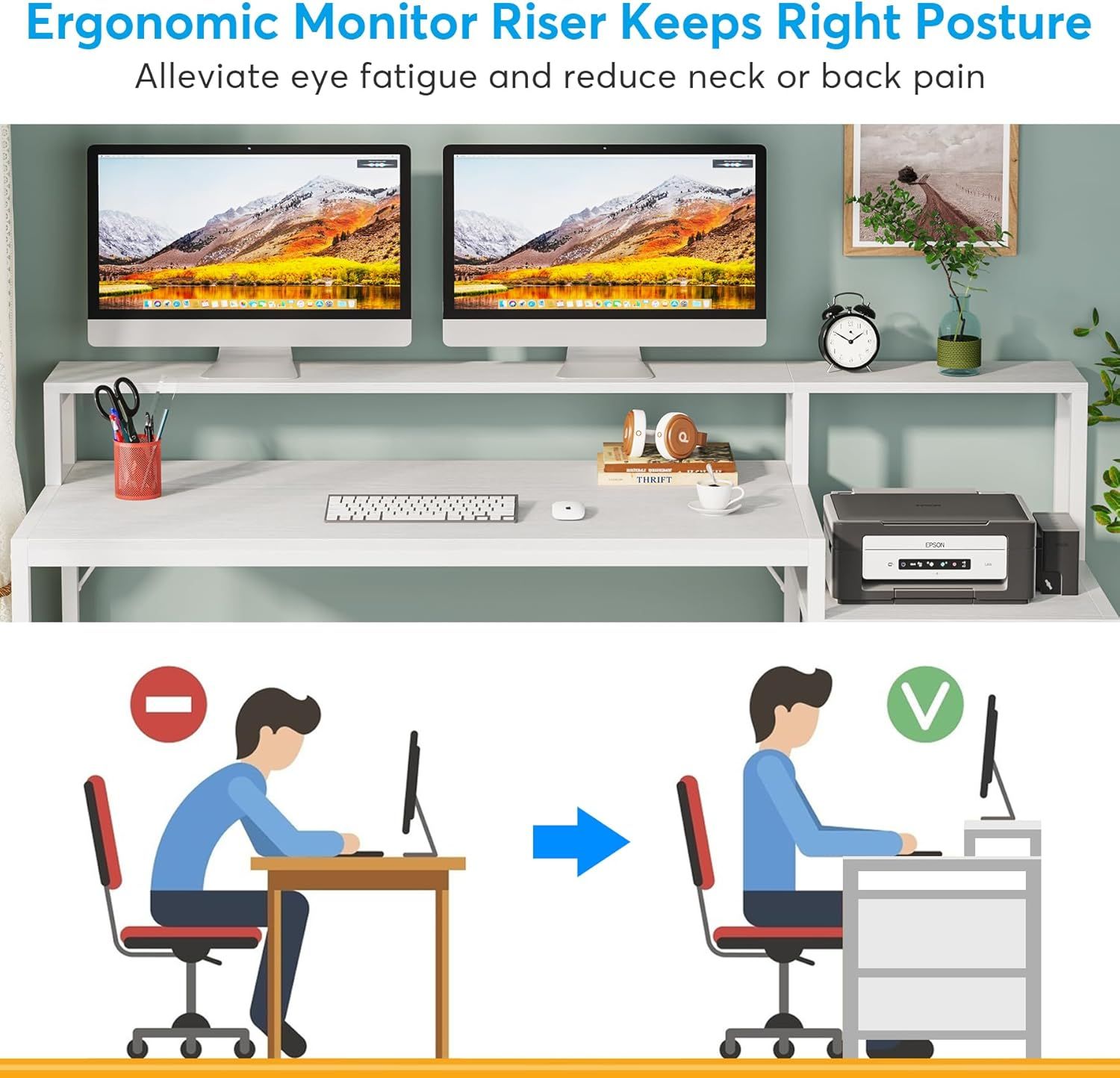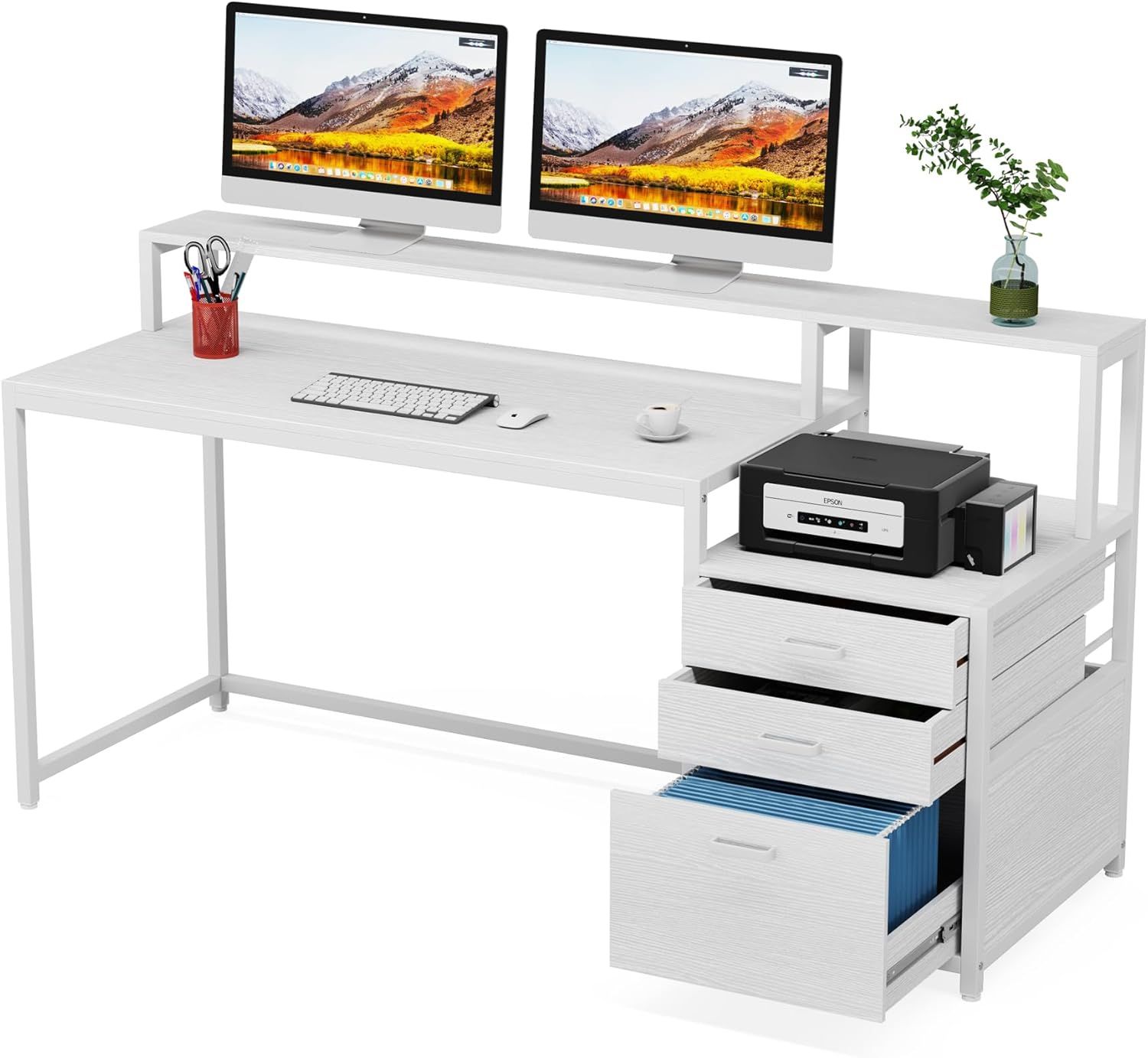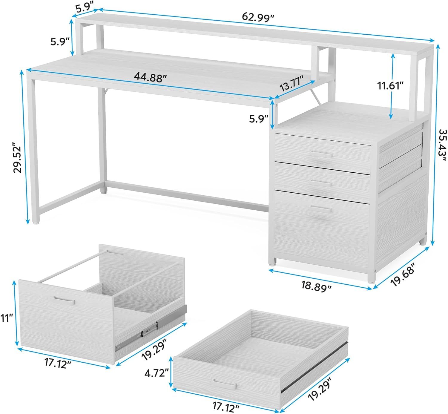 [TWO-TIER TABLETOPS]: Featuring with 62.99’’ long monitor riser and 45’’W X 19.68’’D desktop, this desk with drawers provides ample space for several monitors, laptops or other must-have office essentials, giving you spacious and free workstation space for your office activities, like working,studying, gaming, and etc.