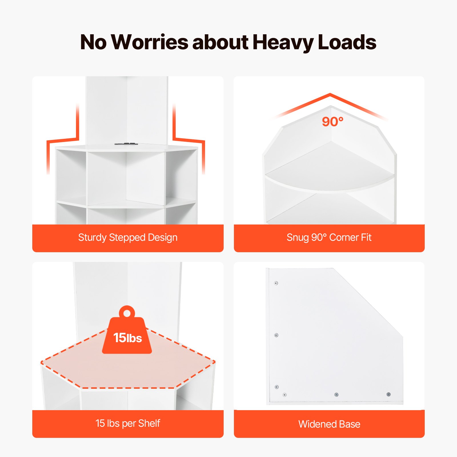 Stable & Secure Structure: Made from thickened particle board and featuring a trapezoidal design for added stability, this tall corner cabinet can hold up to 15 lbs (6.8 kg) per shelf, safely storing items like a small toaster oven. Plus, we’ve included a tip-over prevention device—be sure to install it for added security.