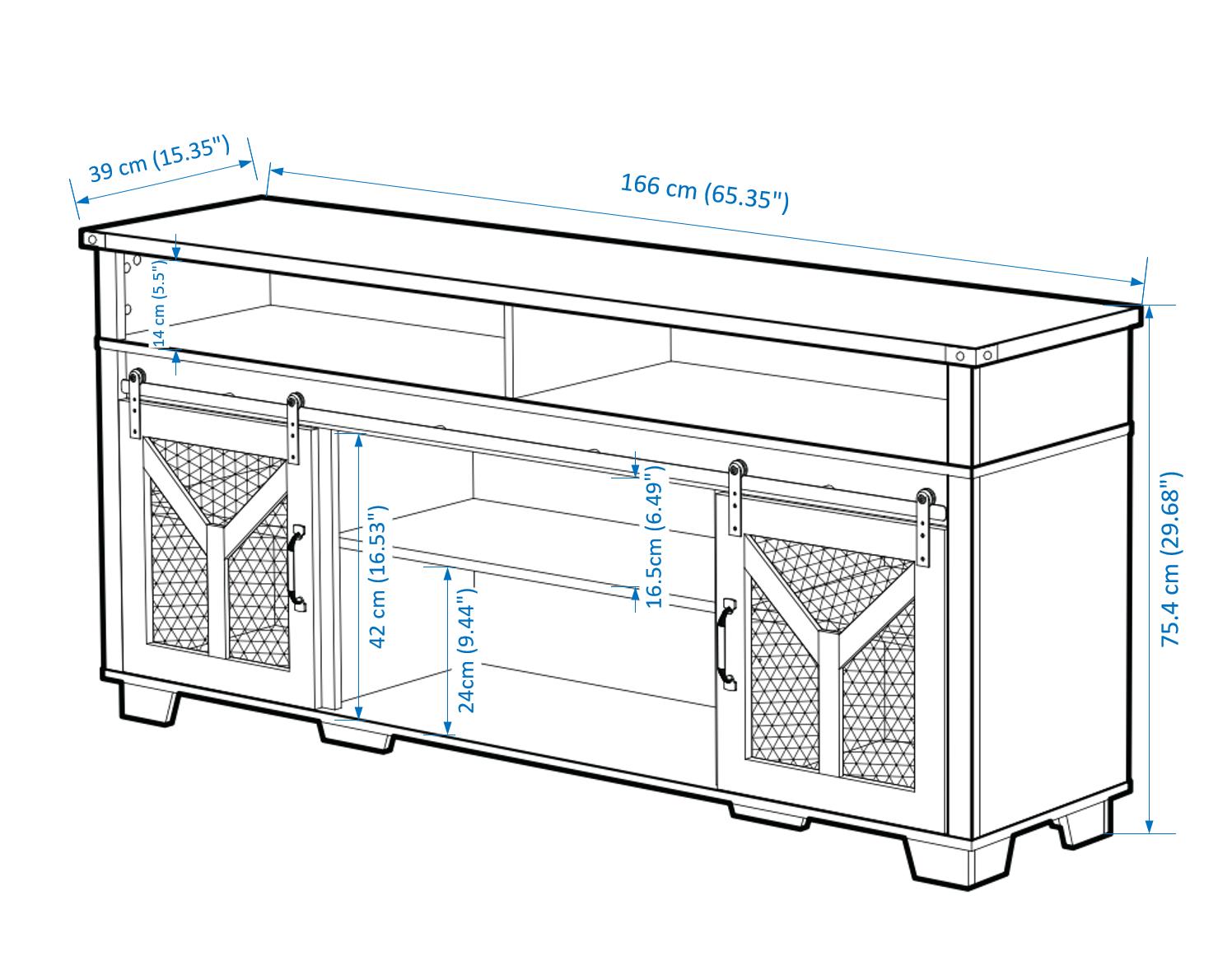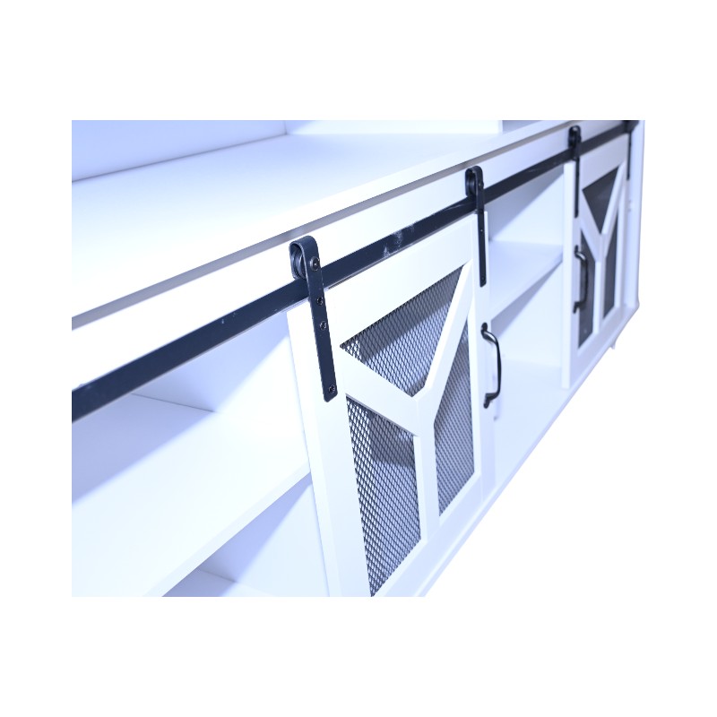 - Stylish and Functional Design:This TV stand features a unique combination of a white body and a black walnut - colored top, creating an elegant and modern look that seamlessly blends with various home decor styles. Sliding barn doors with inset metal mesh and dark iron-tone hardware not only add a touch of rustic charm but also provide convenient storage access, allowing you to keep your media devices and accessories organized.