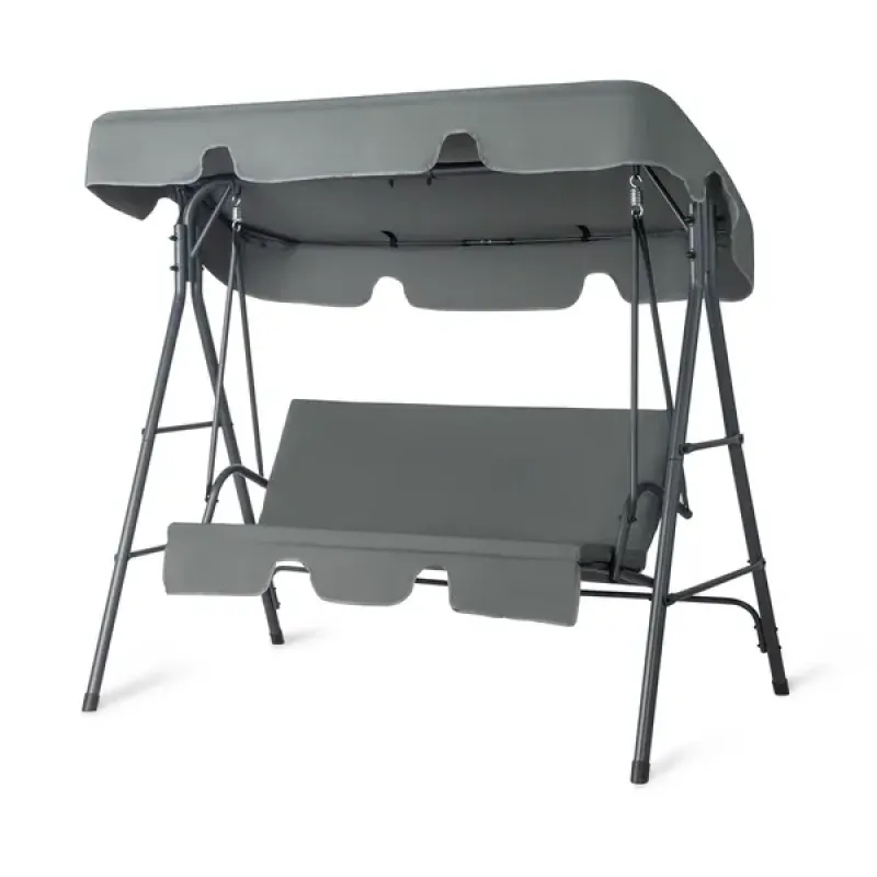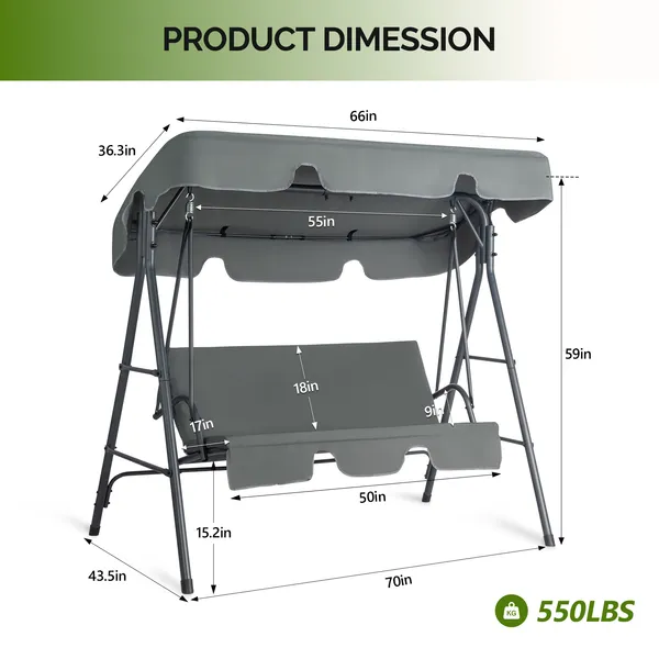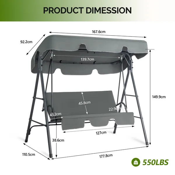 This 684360inch dark gray KD swing set is constructed with a sturdy steel frame and durable Oxford cloth, equipped with a soft cushion and sunshade canopy. It supports up to 250kg weight capacity, providing safe and comfortable outdoor leisure experience. Product size: 172.00×108.00×152.00cm, net weight 18.63kg; package size: 95.00×47.00×20.00cm, gross weight 20.43kg, perfect for patio, garden and backyard use.