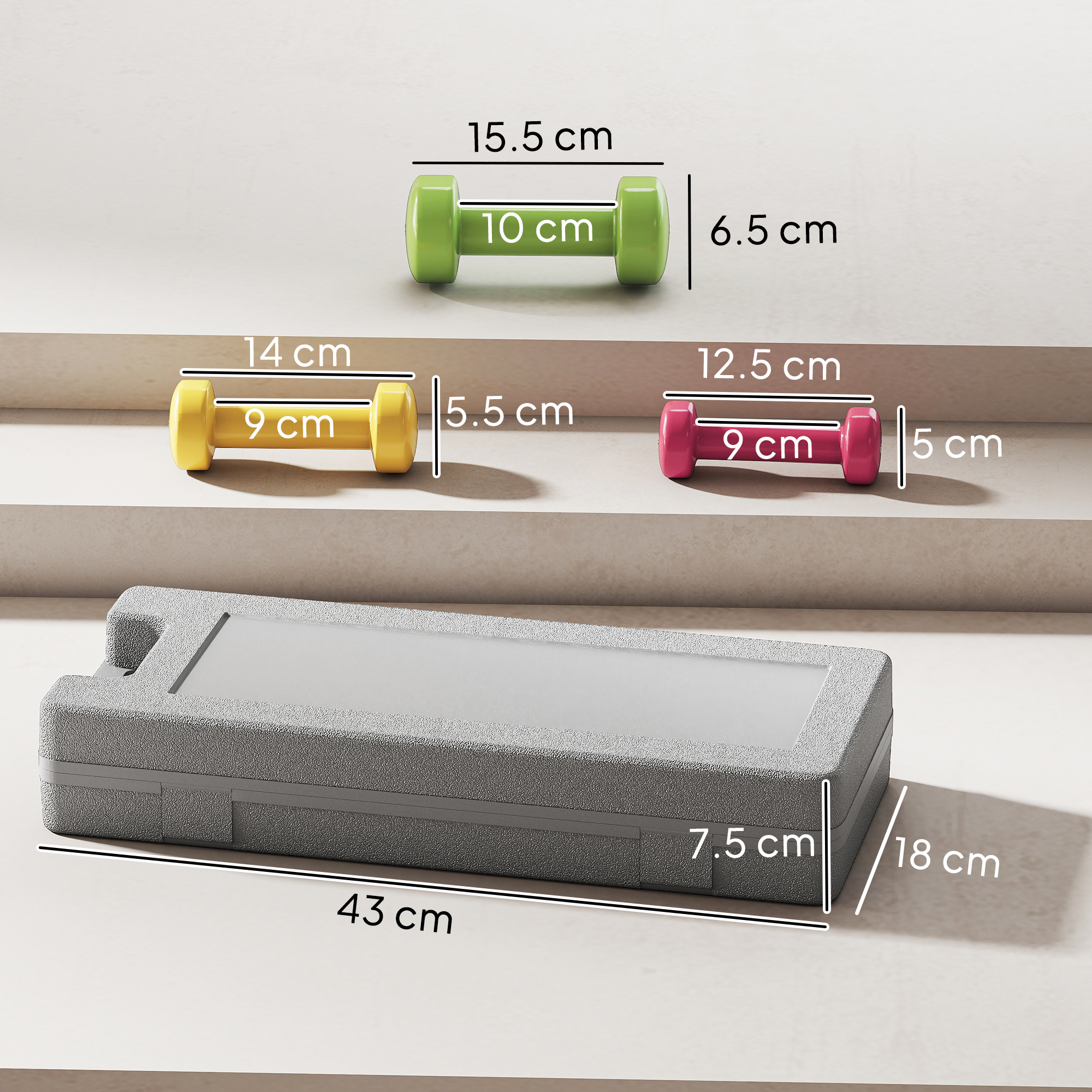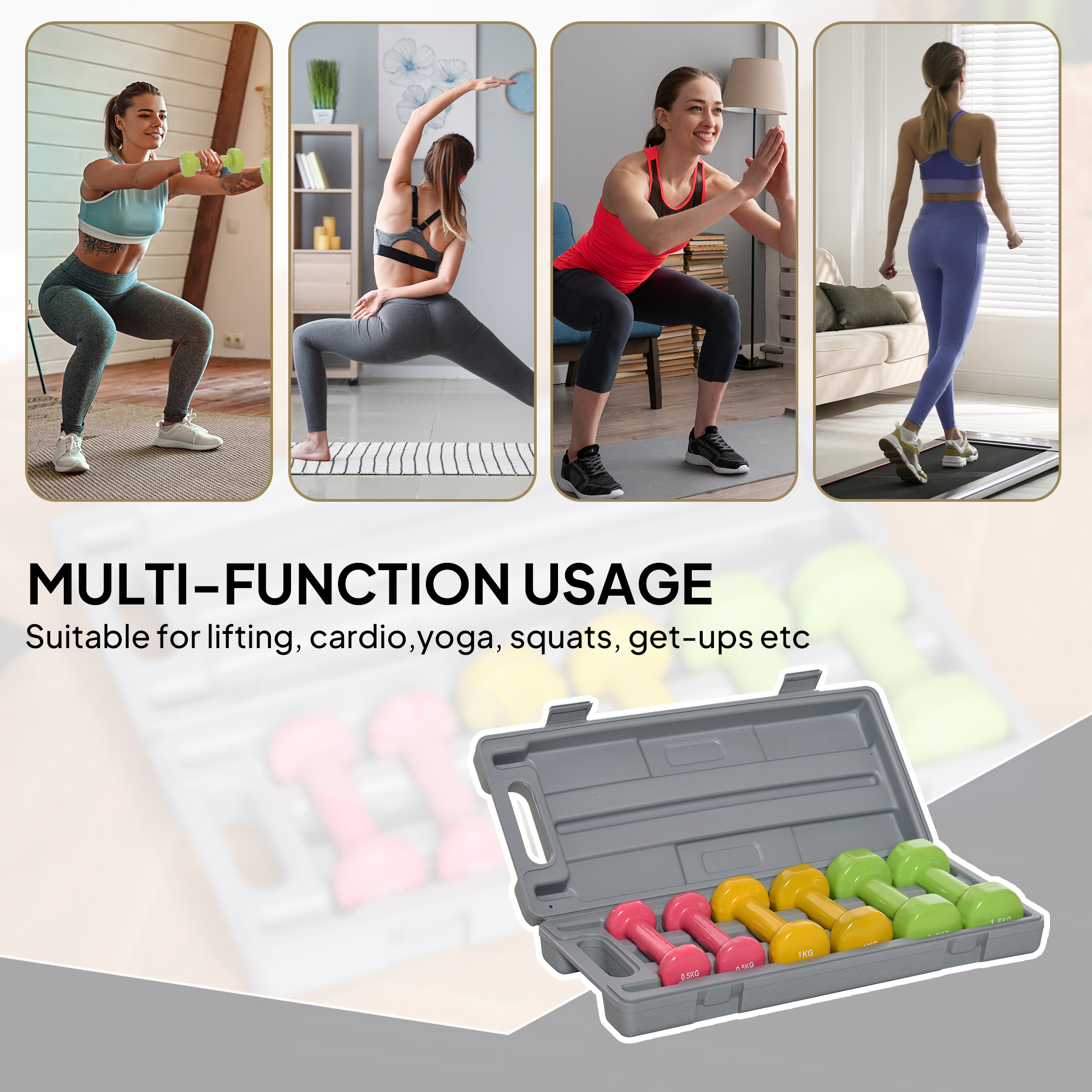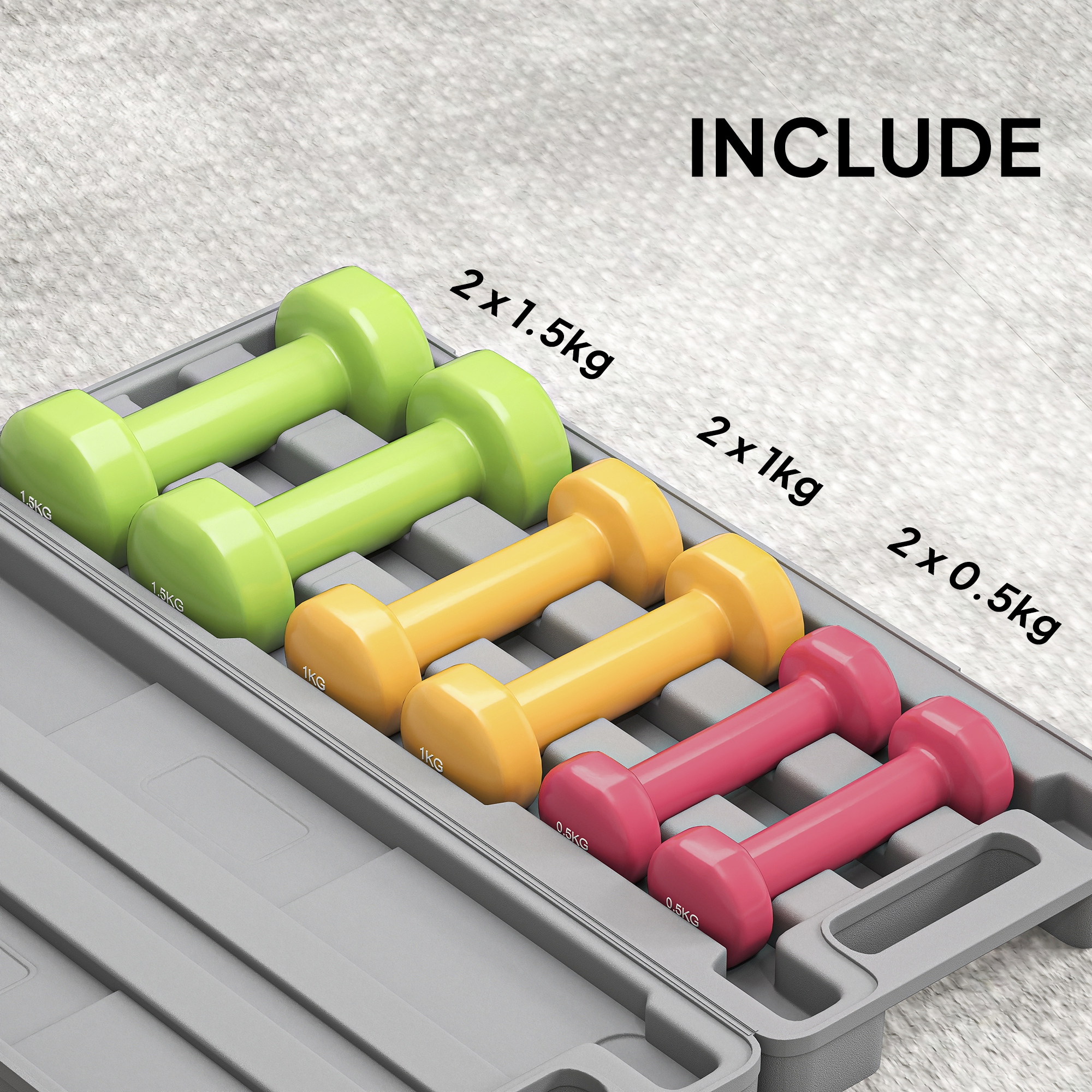 Elevate your home workout routine with the versatile dumbbell set, designed for those who value convenience and variety in their fitness journey. Perfect for lifting, cardio, yoga, squats, and more, this set includes three pairs of dumbbells (0.5kg, 1kg, and 1.5kg) to meet diverse training needs. The vibrant colors and clear numbers make organization effortless, while the handy suitcase ensures easy storage and portability. Embrace a healthier lifestyle.