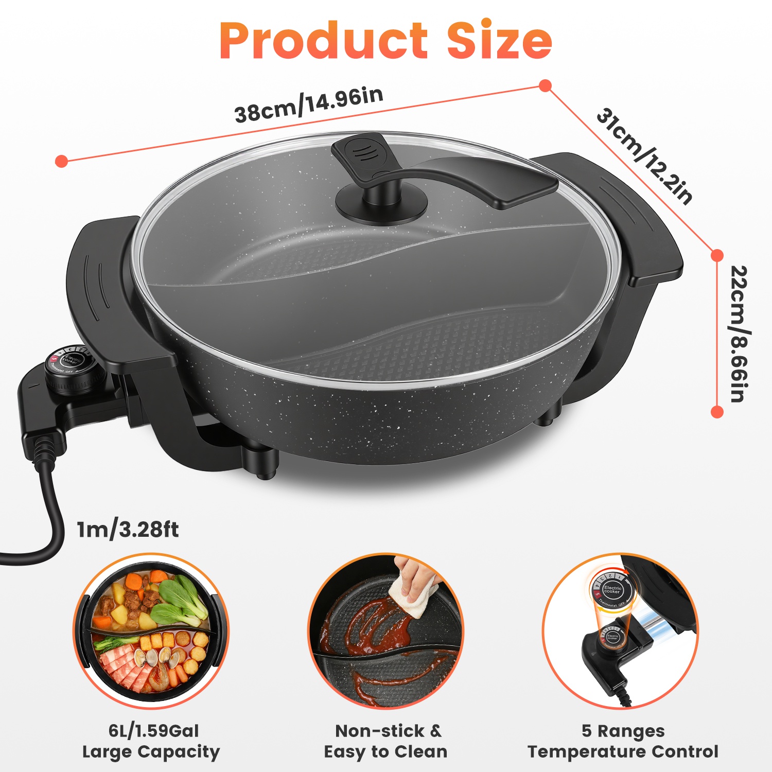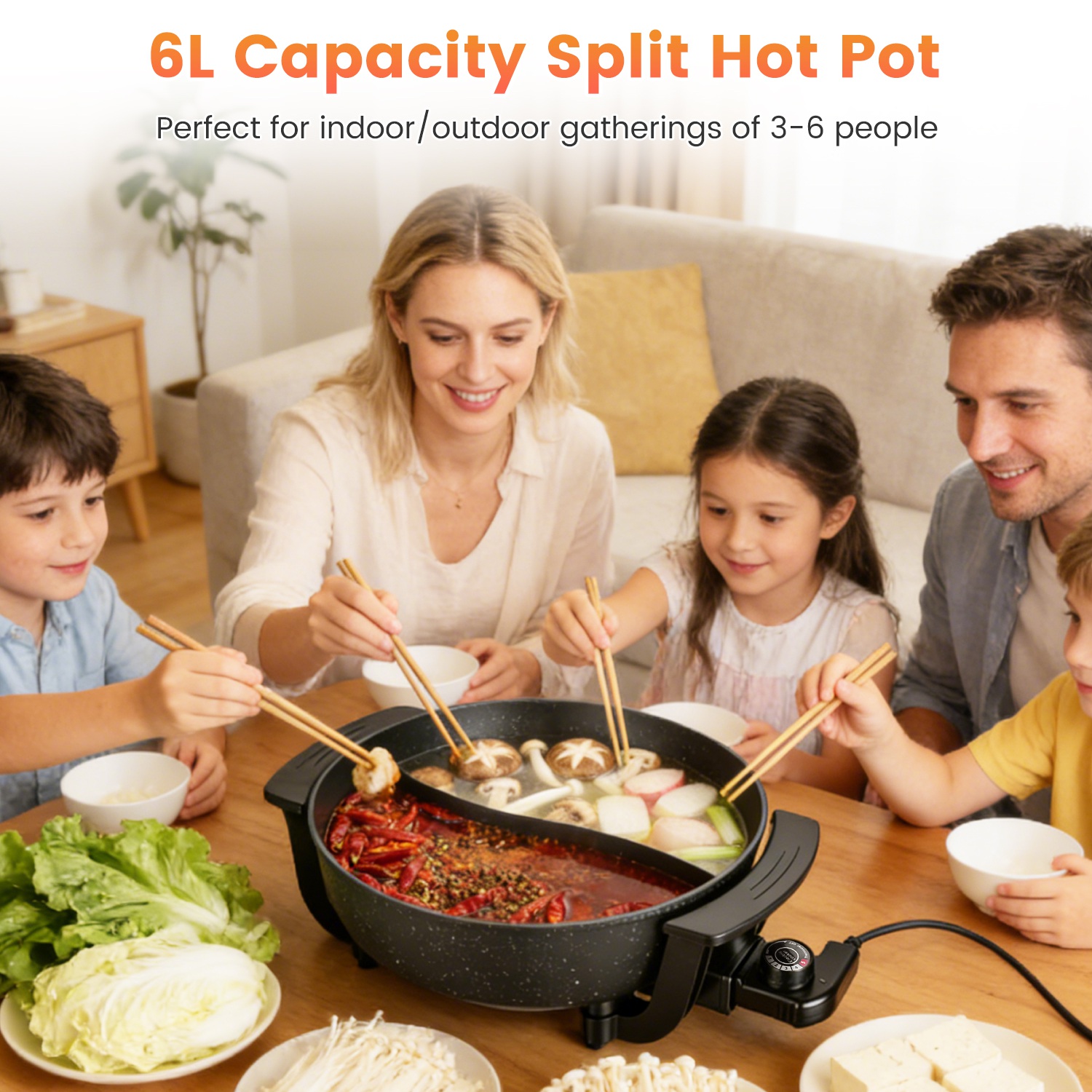 *Spacious 6L Capacity for Group Dining*:With a generous 6L capacity,this electric hot pot is perfect for hosting family meals,parties,or gatherings. The large cooking space lets you prepare enough food for 3-6 people,making it ideal for communal dining experiences like hot pot,fondue,and shabu-shabu.