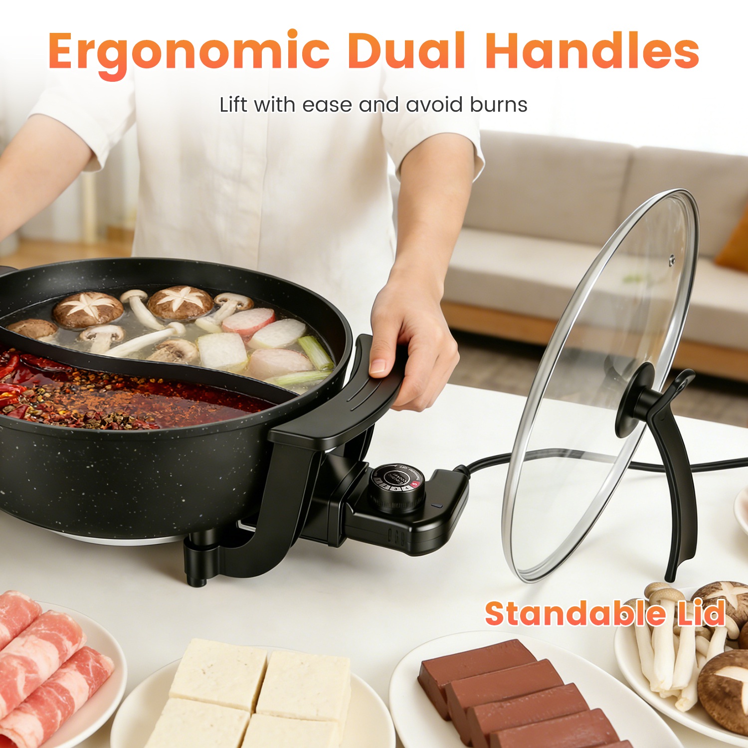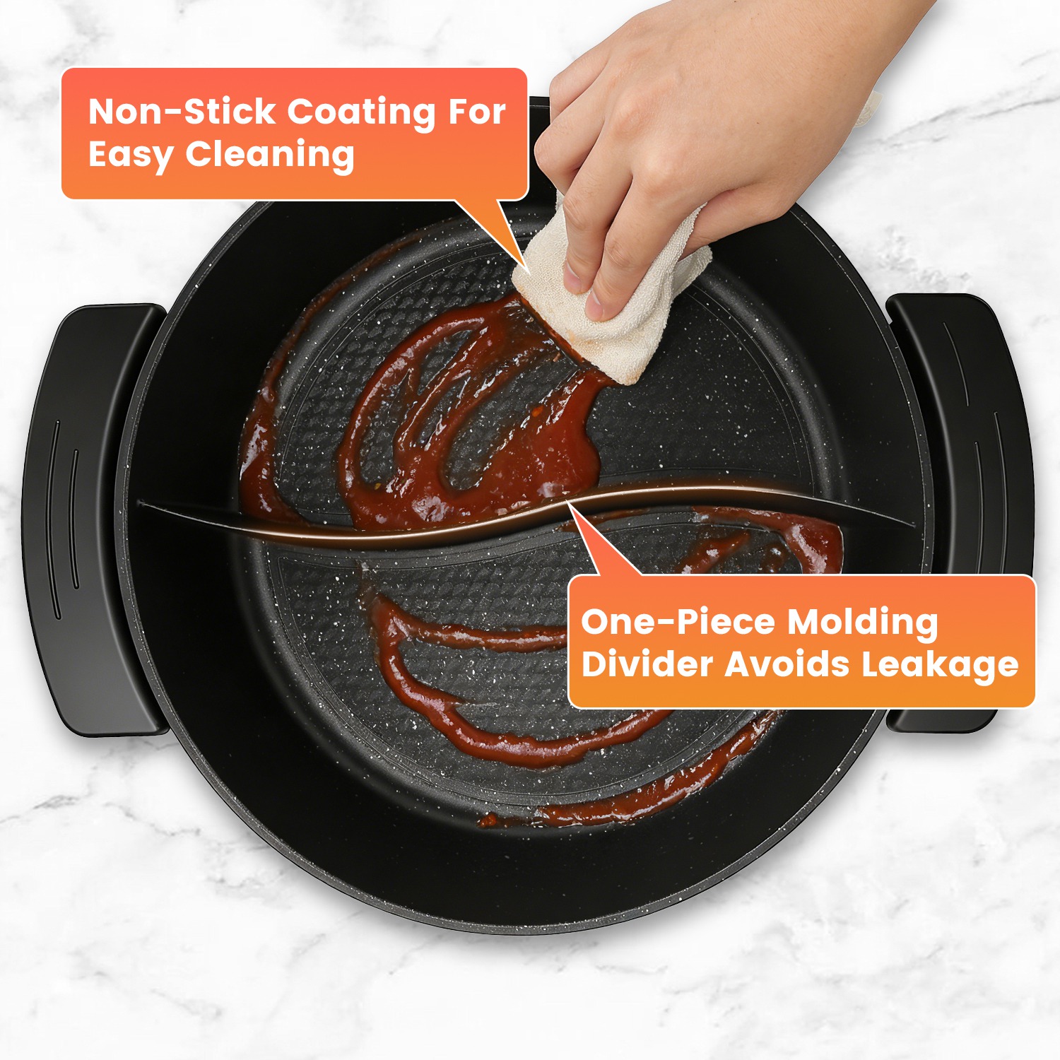 *Divider for Dual-Flavors & Versatile Cooking*:Featuring a built-in divider,this hot pot allows you to cook two different broths simultaneously without mixing flavors. Whether you prefer a spicy base on one side and a mild one on the other,you can easily customize your meal to satisfy everyone’s preferences.