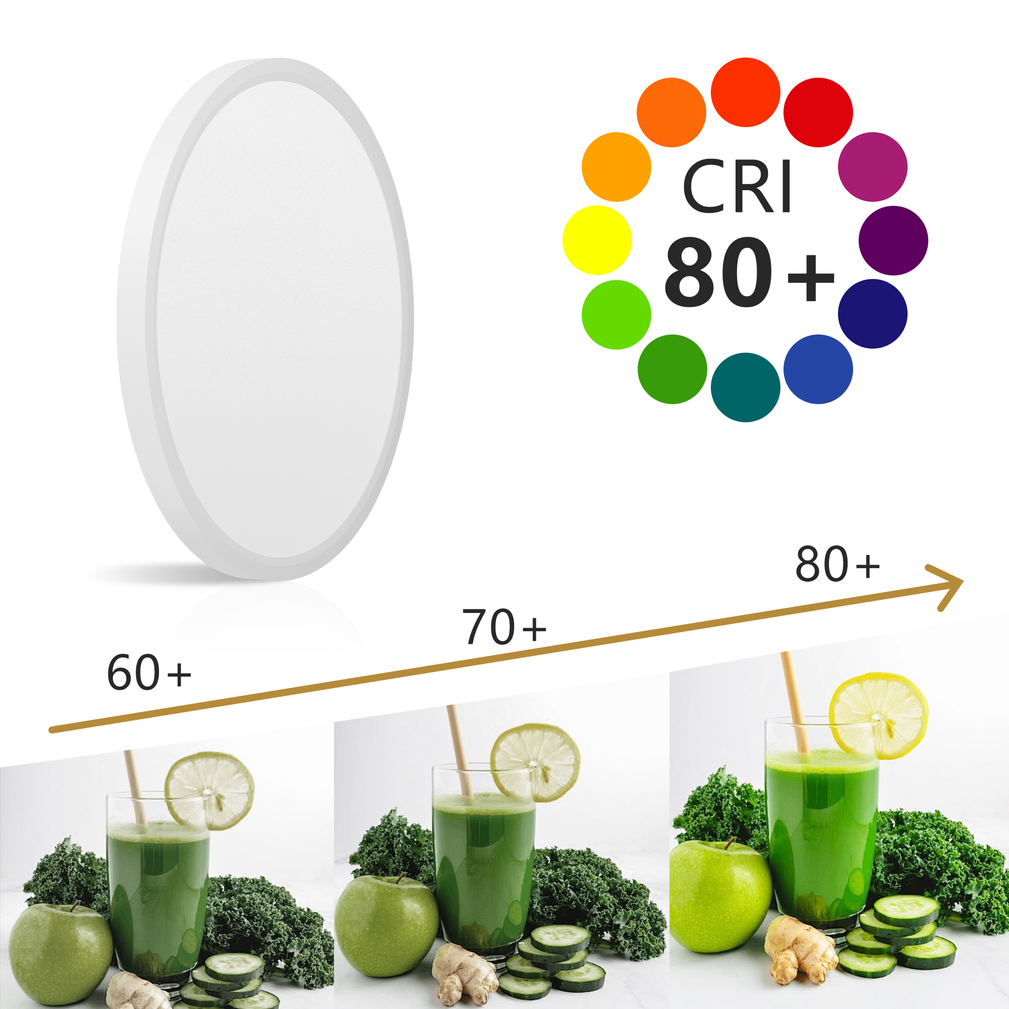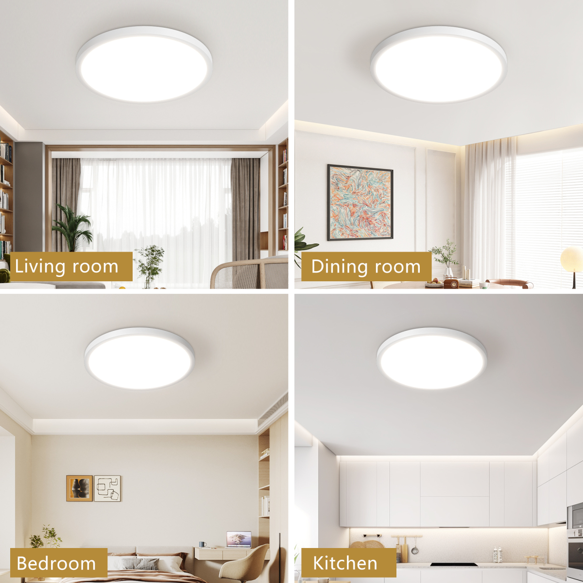 5 CCT Selectable - Choose from 2700K/3500K/4000K/5000K/6500K light colors (soft white, warm white, bright white, neutral white, and daylight) using the switch on the back of the light. Easily customize your lighting needs to your exact specifications.2880 Lumens - This color selectable disk light fixture features a 2880 lumen output with 80 CRI rendering, using only 24 watts of energy, equivalent to a 150-watt incandescent light.Easy Installation - Featuring a slim 0.7' profile, this 12-inch LED ceiling mount light fixture easily mounts to a standard j-box with the provided mounting bracket.Damp Location Suitable - This light fixture is suitable for damp locations such as shower ceilings, making it versatile for a range of installation locations in your home.