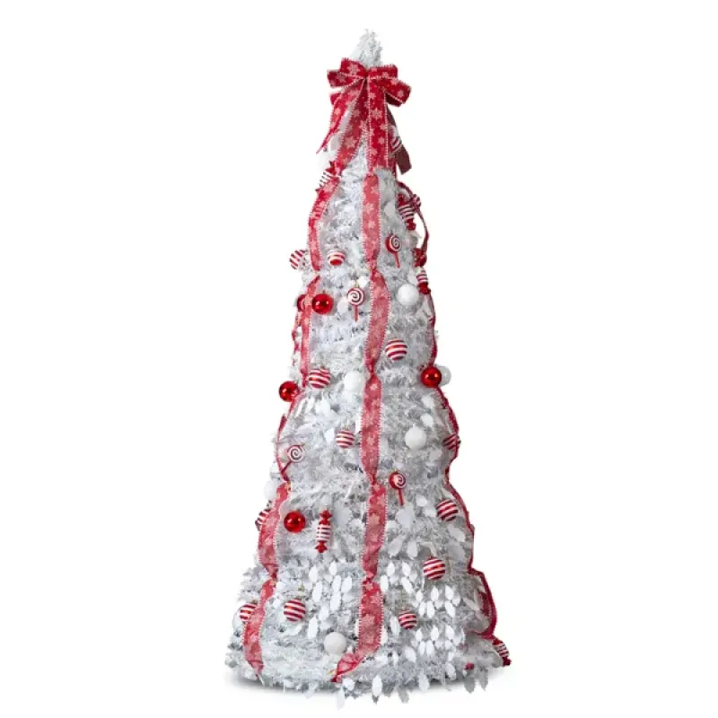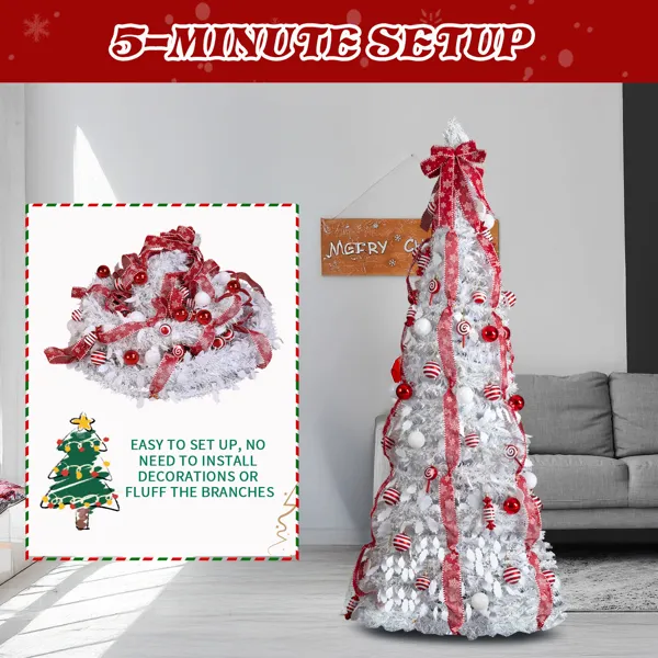 7 FT Fully Decorated Pre-lit Christmas Tree, Pop Up Artificial Xmas Tree With 170 Warm Lights And Red Ornaments For Home Office Store Holiday Deco, White