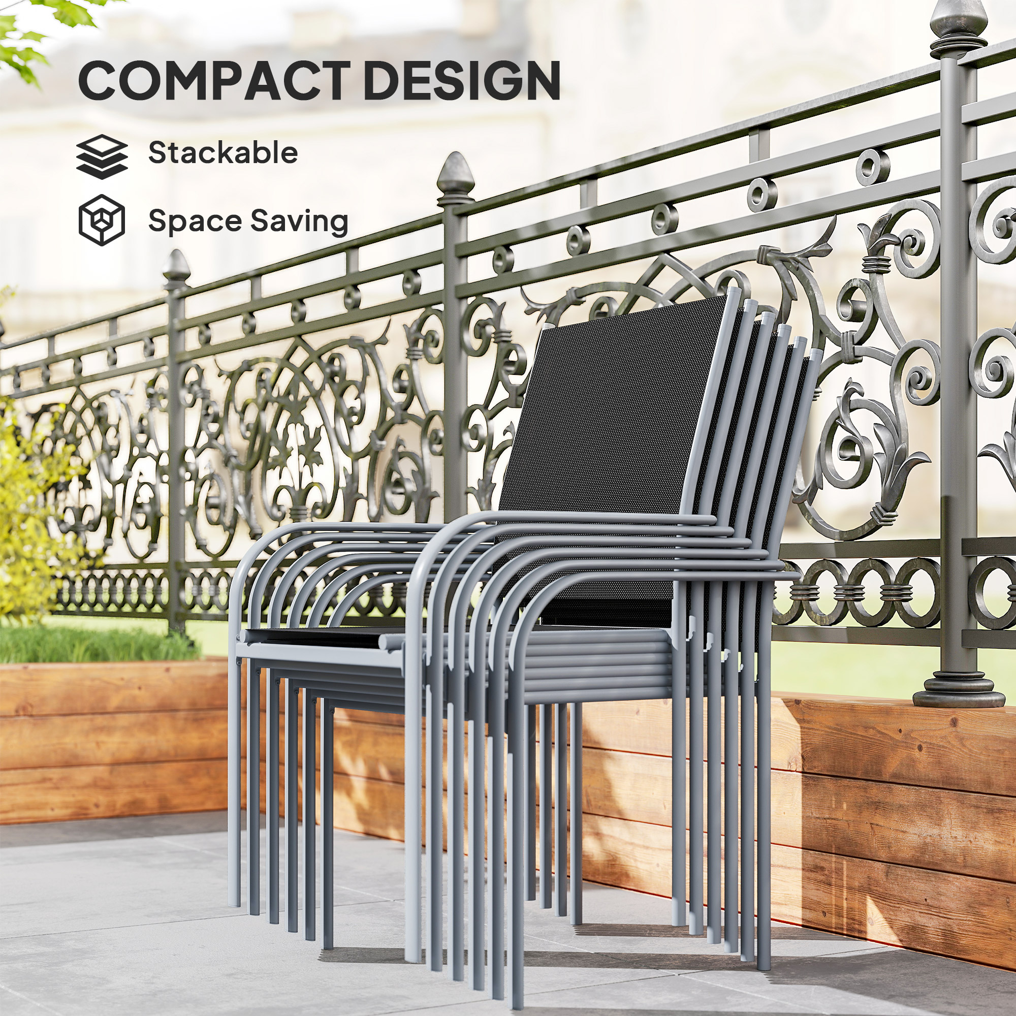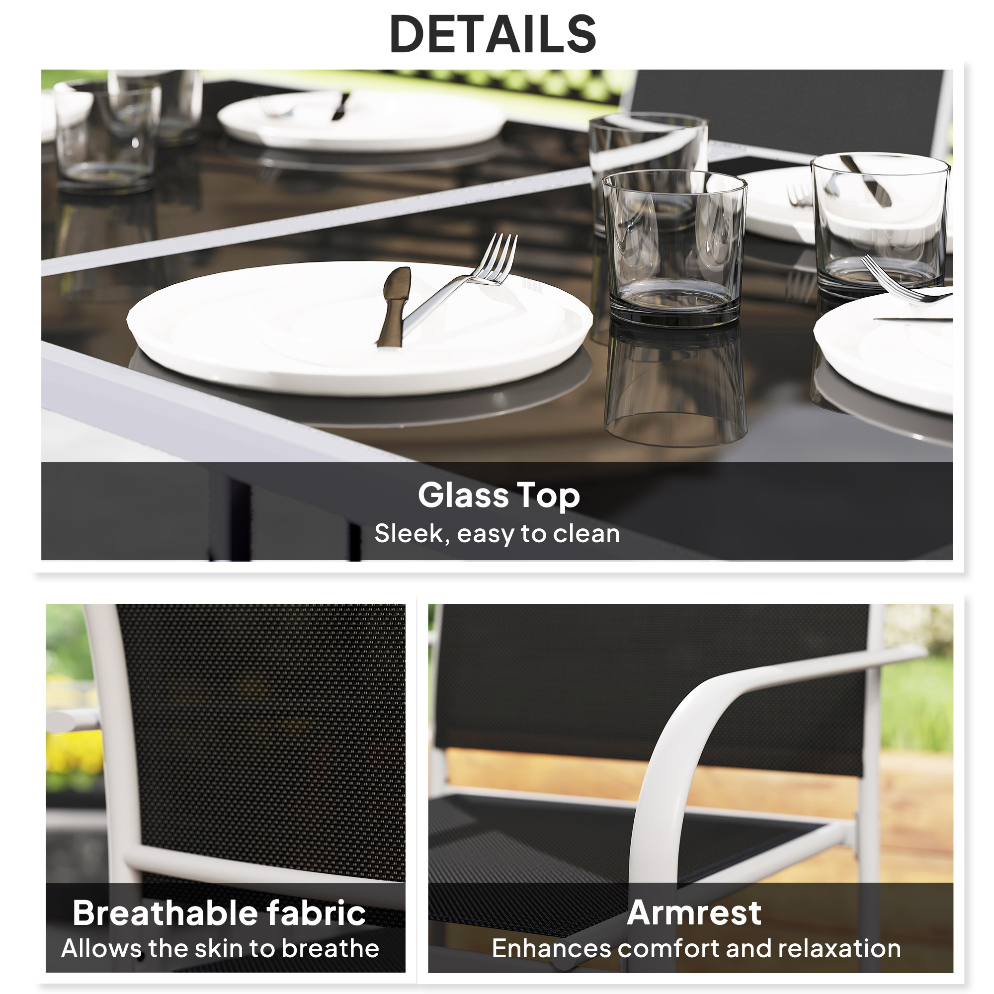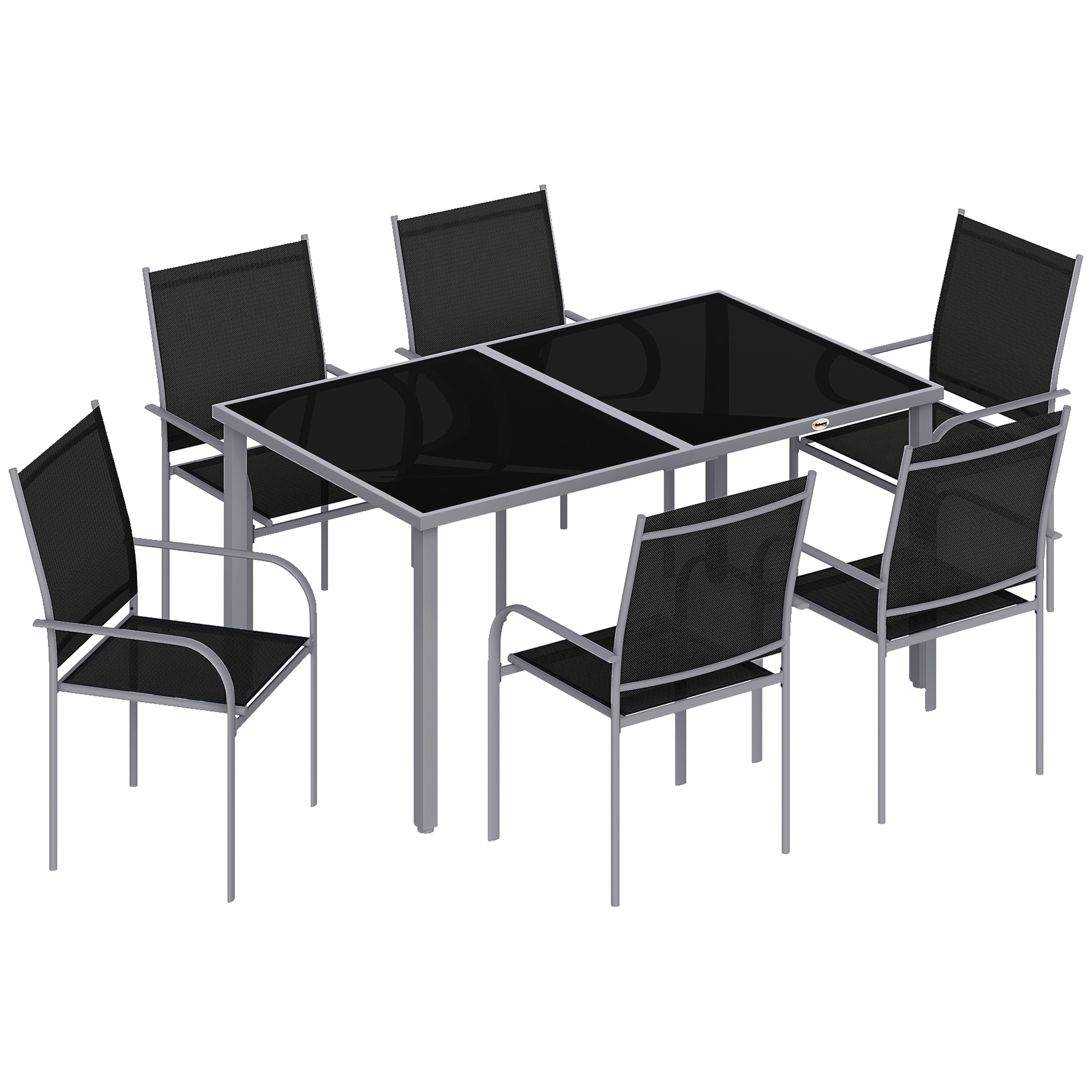 7 Piece Outdoor Garden Dining Set With Table And 6 Stackable Chairs, Steel Frame, Tempered Glass Top, Mesh Seats, Black