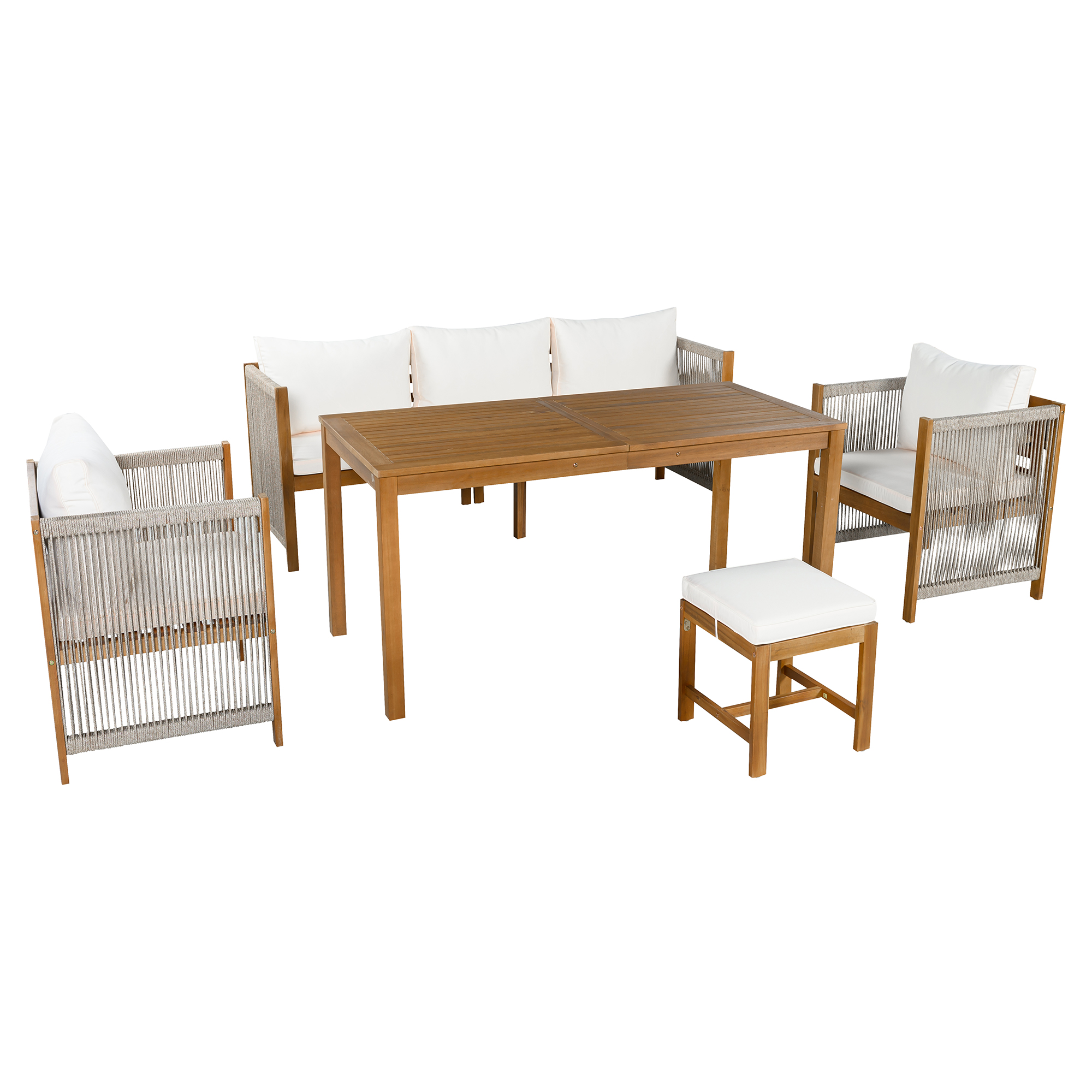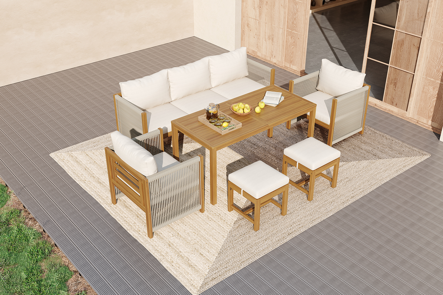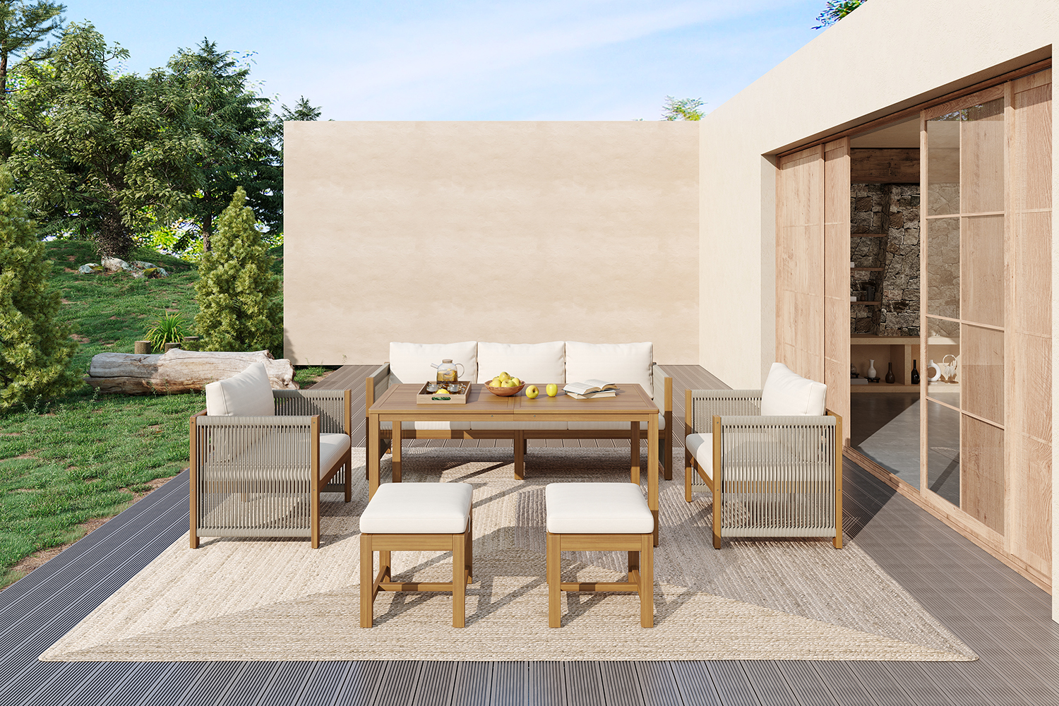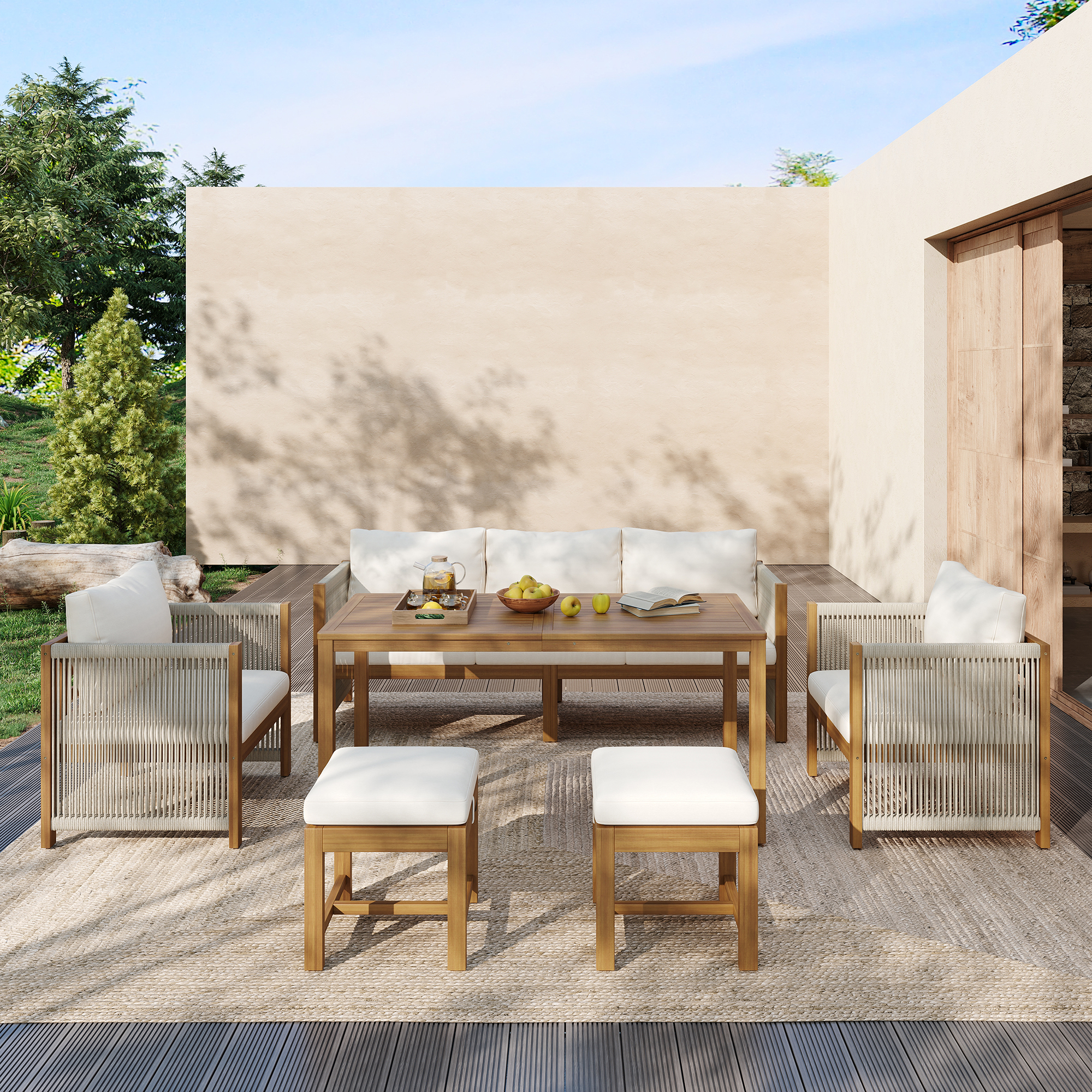 Product Name:7-Seater Garden Lounge & Dining Set, Acacia Wood Frame Outdoor Patio Furniture, Rope Weaving, Acacia Wood Tabletop, Includes All Chairs & Backrest Cushions, Beige