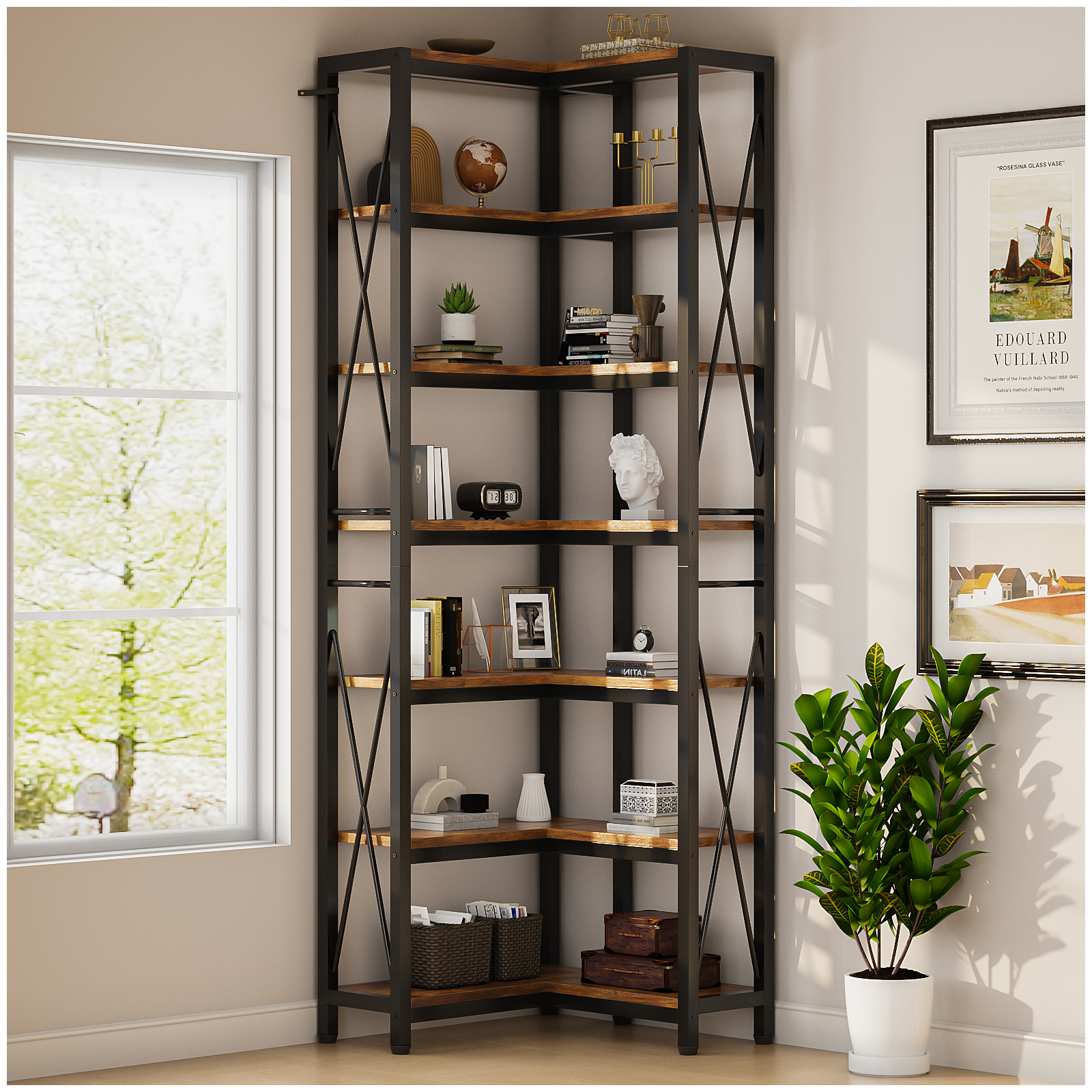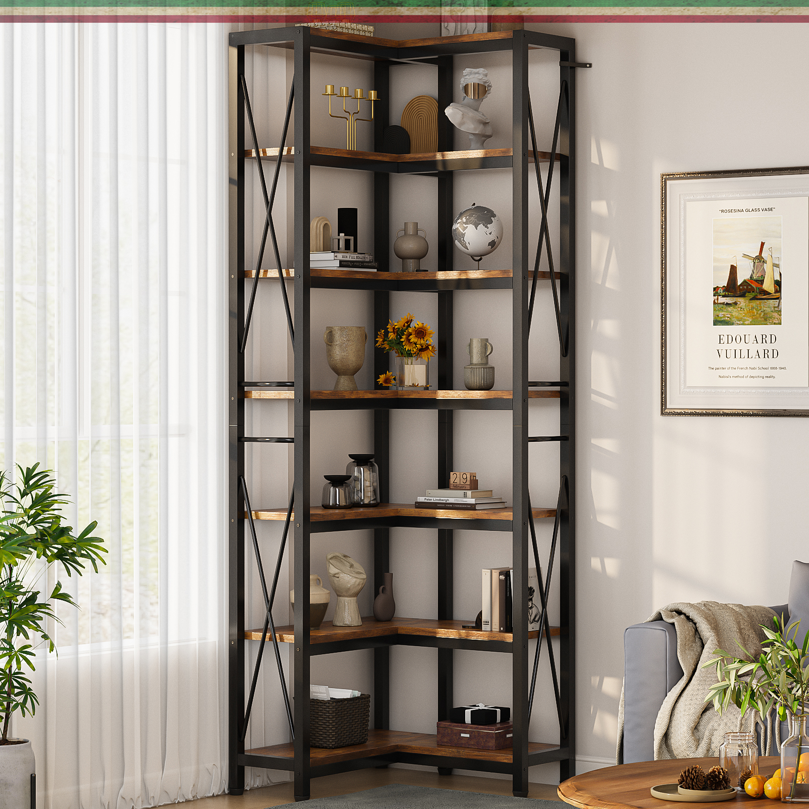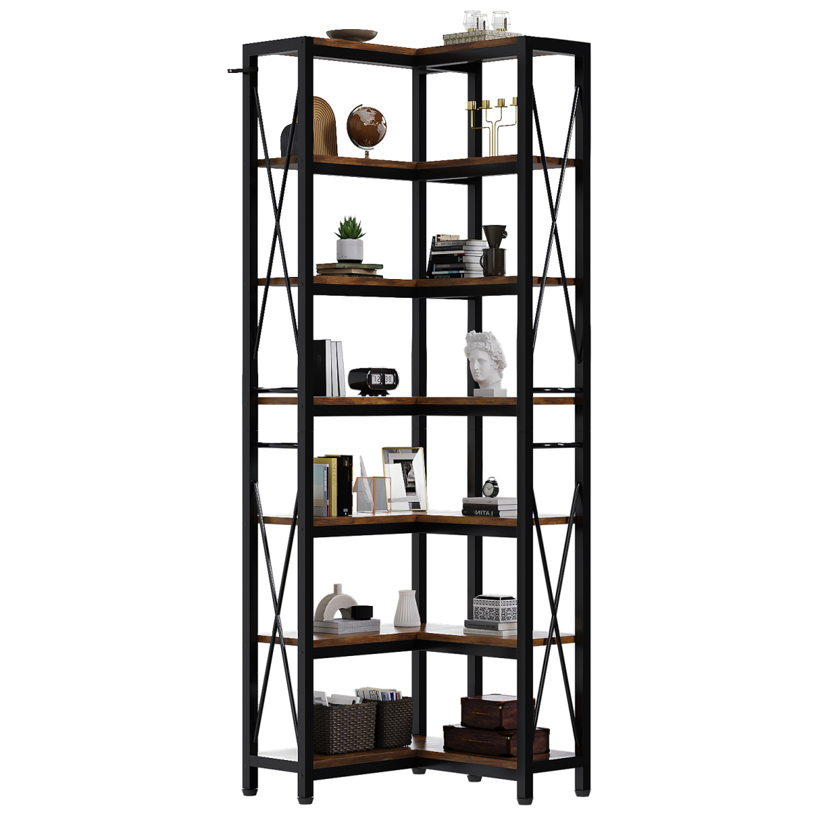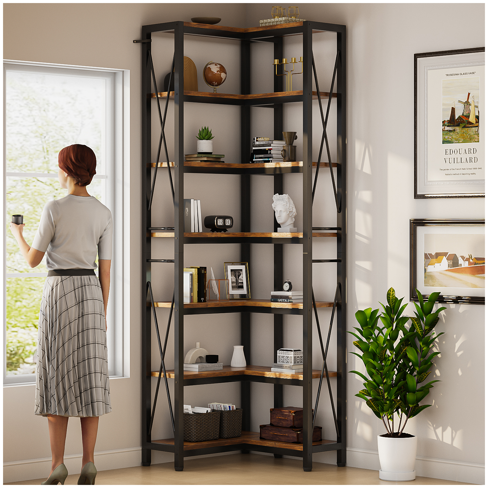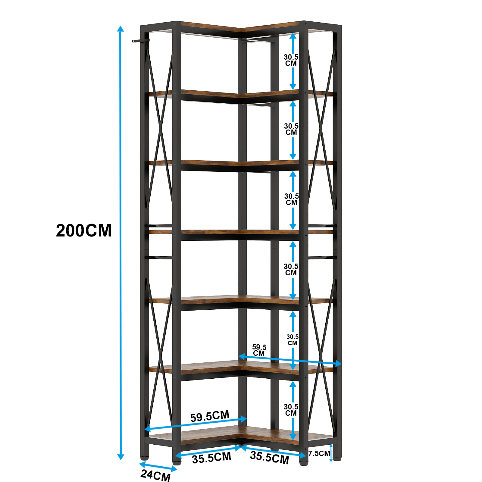 7 Tier Corner Bookshelf, Tall Corner Bookcase Strage, Large L-Shaped Bookshelf Organizer With Metal Frame & Wooden Shelves, Reversible Display Book Shelf Rack For Bedroom, Living Room, Office