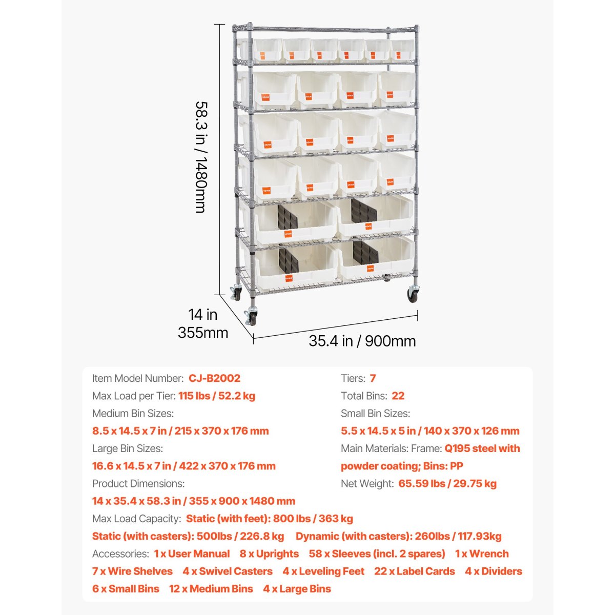 Modular Storage: This 7-tier single-sided rolling bin rack includes 6 small, 12 medium, and 4 large PP bins. Each bin has a label slot, so you tag, sort, and find parts fast to keep your space tidy