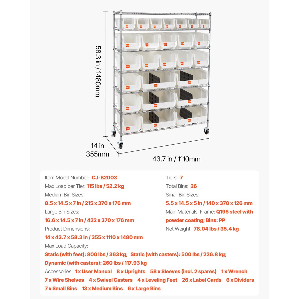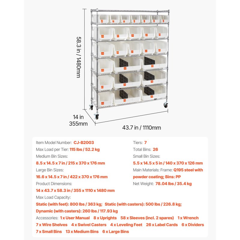 Modular Storage: This 7-tier single-sided rolling bin rack includes 7 small, 13 medium, and 6 large PP bins. Each bin has a label slot, so you tag, sort, and find parts fast to keep your space tidy