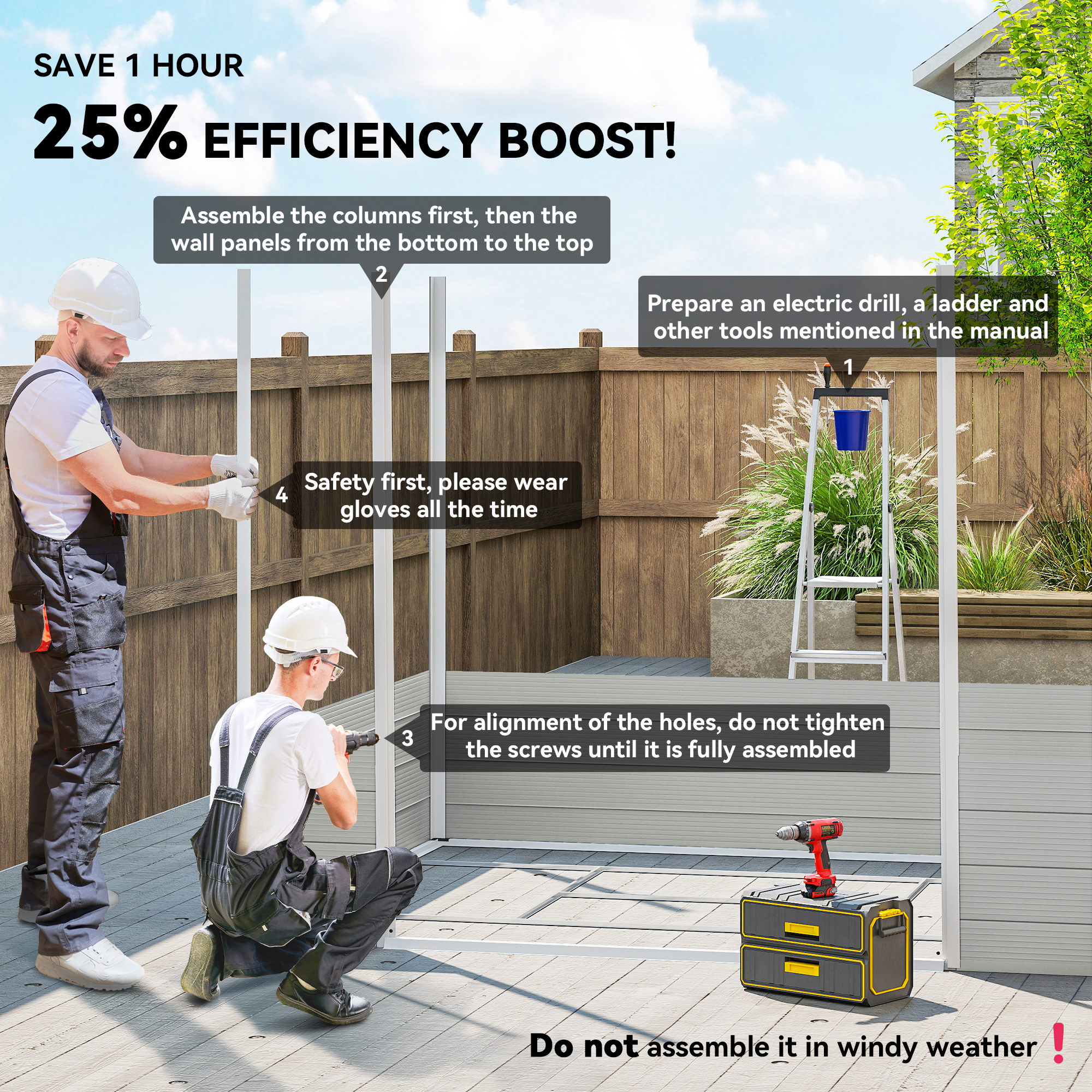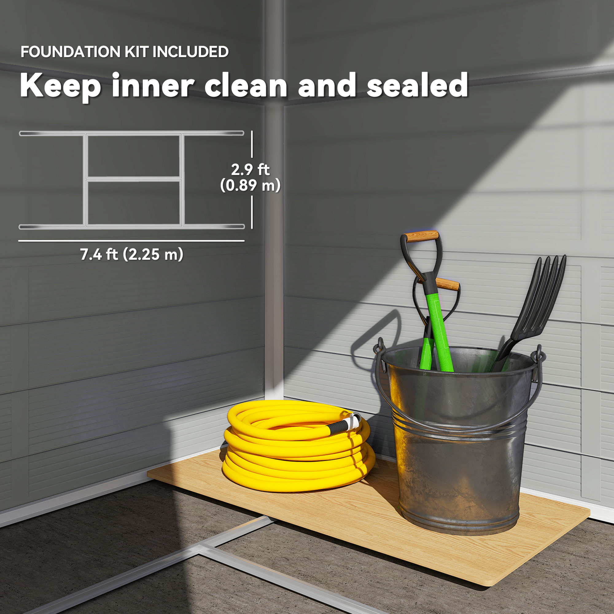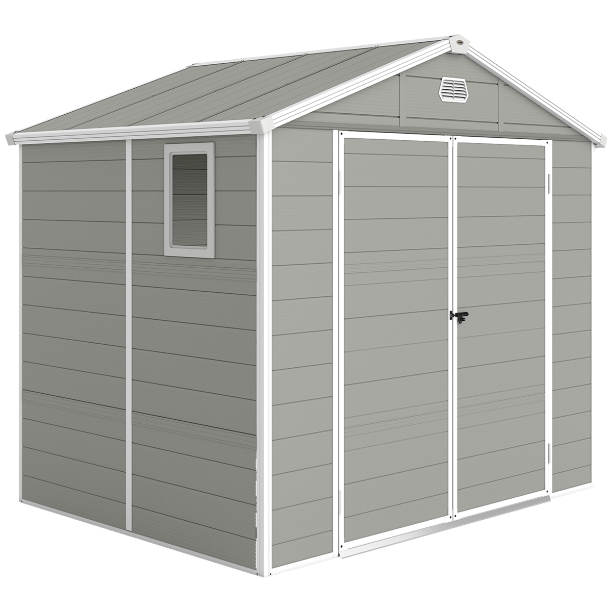 Secure your garden tools and outdoor essentials in the 8 x 6ft garden tool shed, featuring a robust aluminium frame and lasting plastic walls designed for external use. This lockable garden shed ensures safety and includes two air vents and a window for ventilation and light. A foundation is provided for stable positioning.