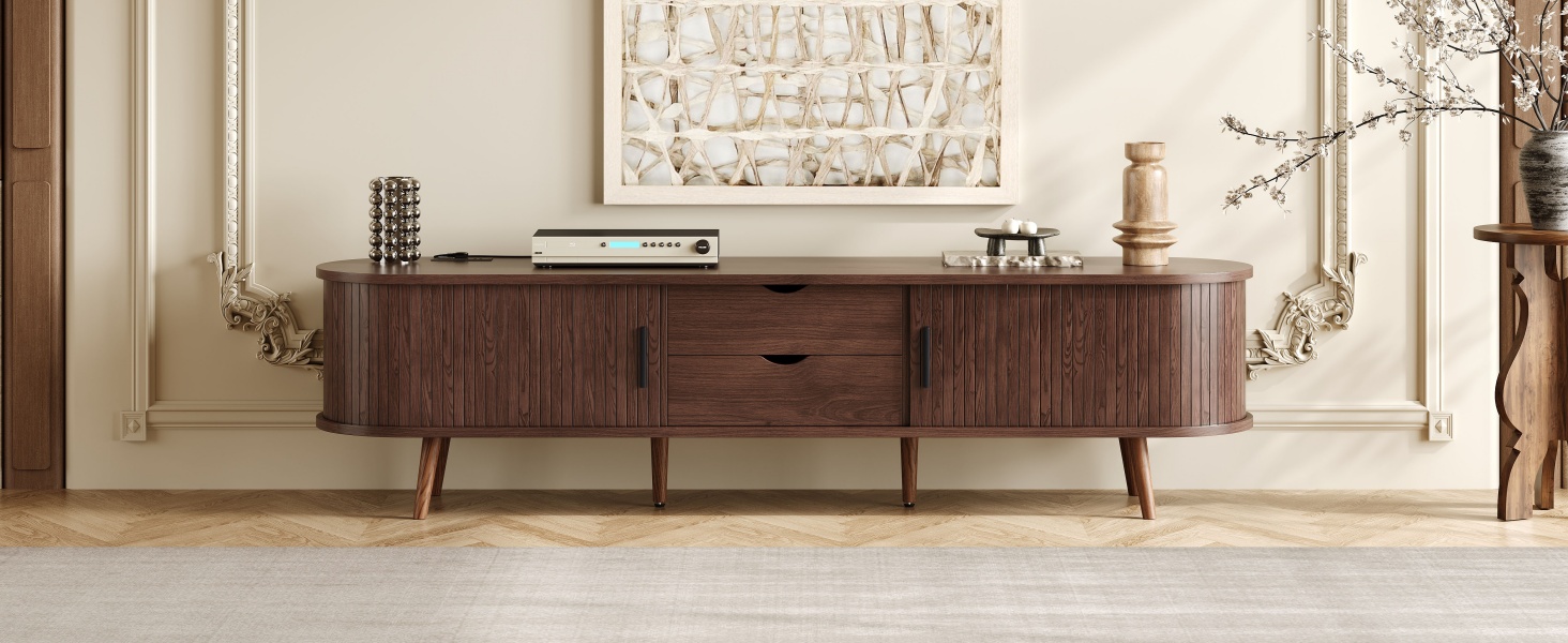 Product Name:70 Inch Mid Century Modern TV Stand, TV Stand for 80 Inch TV, TV Stand with Tambour Doors, Drawers and Power Outlet, TV Consoles for Living Room, Bedroom